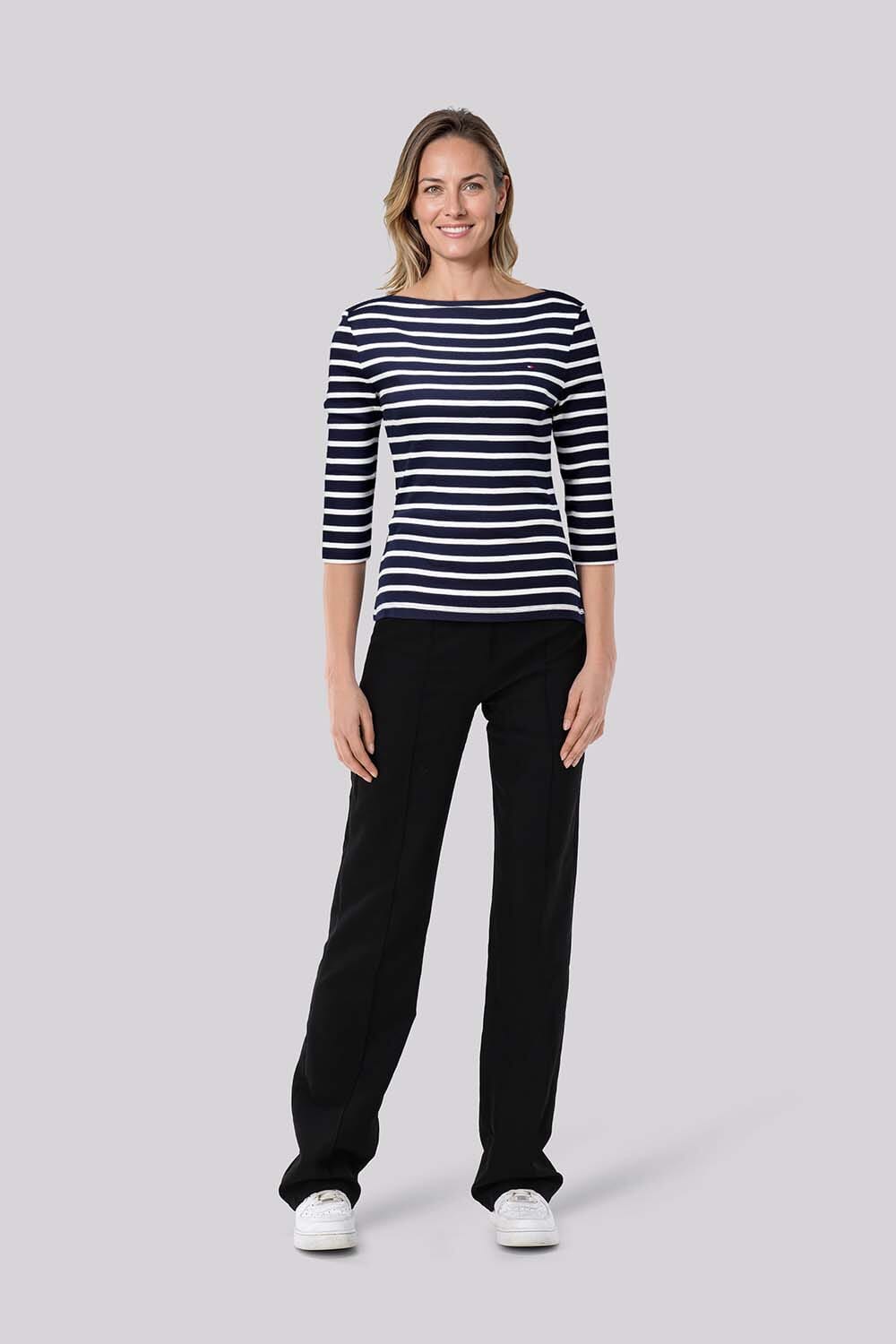 Het Tommy Hilfiger T-shirt heeft een casual stijl met een boothals en regular pasvorm. De 3 kwart mouwen en het streep patroon maken dit dames t-shirt perfect voor een modieuze, toegankelijke look. Ideaal voor diverse gelegenheden met een stijlvolle uitstraling.