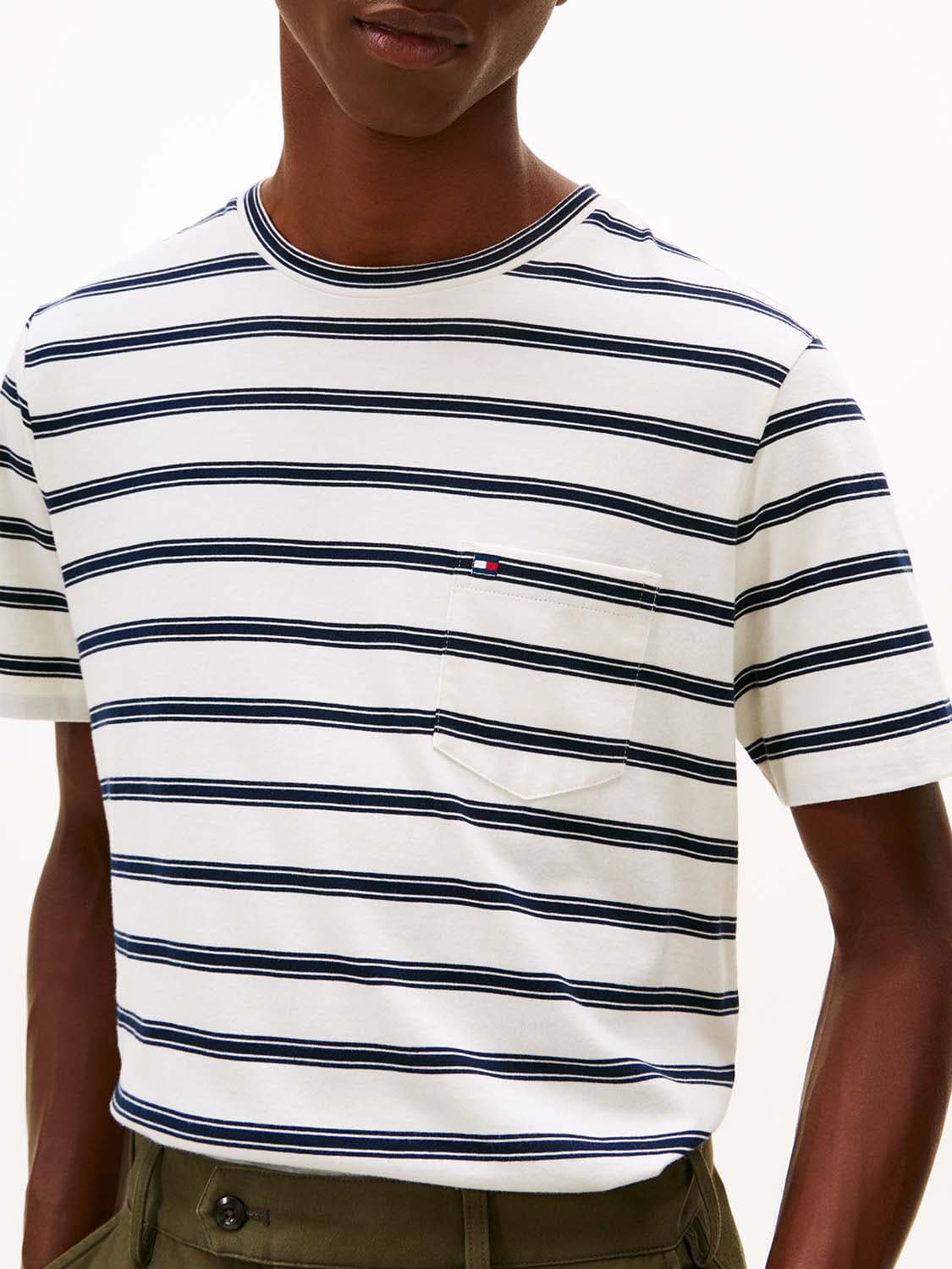 Het T-shirt Stripe Pocket regular fit van Tommy Hilfiger combineert casual stijl met een ronde hals en korte mouwen. Het gestreepte patroon voegt een speelse touch toe, terwijl het ontwerp geschikt is voor diverse gelegenheden. Perfect voor wie houdt van tijdloze mode en comfort.