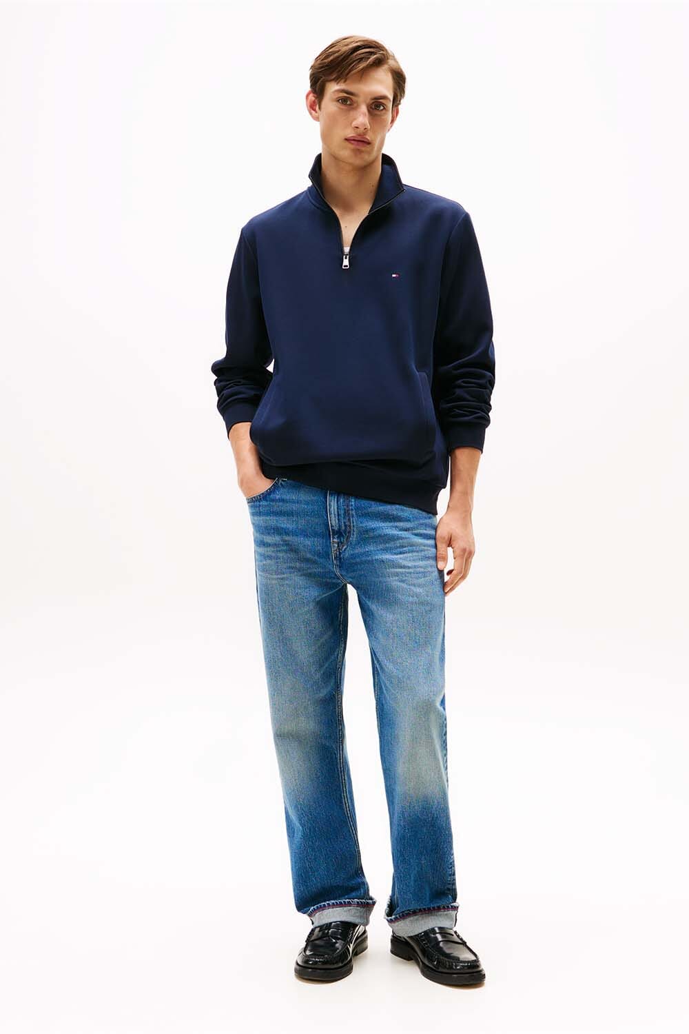 De Gebreide Zip-trui Essential Intechno van Tommy Hilfiger is een casual heren trui met opstaande kraag en ribgebreide mouwboorden. Voorzien van handige zakken en een ritssluiting, biedt deze effen trui een comfortabele pasvorm voor diverse gelegenheden.