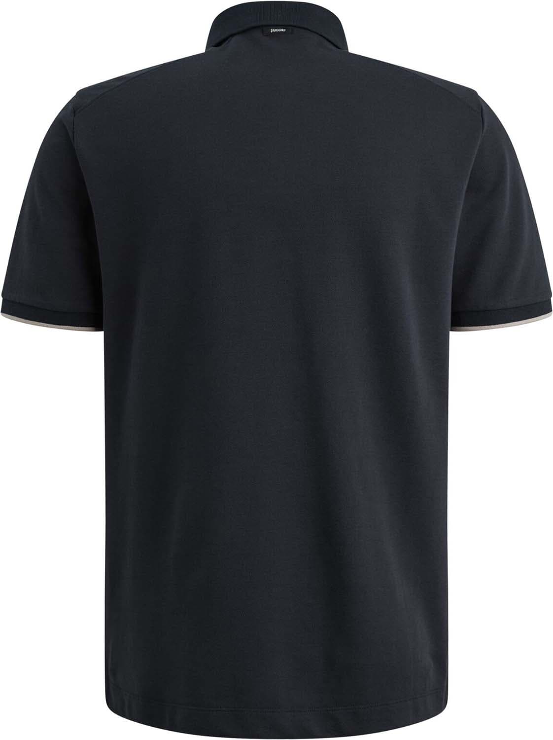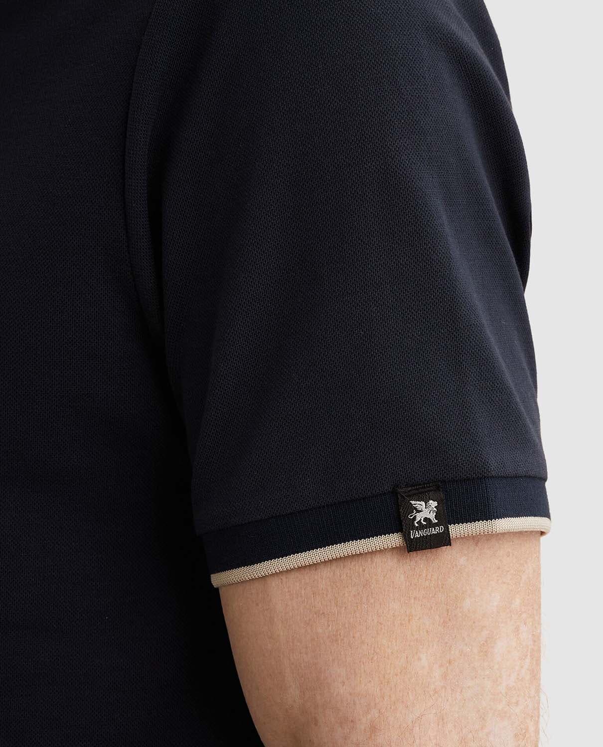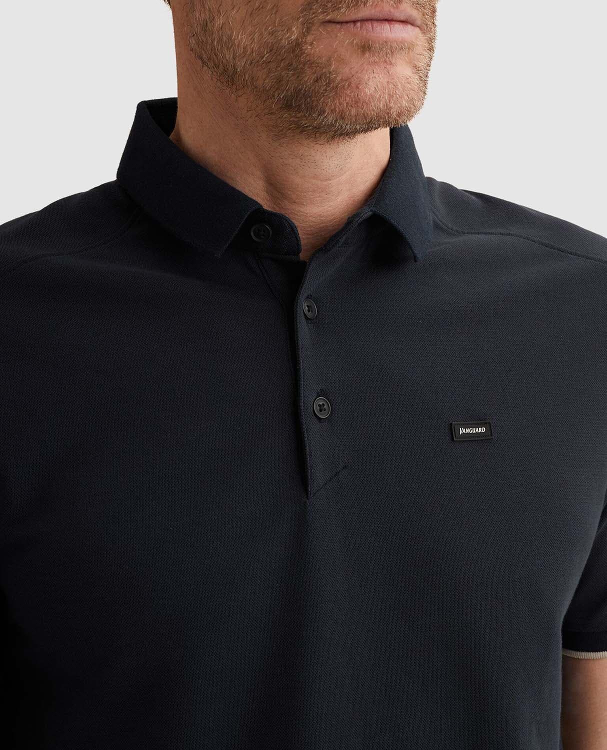 Polo Gent pique blend van Vanguard heeft een regular fit en een effen piquéstructuur. De spreidkraag en polokraag sluiten met knopen, korte mouwen hebben ribgebreide boorden met subtiel contrast en een logopatch. Draagt casual met jeans, netjes onder een jasje.