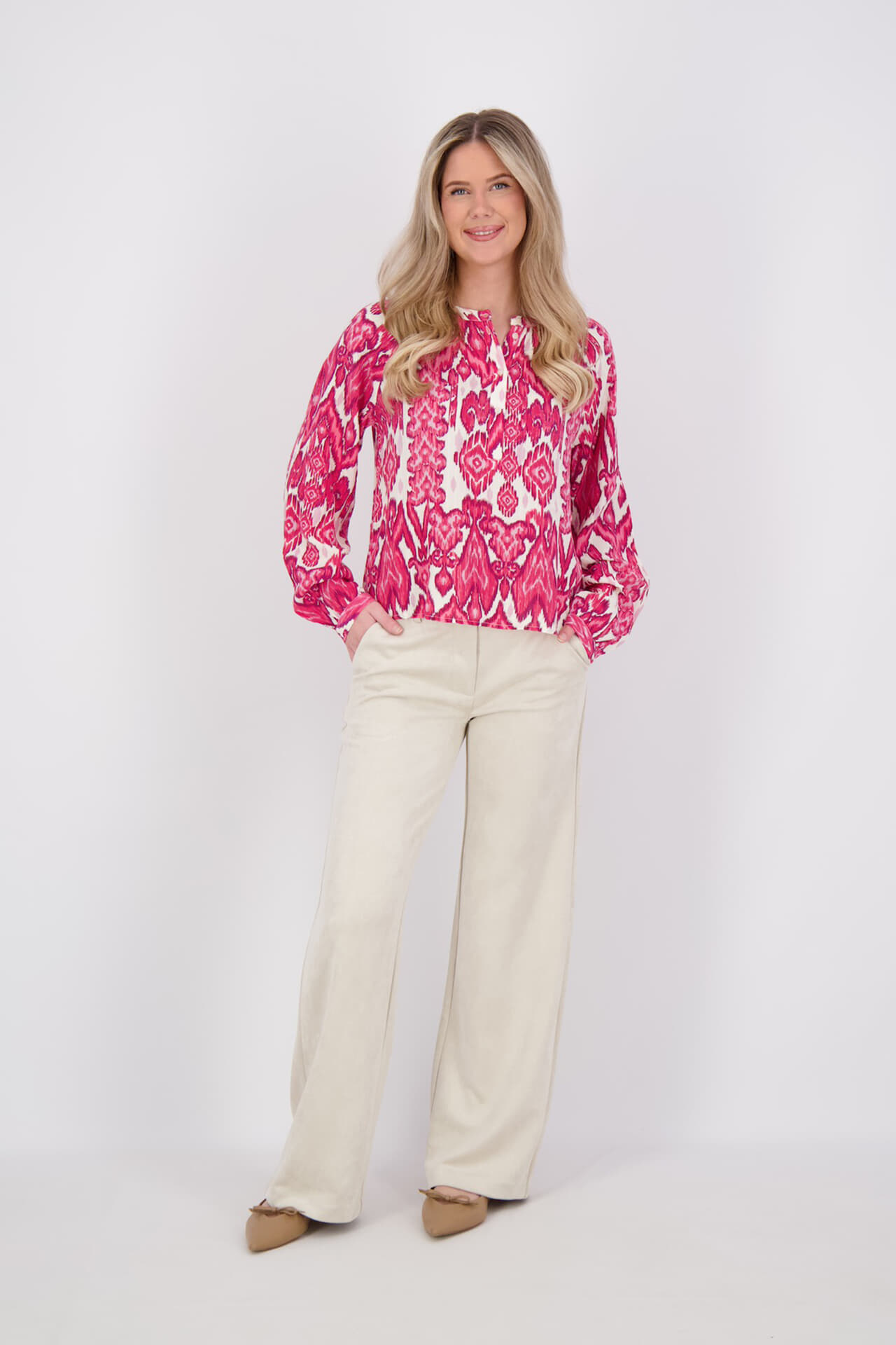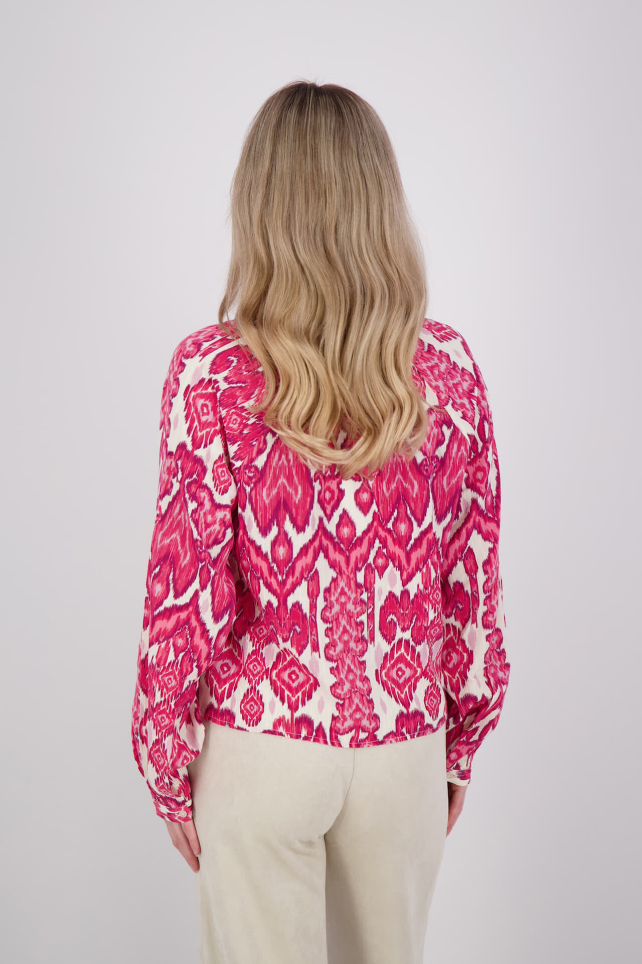 De Top Vibria Eva van Vila is een bohemian dames blouse met een opvallend grafisch patroon. Deze casual blouse heeft lange mouwen met knoopmanchetten, een ronde hals en een losse pasvorm. Ideaal voor een relaxte gelegenheid, met knoopsluiting voor extra comfort.