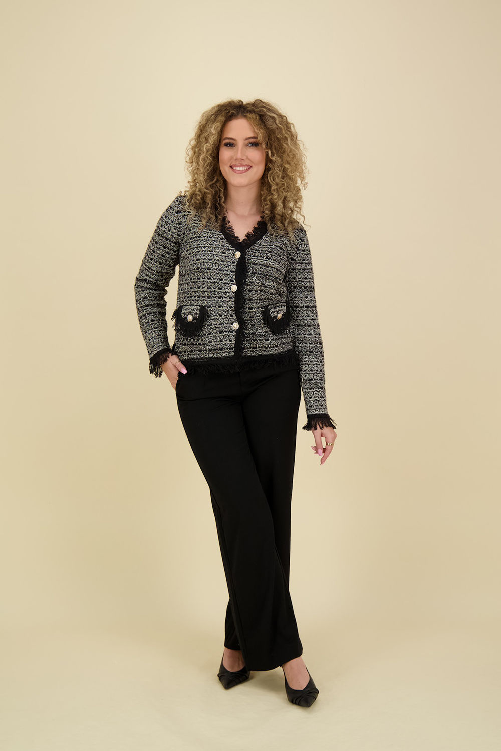 Het Vila Vest Solera in zwart is een elegant vest met franjes, perfect voor een stijlvolle look. Dit vest heeft lange mouwen, een knoopsluiting aan de voorkant, en een V-hals. De voorzakken en het zachte gebreide materiaal zorgen voor extra comfort. Met een regular fit is dit vest ideaal voor diverse gelegenheden.
