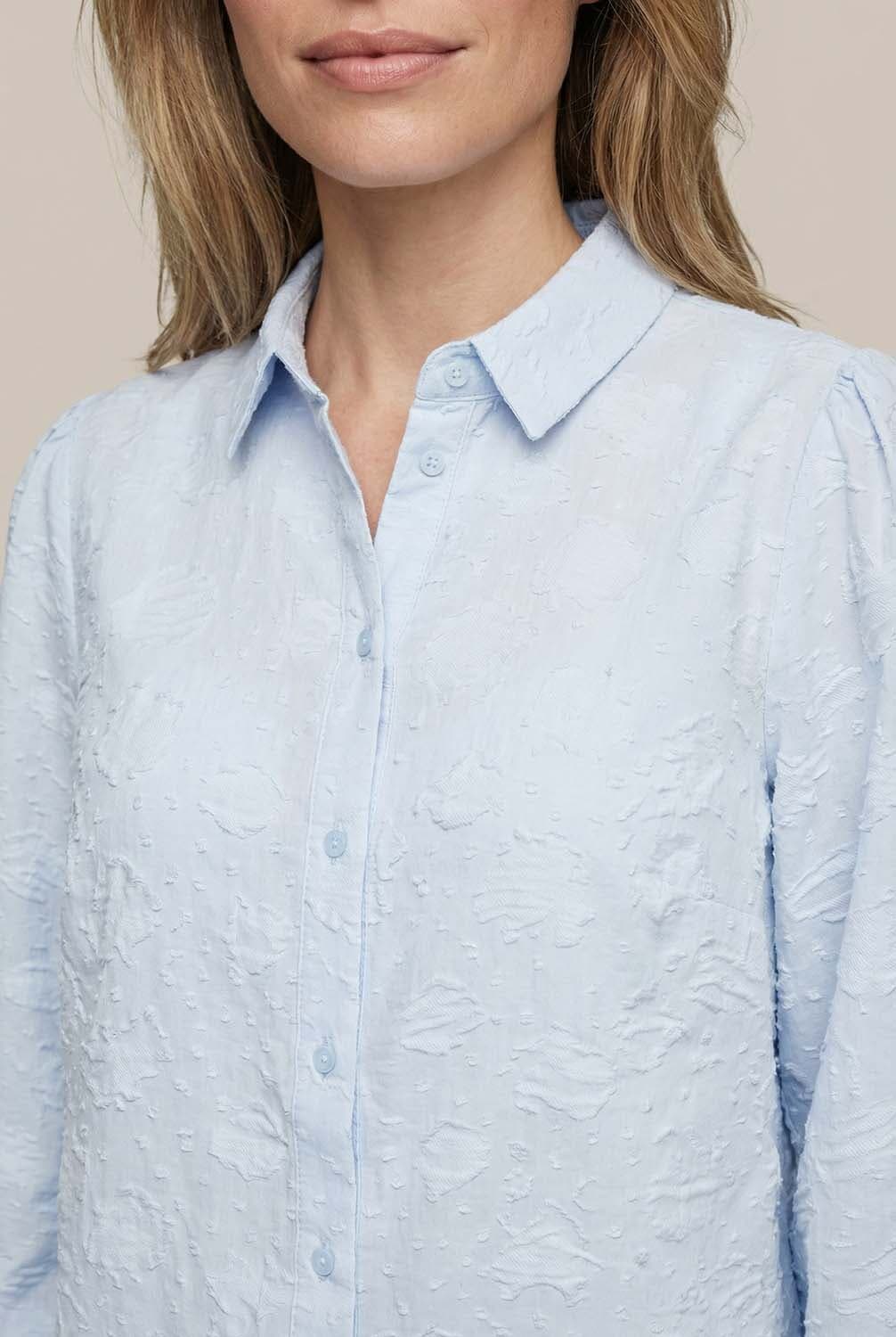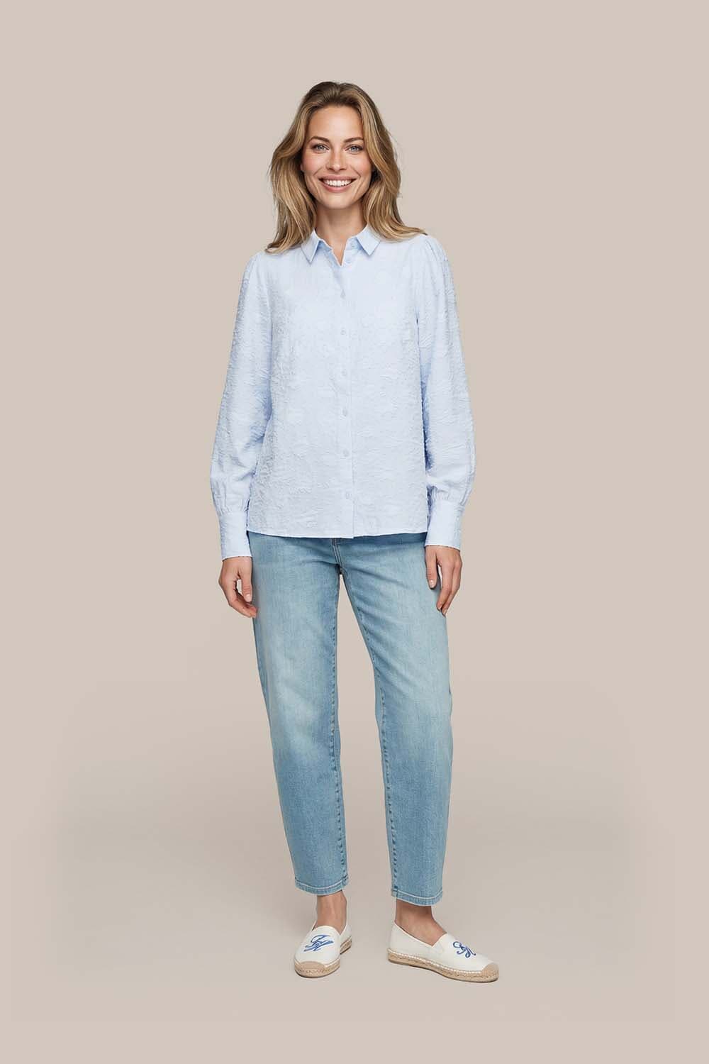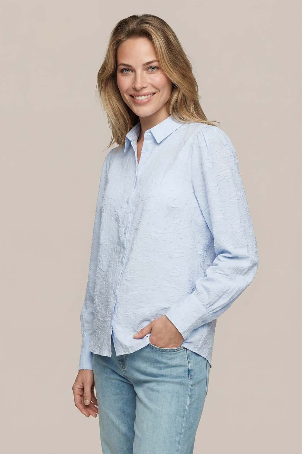De Blouse Arianne van Vive La Femme is een elegante dames blouse met een verfijnd all-over patroon en opstaande kraag. De lange mouwen eindigen in manchetten met knopen voor een nette uitstraling. Perfect voor zakelijke gelegenheden dankzij de regular pasvorm en de klassieke knoopsluiting.