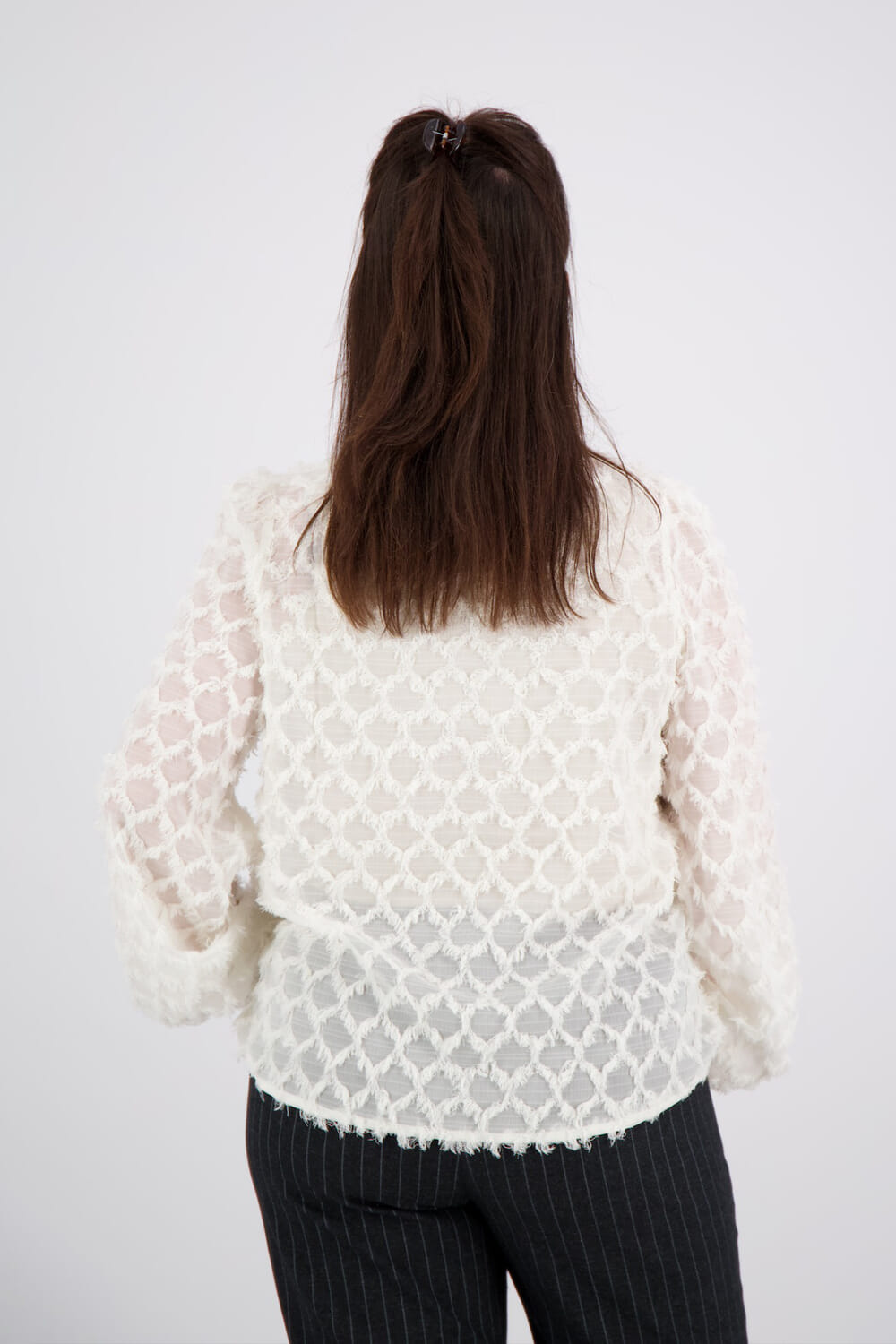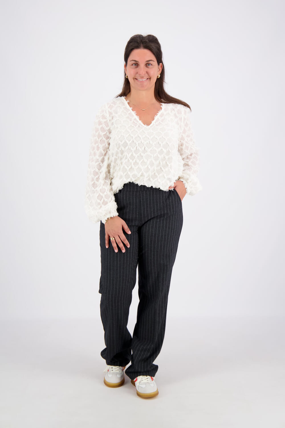 De Blouse Lara van Vive La Femme is een trendy blouse met een V-hals en lange mouwen. De losse pasvorm en het opvallende 3D-patroon maken het een stijlvolle keuze voor elke gelegenheid. Perfect voor een modieuze en comfortabele look.