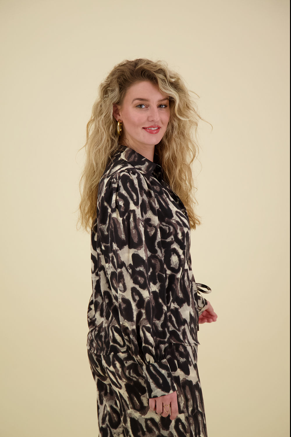 De Blouse Leo van Vive La Femme is een stijlvolle blouse met een opvallende panterprint. Deze casual blouse heeft een klassieke Kent kraag en sluit met knopen, terwijl de lange mouwen zorgen voor een elegante uitstraling. Perfect voor elke modieuze kledingkast.