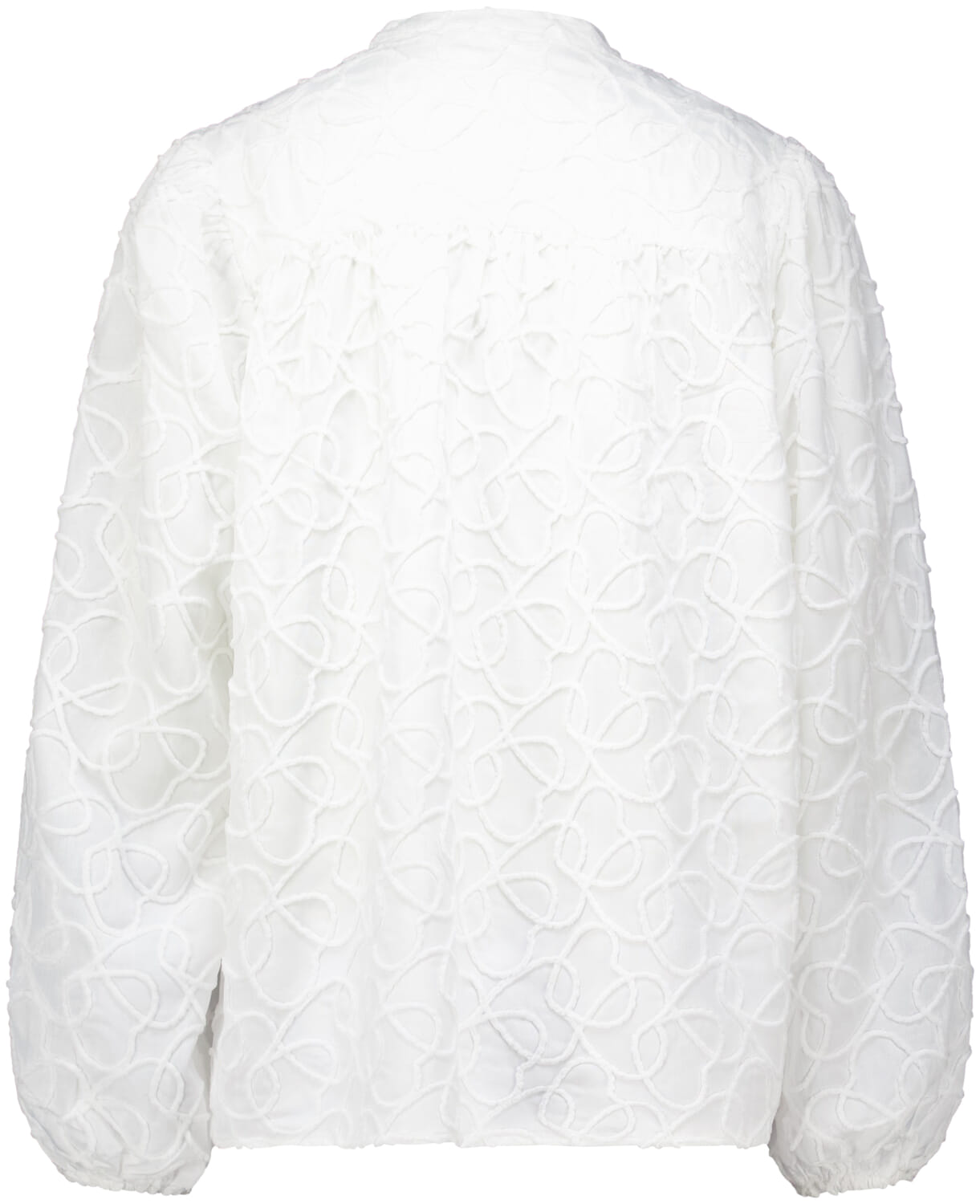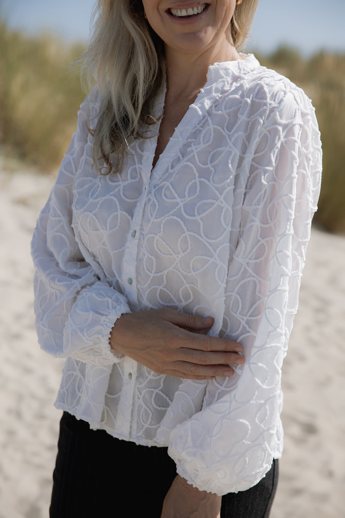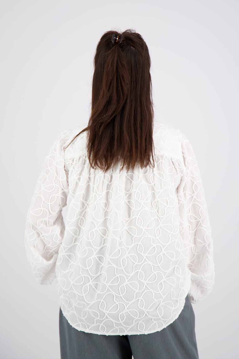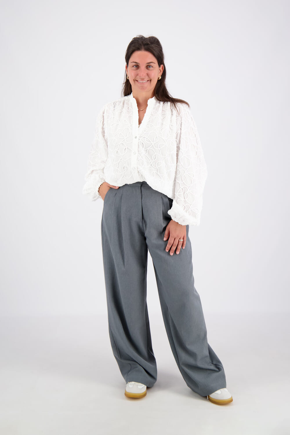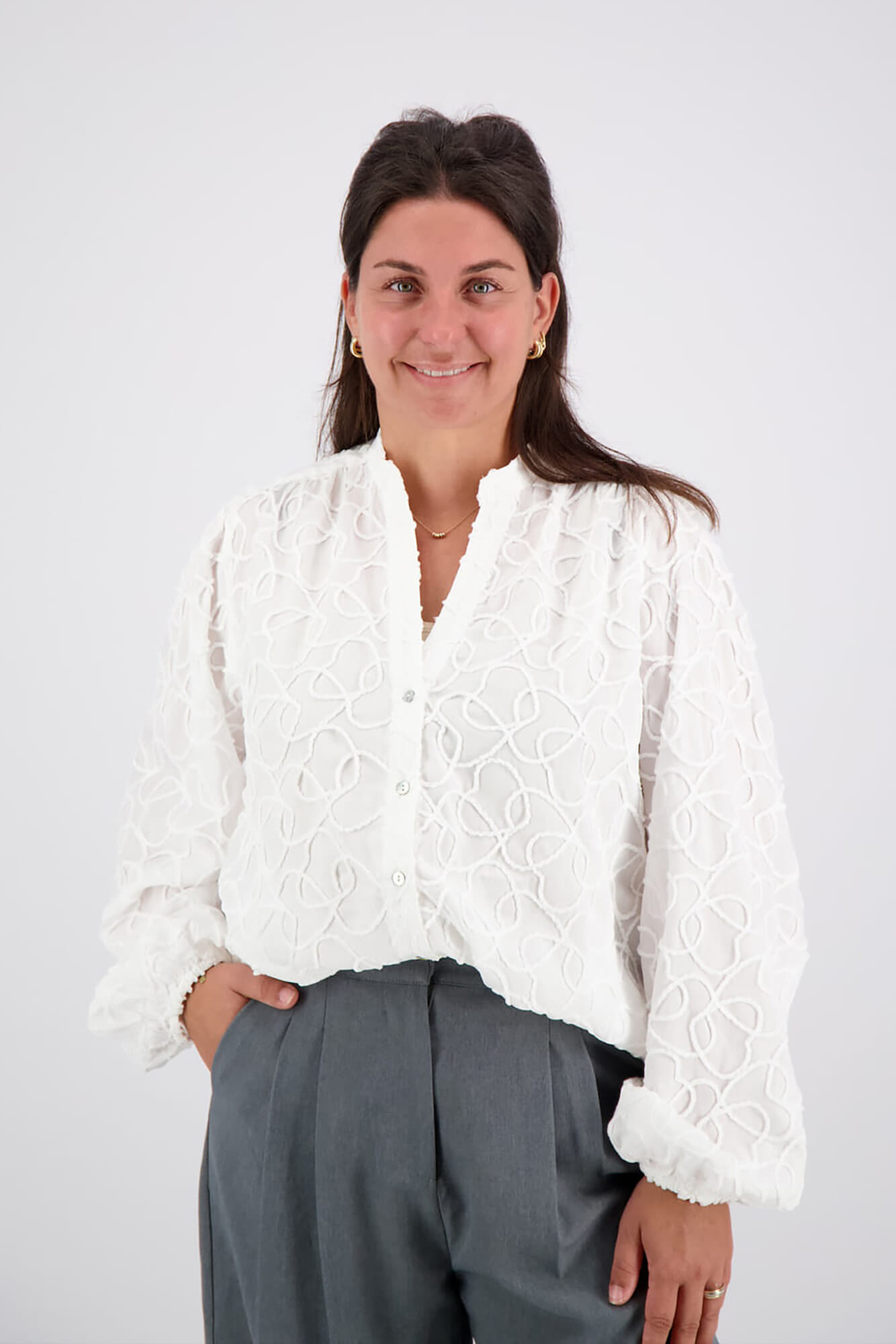Blouse Sophie van Vive La Femme is een stijlvolle blouse met een losse pasvorm en lange mouwen. De opstaande kraag en knoopsluiting maken het een veelzijdig kledingstuk, perfect voor casual gelegenheden. Het unieke gaatjespatroon voegt een elegante touch toe aan deze blouse.