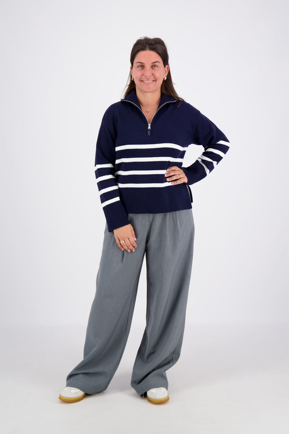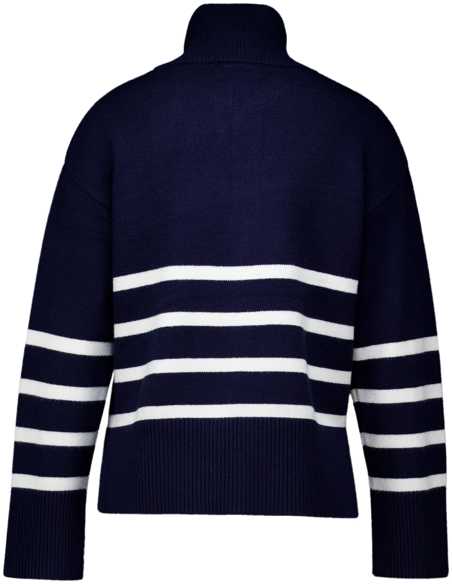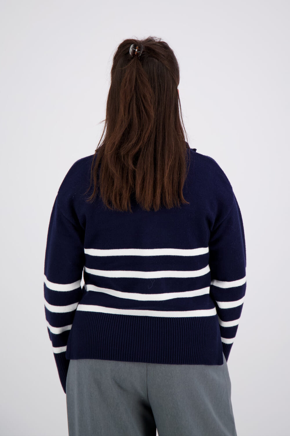 De gebreide trui Kim streep van Vive La Femme is een stijlvolle coltrui met een casual uitstraling. Deze trui heeft een opstaande kraag met rits en een ribgebreid mouwboord. De streepjespatroon en de lange mouwen maken het een ideale keuze voor elke gelegenheid.