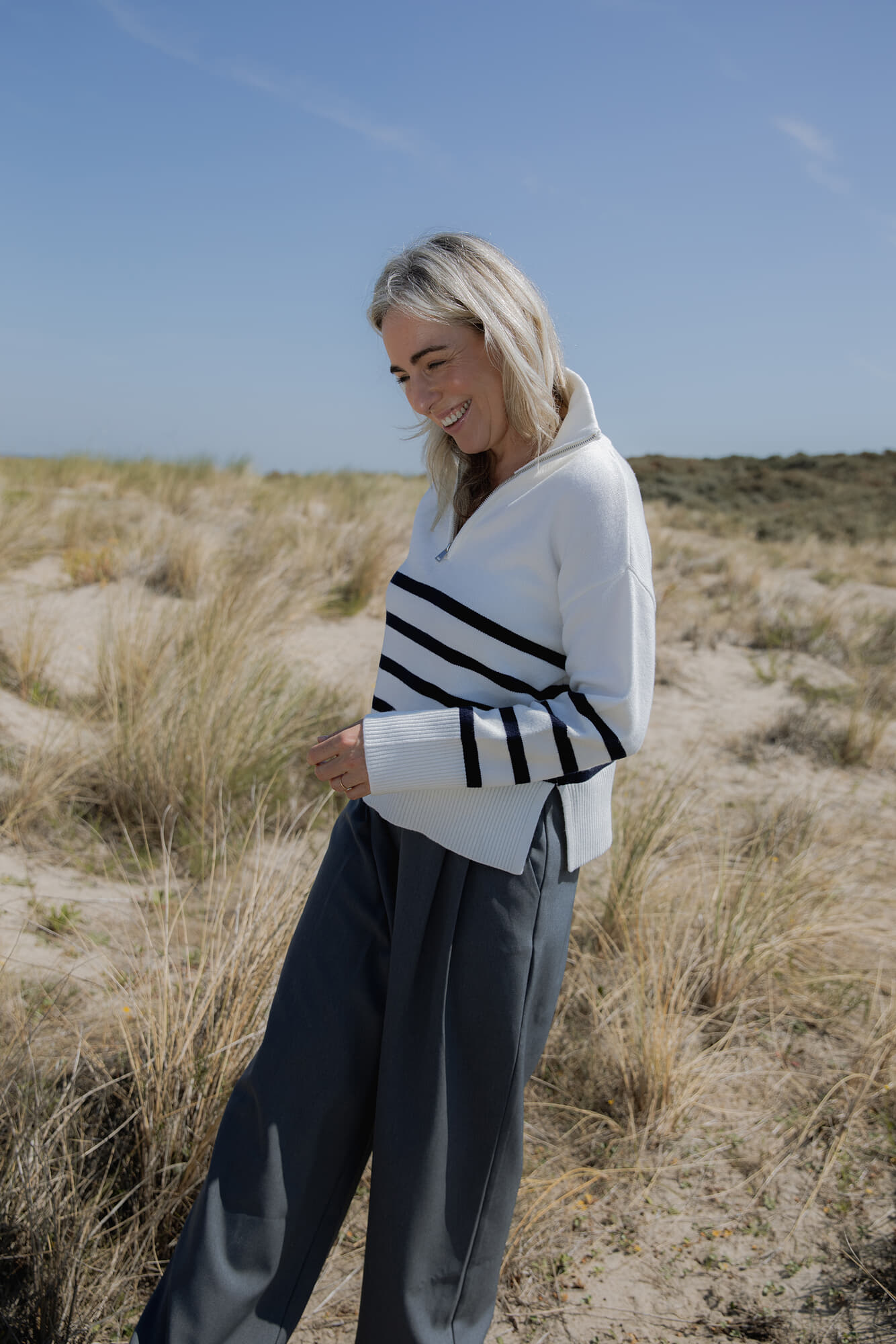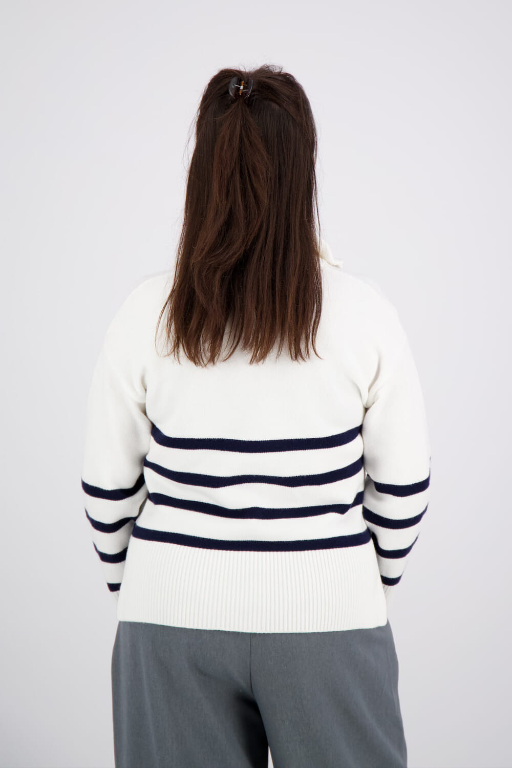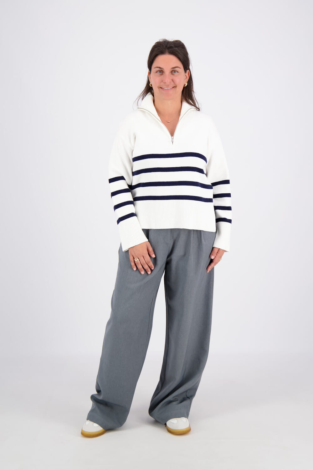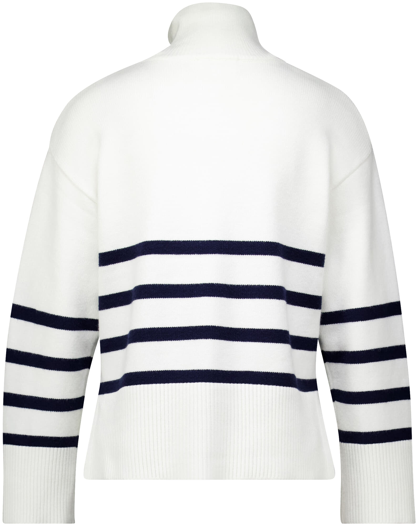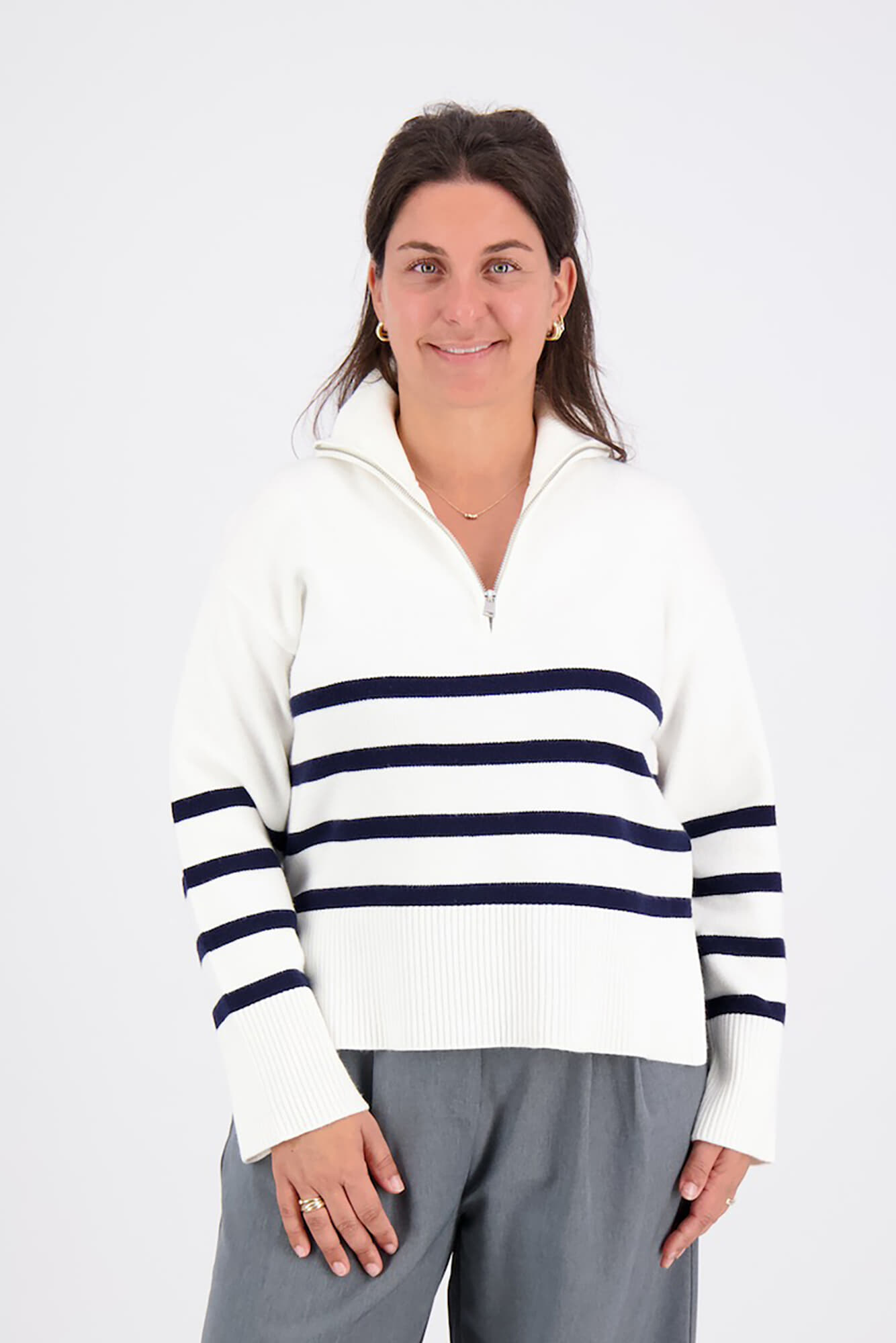 De gebreide trui Kim streep van Vive La Femme is een stijlvolle coltrui met een casual uitstraling. Deze trui heeft een opstaande kraag met rits en een ribgebreid mouwboord. De streepjespatroon en de lange mouwen maken het een ideale keuze voor elke gelegenheid.