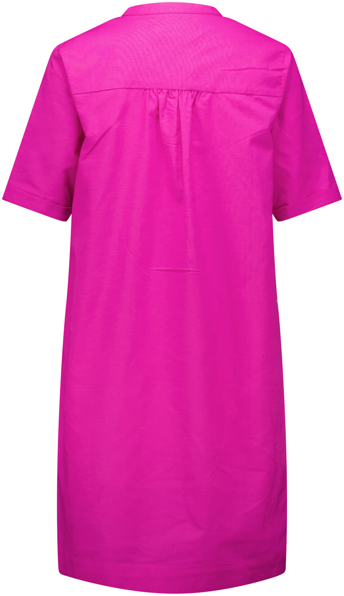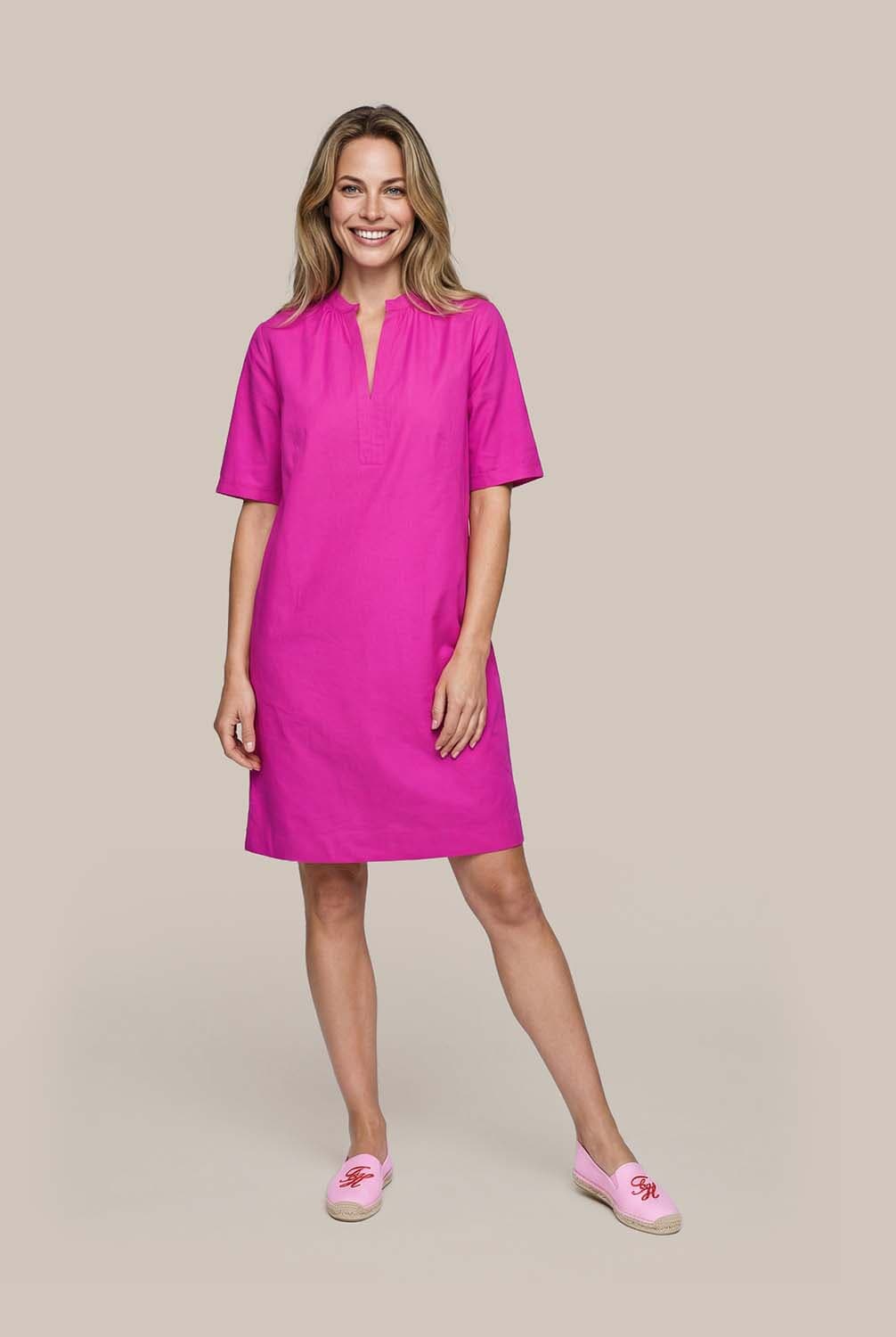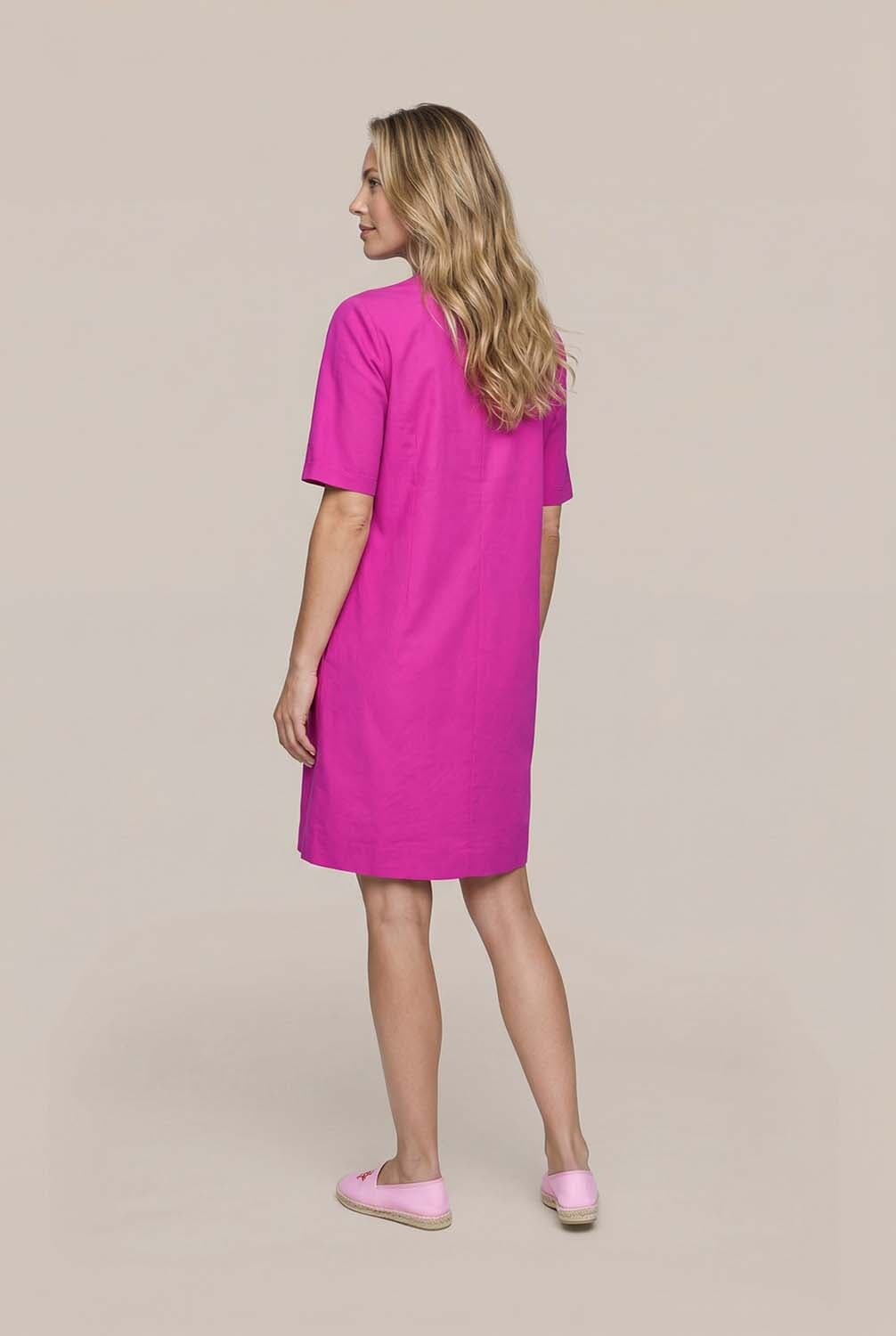 Jurk Bridget van Vive La Femme is een jurk korte mouw met casual, minimalistische uitstraling, effen fuchsiaroze kleur en midi lengte. De split hals met aanschuifsluiting geeft een nette afwerking, terwijl het rechte model met subtiele plooi op de rug en korte mouwen prettig draagt.