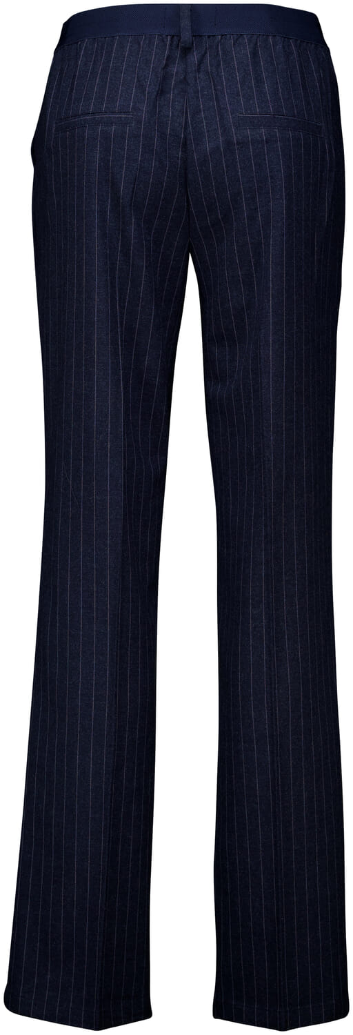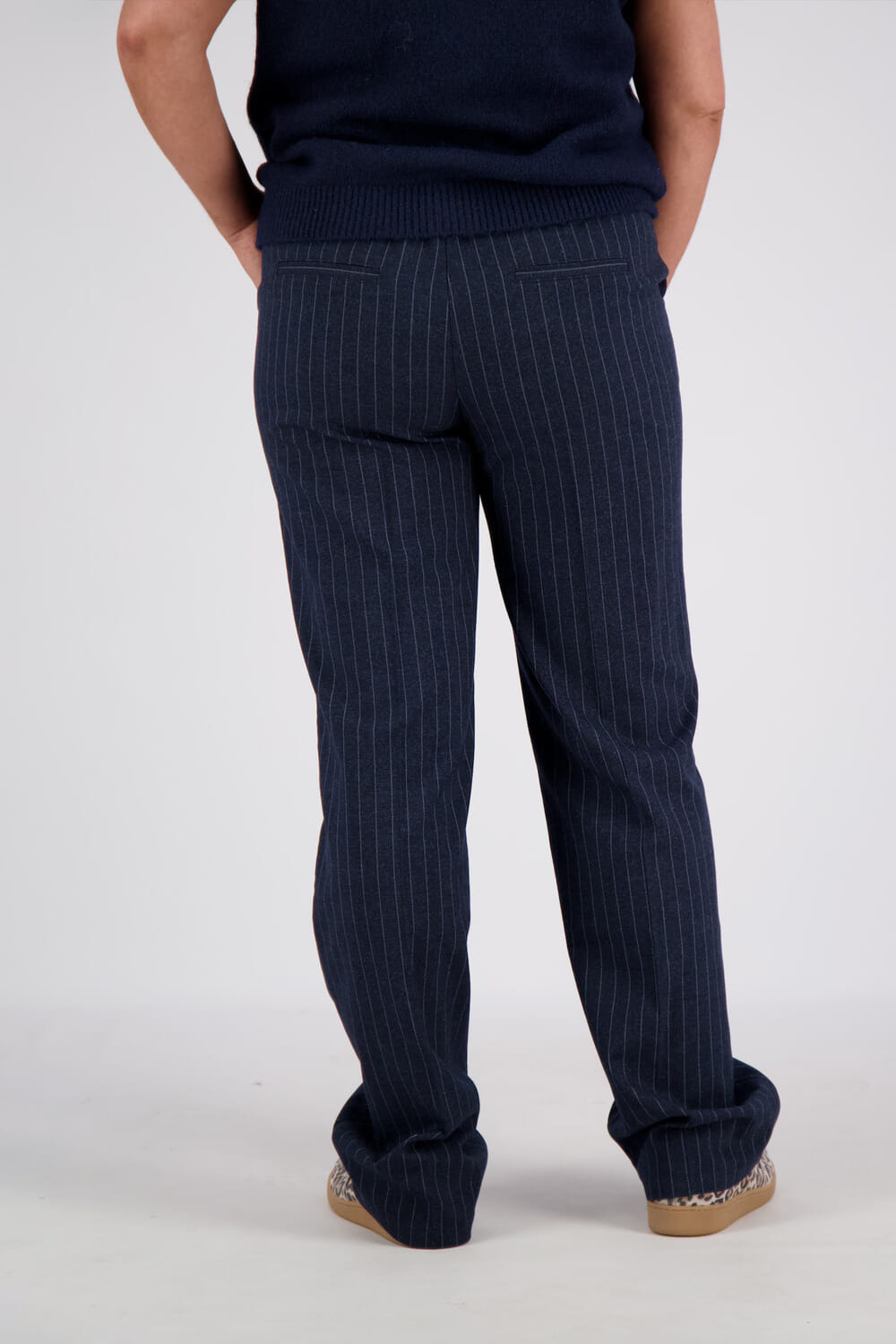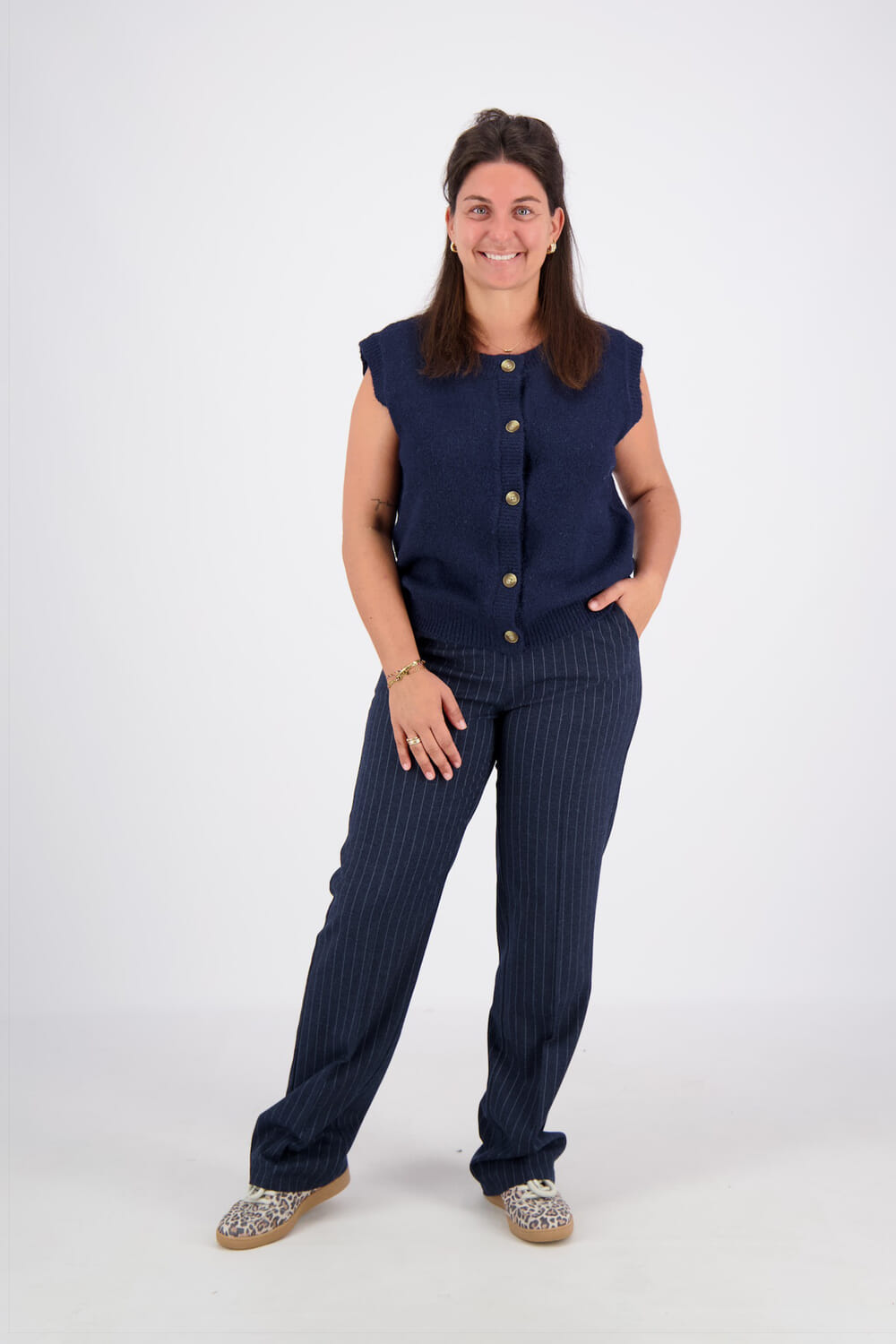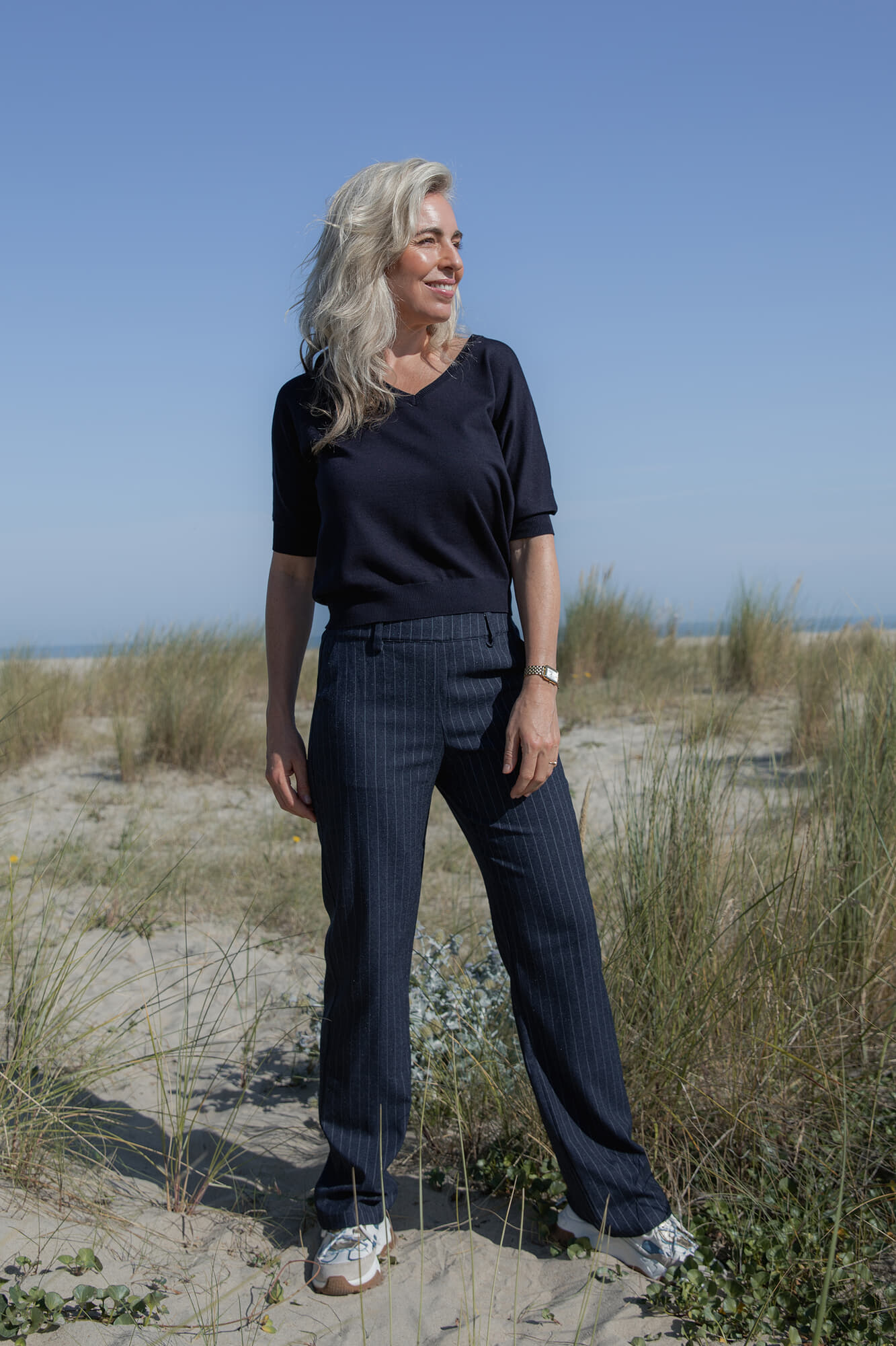 De Pantalon Loes van Vive La Femme is een elegante pantalon met een rechte pijp en een subtiel streeppatroon. Deze business-stijl pantalon heeft een normale taillehoogte en praktische zakken op de achterzijde, perfect voor een stijlvolle en comfortabele look.