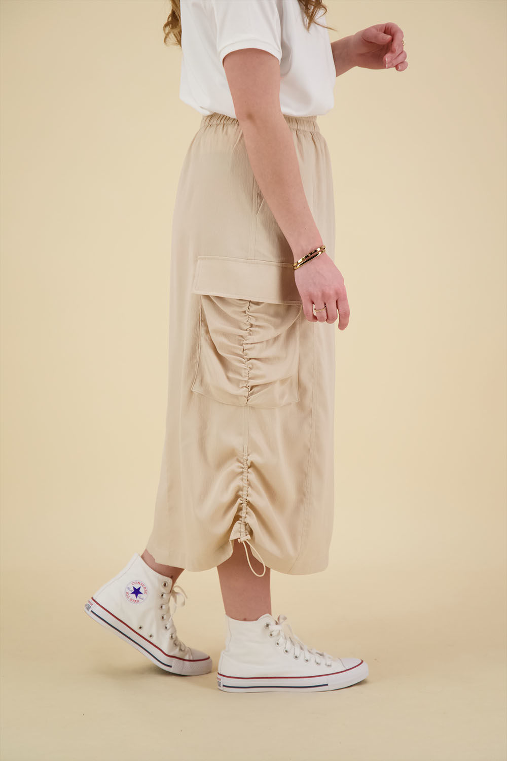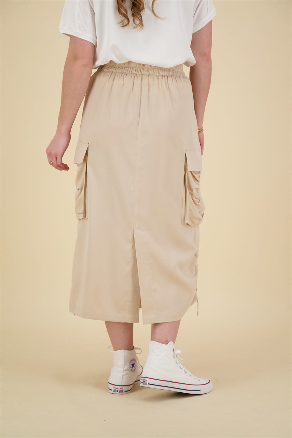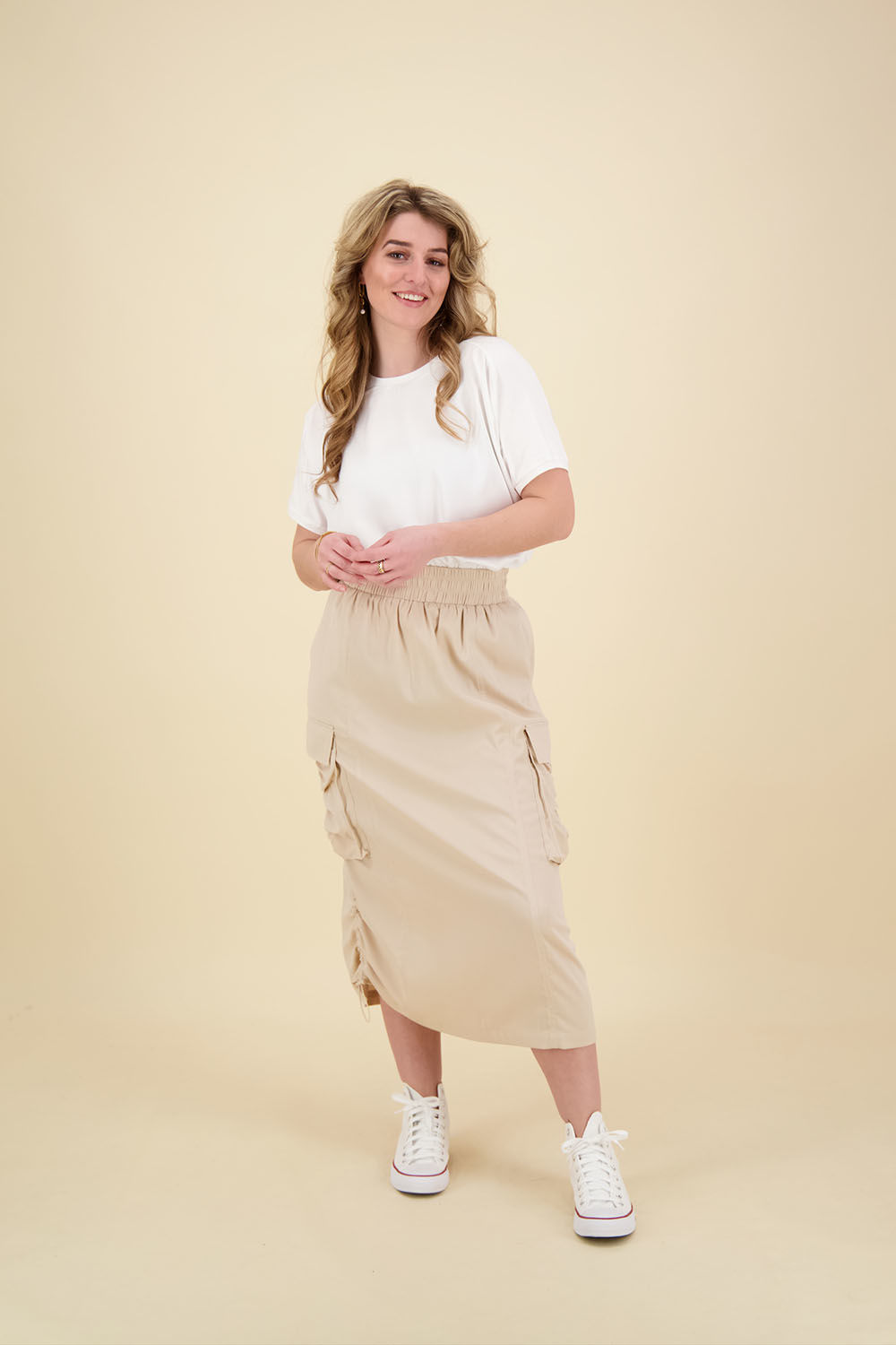 De rok van Vive La Femme combineert casual stijl met functionaliteit. Deze midi rok uit de dames rokken lang categorie heeft een elastische taille en handige cargo zakken, wat een praktische en stijlvolle keuze biedt voor dagelijks gebruik. Het effen patroon maakt het veelzijdig.