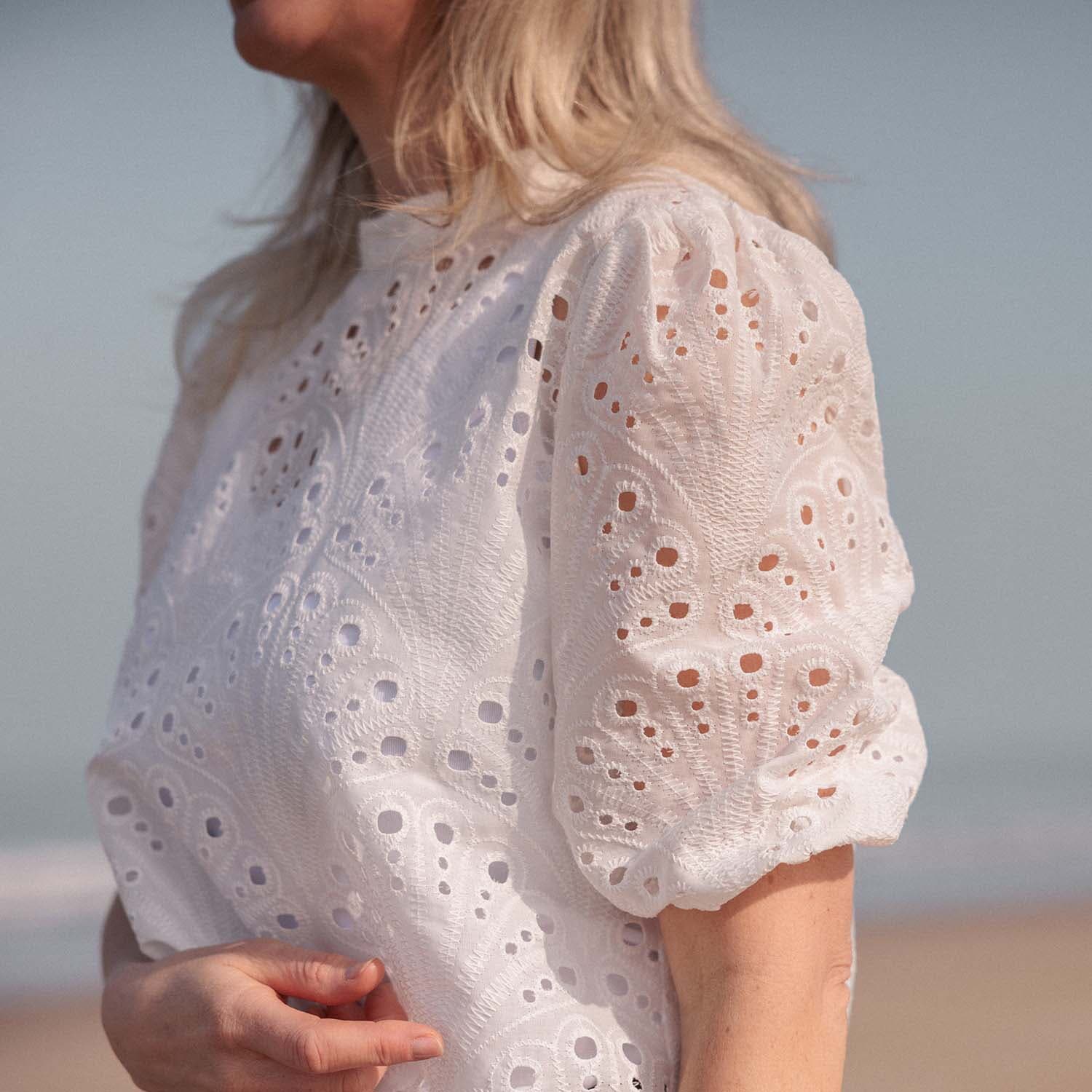 Top Aniek van Vive La Femme is een elegante top korte mouw met pofmouwen en elastische manchetten. Het unieke gaatjespatroon en de losse pasvorm maken het ideaal voor casual gelegenheden. De subtiele details zorgen voor een stijlvolle uitstraling die zowel comfortabel als modieus is.