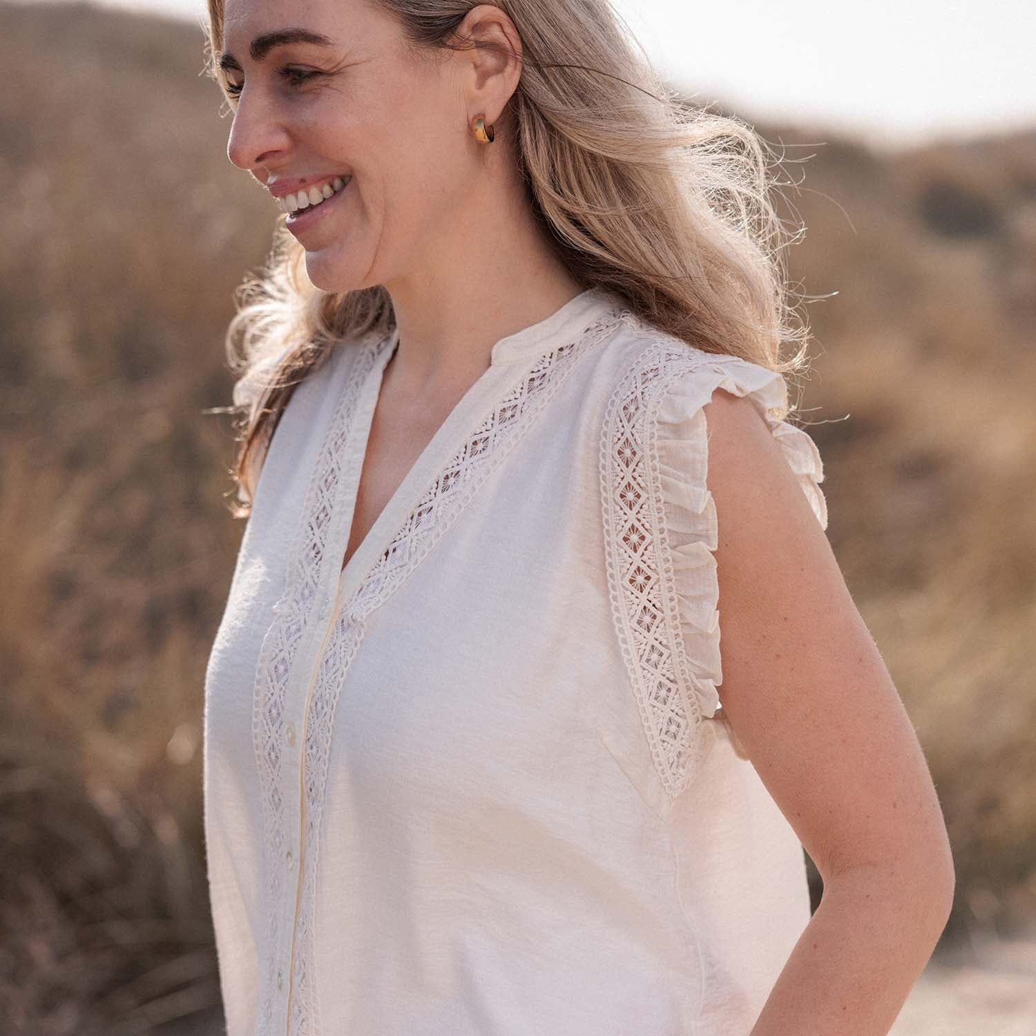 Top Bibi van Vive La Femme biedt een stijlvolle en vrouwelijke uitstraling. Deze dames top mouwloos heeft een opstaande kraag en V-hals, met prachtige ruches en een losse pasvorm. Ideaal voor casual gelegenheden, dit effen ontwerp straalt eenvoud en elegantie uit.