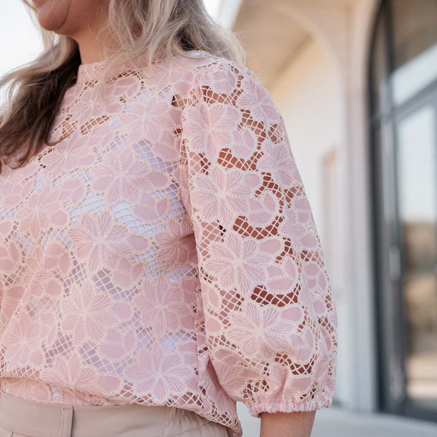 De Top Bo van Vive La Femme is een elegante dames top korte mouw met een vrouwelijke uitstraling. De top heeft pofmouwen, een opstaande kraag en een losse pasvorm. Het bloemen- en gaatjespatroon geeft een stijlvolle, casual touch aan elke gelegenheid.
