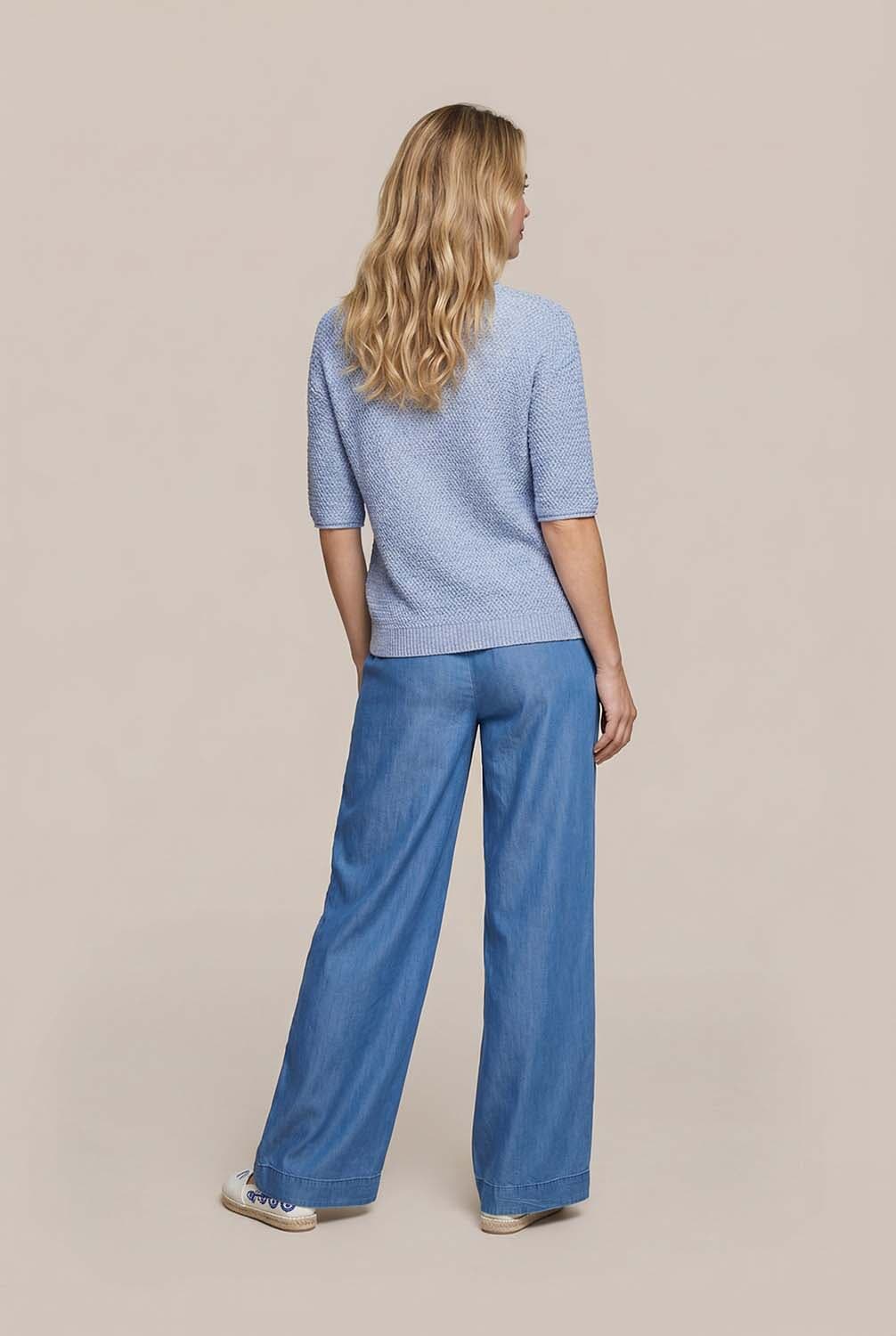Trui Annemijn van Vive La Femme is een stijlvolle toevoeging aan de collectie dames truien. Deze casual gebreide trui heeft een ronde halslijn en comfortabele pasvorm met een speels patroon. De korte mouw voegt een uniek element toe, perfect voor elke gelegenheid.