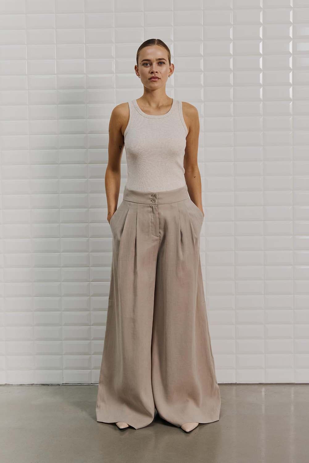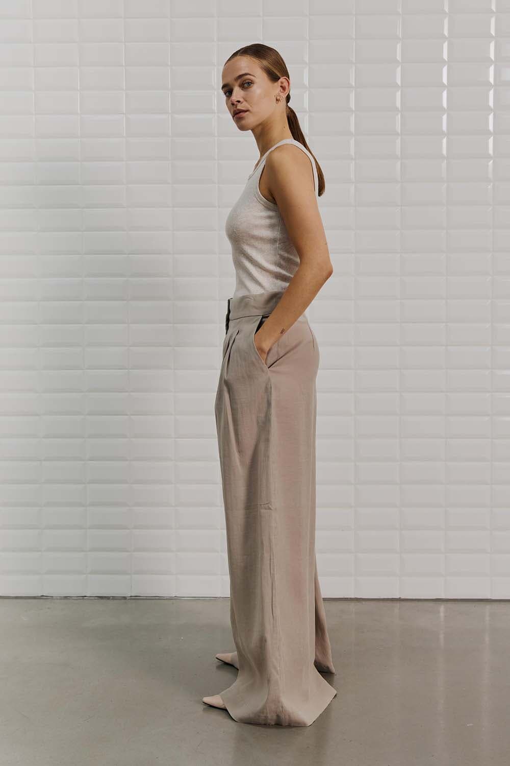 Pantalon Marleen Tailored Wide van With Black biedt een stijlvolle uitstraling met hoge taille en wijde pijpen. Voor- en achterzakken, gecombineerd met een knoop- en ritssluiting, maken deze pantalon perfect voor formele gelegenheden. De effen kleur en losse pasvorm zorgen voor comfort en elegantie.