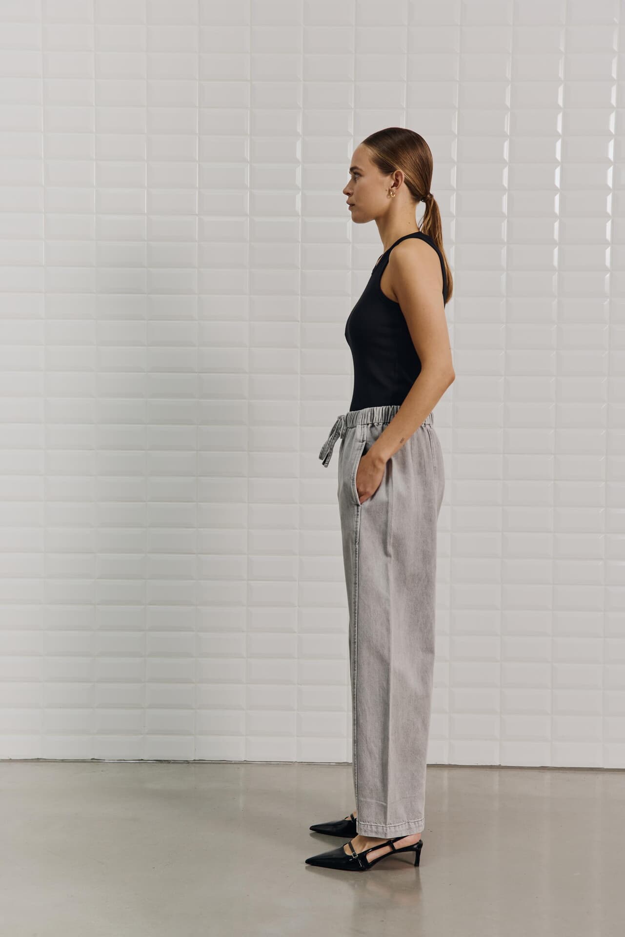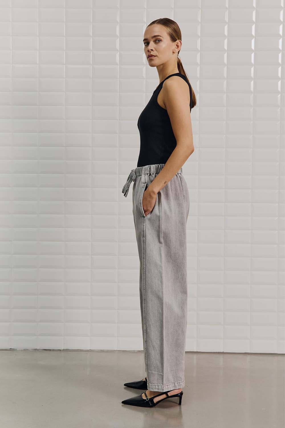 De Pantalon Penelope Wide Denim van With Black biedt een relaxte pasvorm met elastische taille en koordsluiting. Deze casual pantalon heeft voor- en achterzakken, en is uitgevoerd in een effen patroon. Ideaal voor een comfortabele en stijlvolle look.