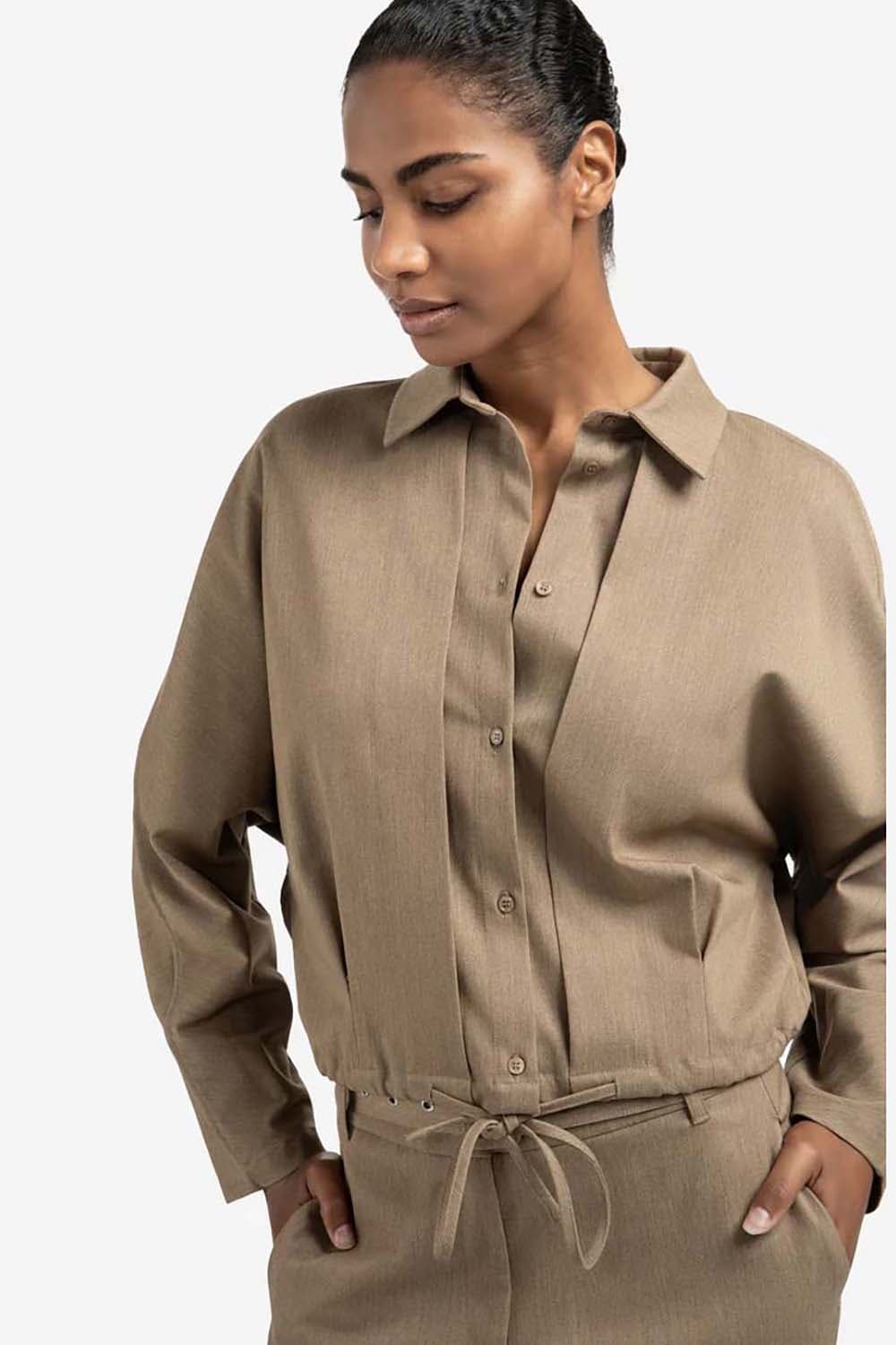 De blouse van Yaya combineert een elastische taille en overhemdkraag met lange mouwen voor een stijlvolle uitstraling. Met zowel voor- als achterzakken en een koordsluiting is het een veelzijdig kledingstuk. De effen stof maakt het geschikt voor elke gelegenheid, ideaal voor zakelijke stijl.