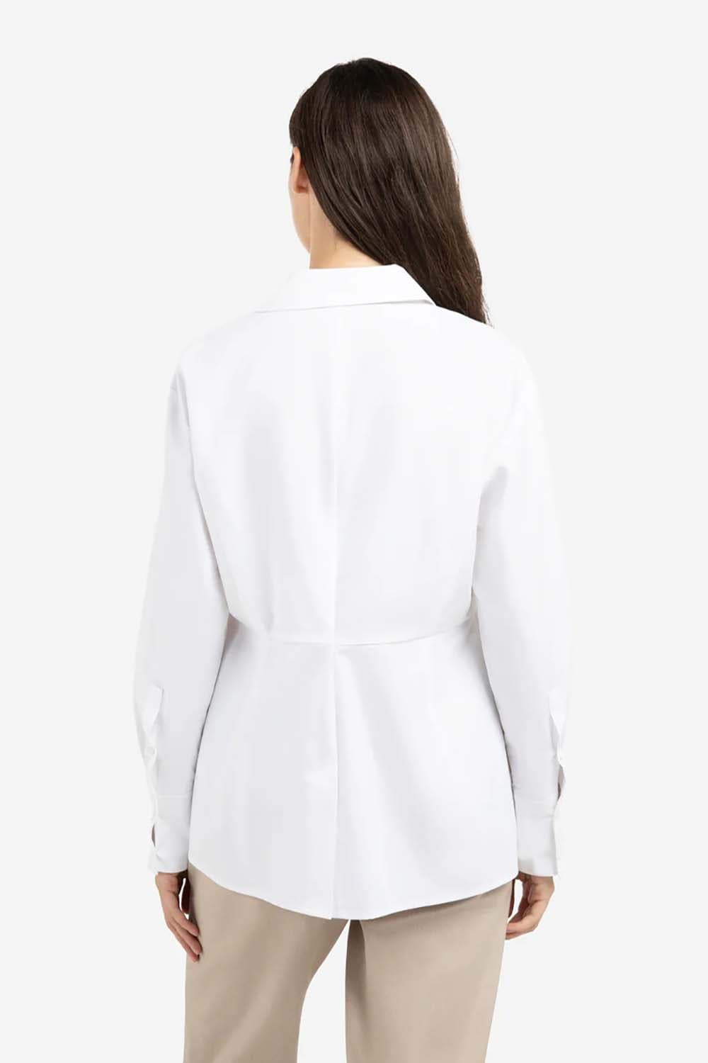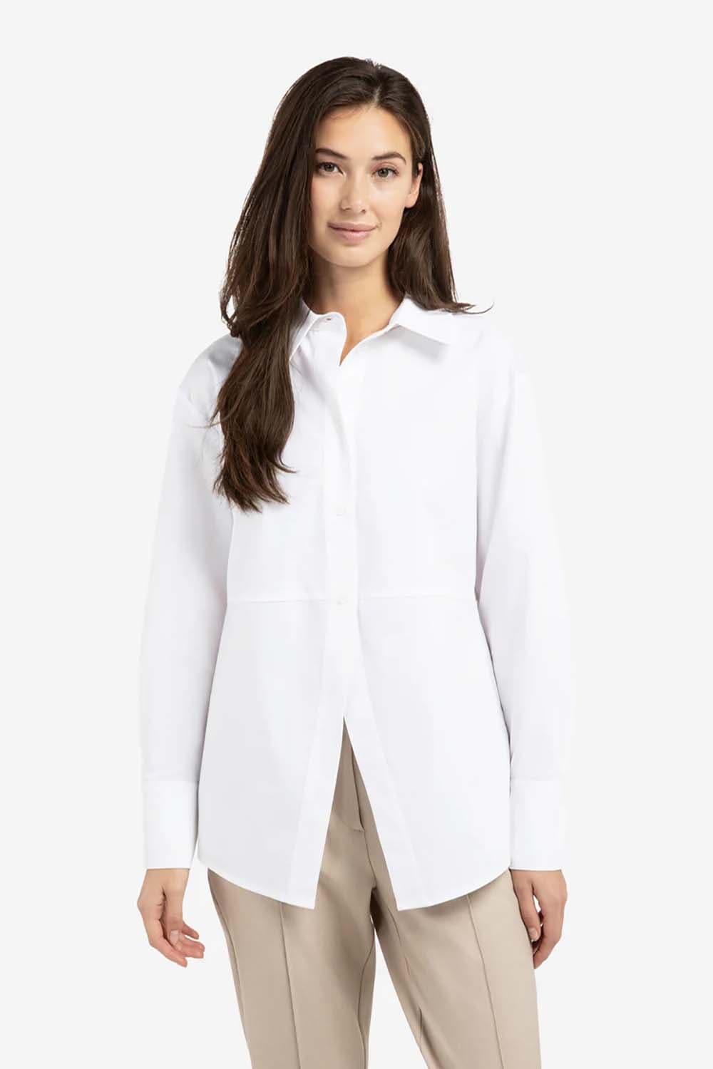 Deze elegante blouse is gemaakt van glad poplin en heeft een losse, vrouwelijke A-lijn pasvorm. De blouse is voorzien van een klassieke kraag, lange mouwen met manchetten en een opvallend splitdetail aan de voorkant. De verfijnde belijning op borsthoogte zorgt voor een modern silhouet. Een tijdloos item voor een stijlvolle en frisse look.