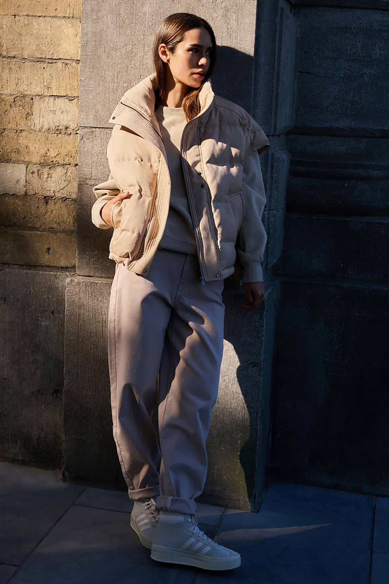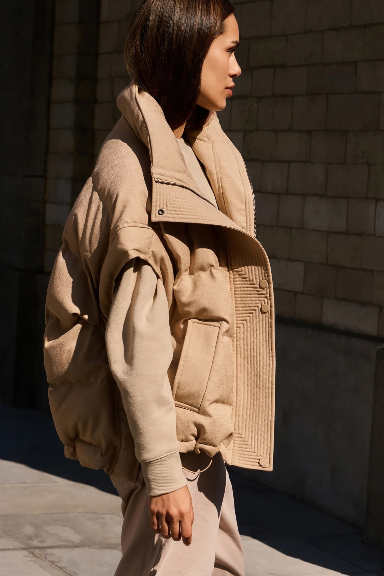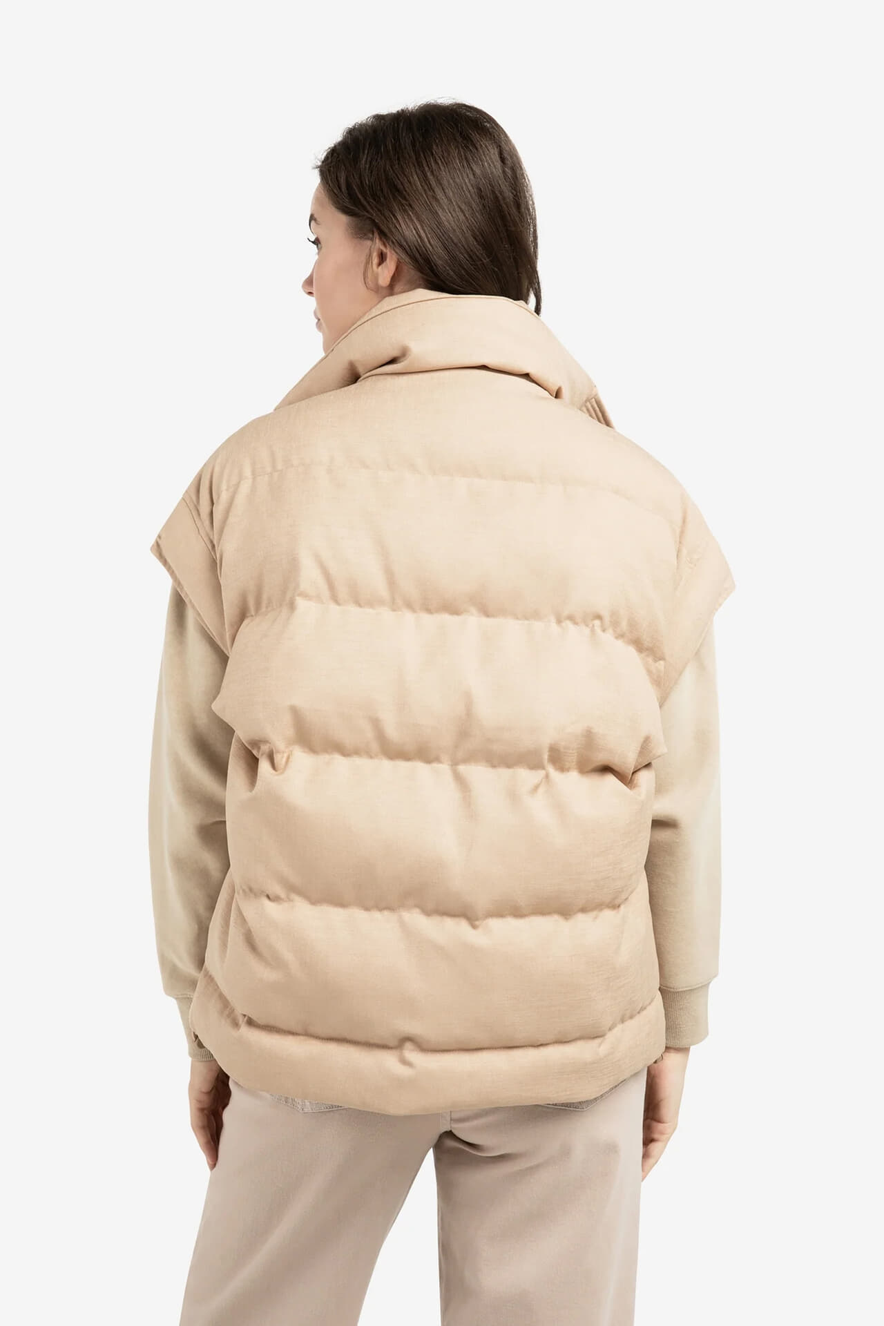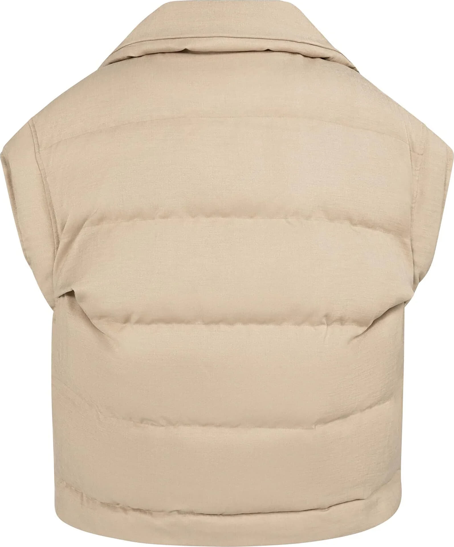 Deze oversized bodywarmer is gemaakt van een gladde nylonstof en heeft een gewatteerde afwerking voor extra warmte. Het ontwerp is voorzien van een opstaande kraag, ritssluiting met drukknopen, schuine steekzakken en zijsplitten met drukknoopsluiting. De achterzijde is iets langer dan de voorzijde voor een moderne, ronde zoom. De grafische stiksels op de sluiting geven dit item een verfijnd detail. Ideaal voor gelaagde looks in het tussenseizoen. Het model is 178 cm en draagt maat 2.
