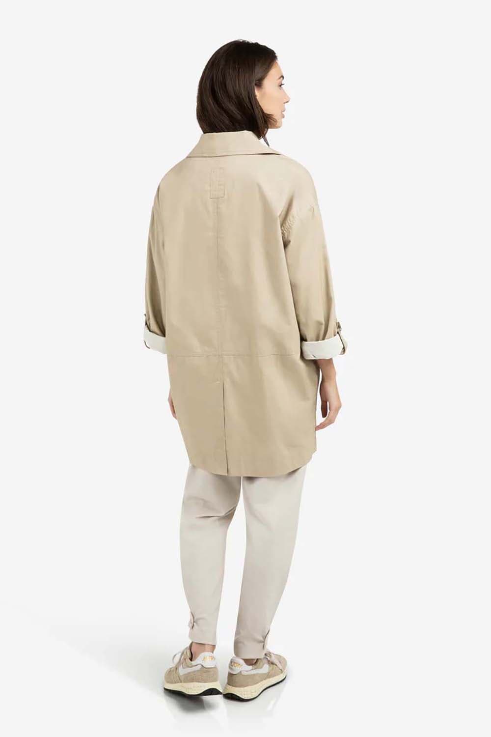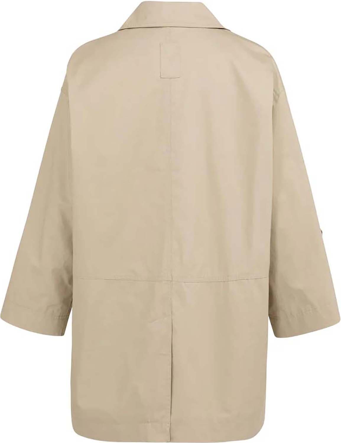 Deze middellange jas is gemaakt van stevig katoen en heeft een oversized pasvorm. Voorzien van een klassieke kraag, knoopsluiting en grote opgestikte zakken. De 3/4-mouwen kunnen worden opgerold en vastgezet met een knoopdetail. Een veelzijdig item dat moeiteloos een casual of elegante outfit compleet maakt.