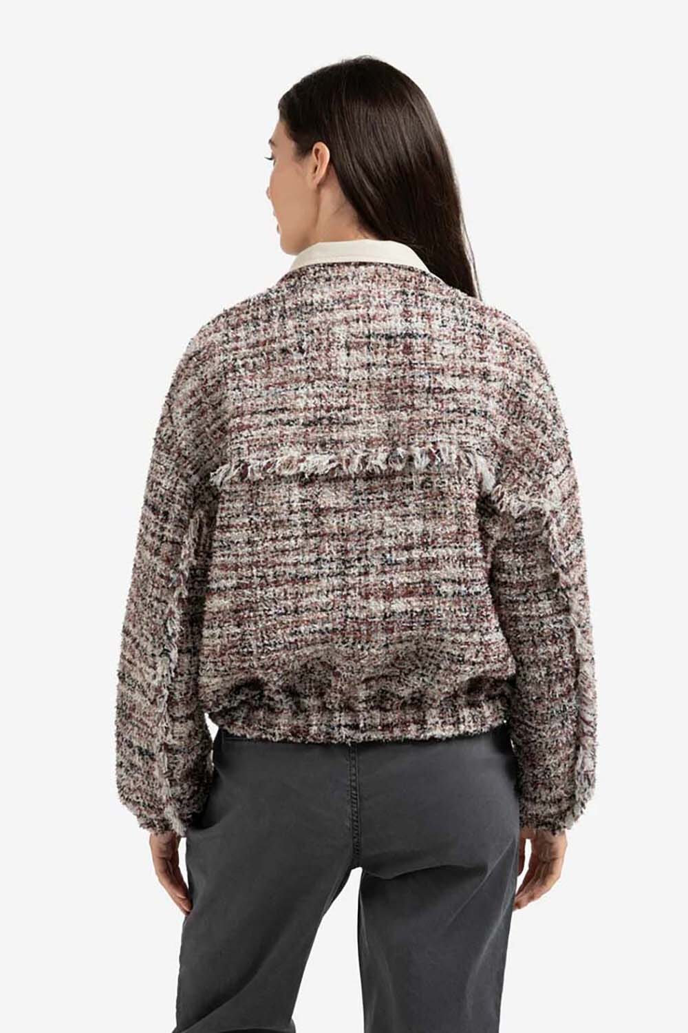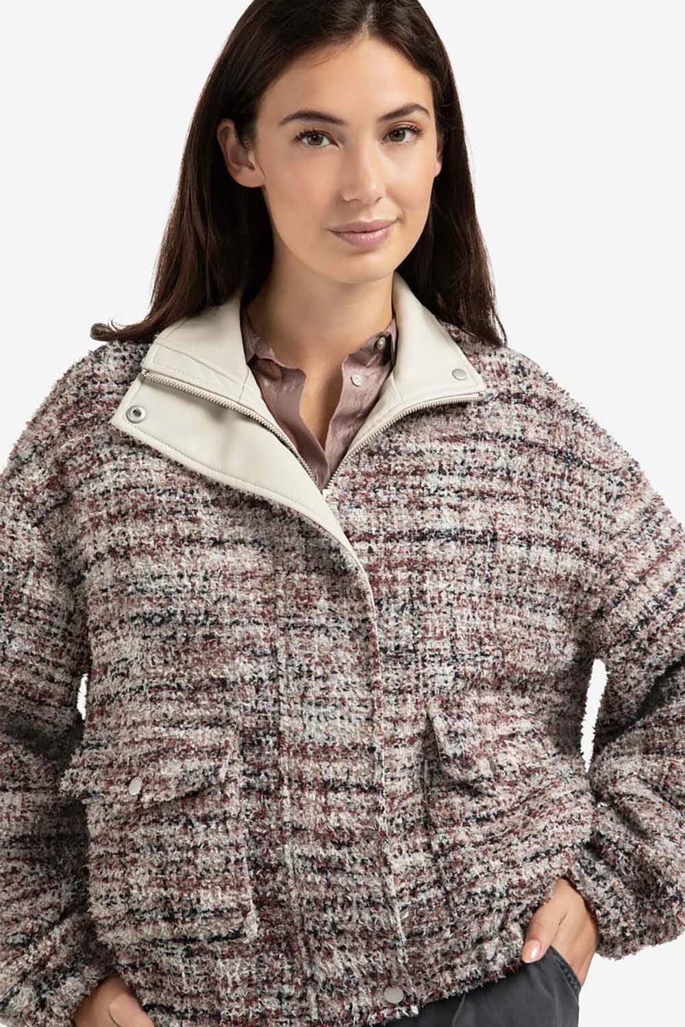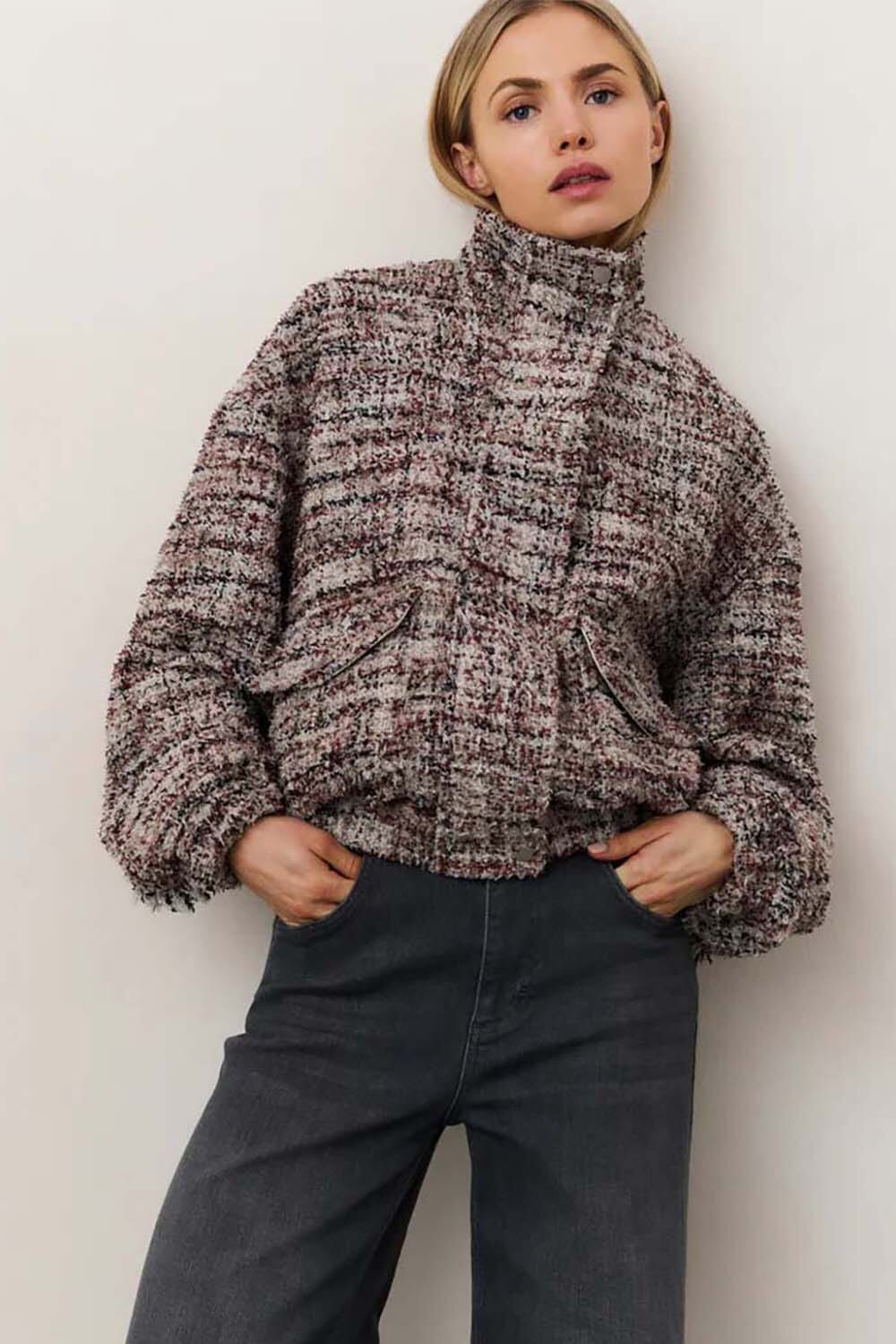 Jas Boucle van Yaya is een stijlvolle bomberjack met opstaande kraag, klassieke geweven patroon en lange mouwen. De jas heeft een relaxed pasvorm, zakken op de voorzijde en sluit met knopen. Deze tussenjas biedt een sophisticated stijl die eenvoudig te combineren is.