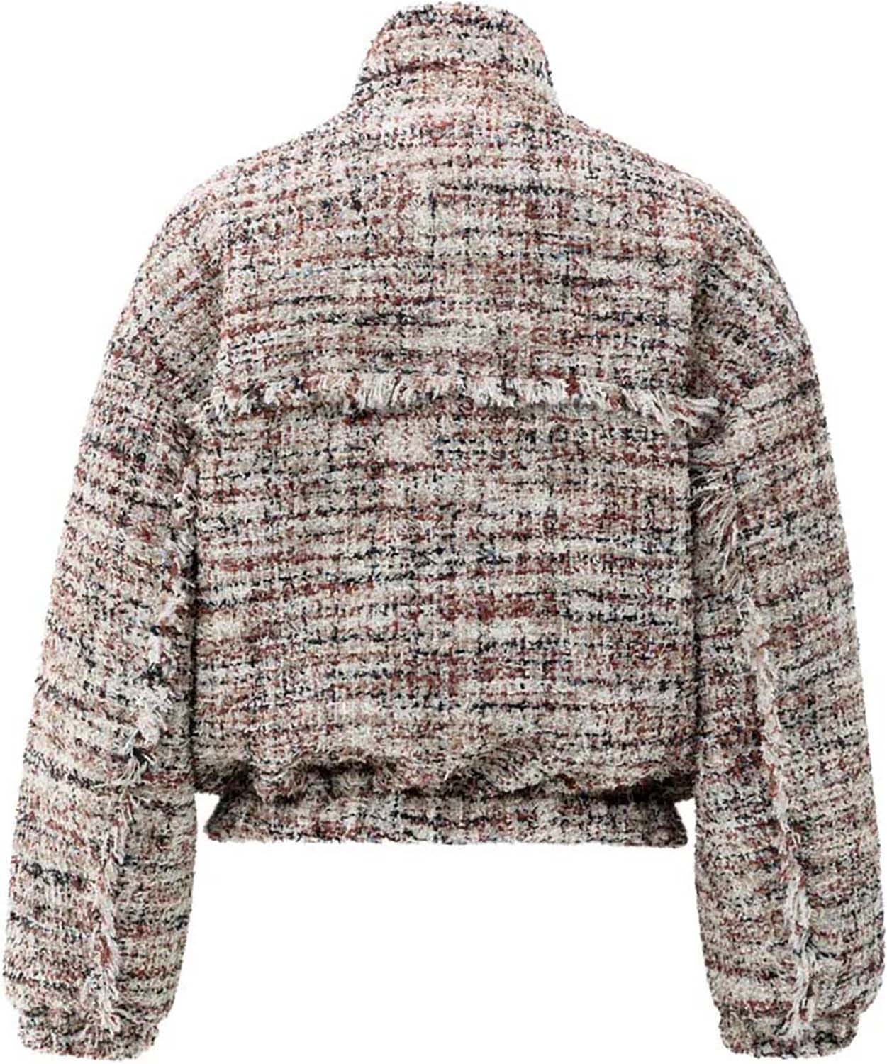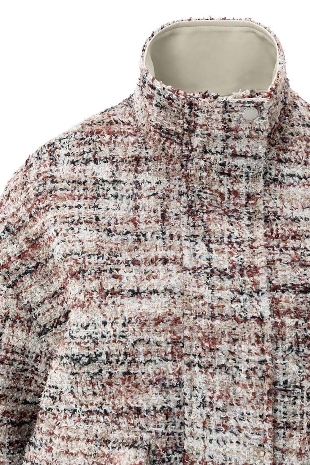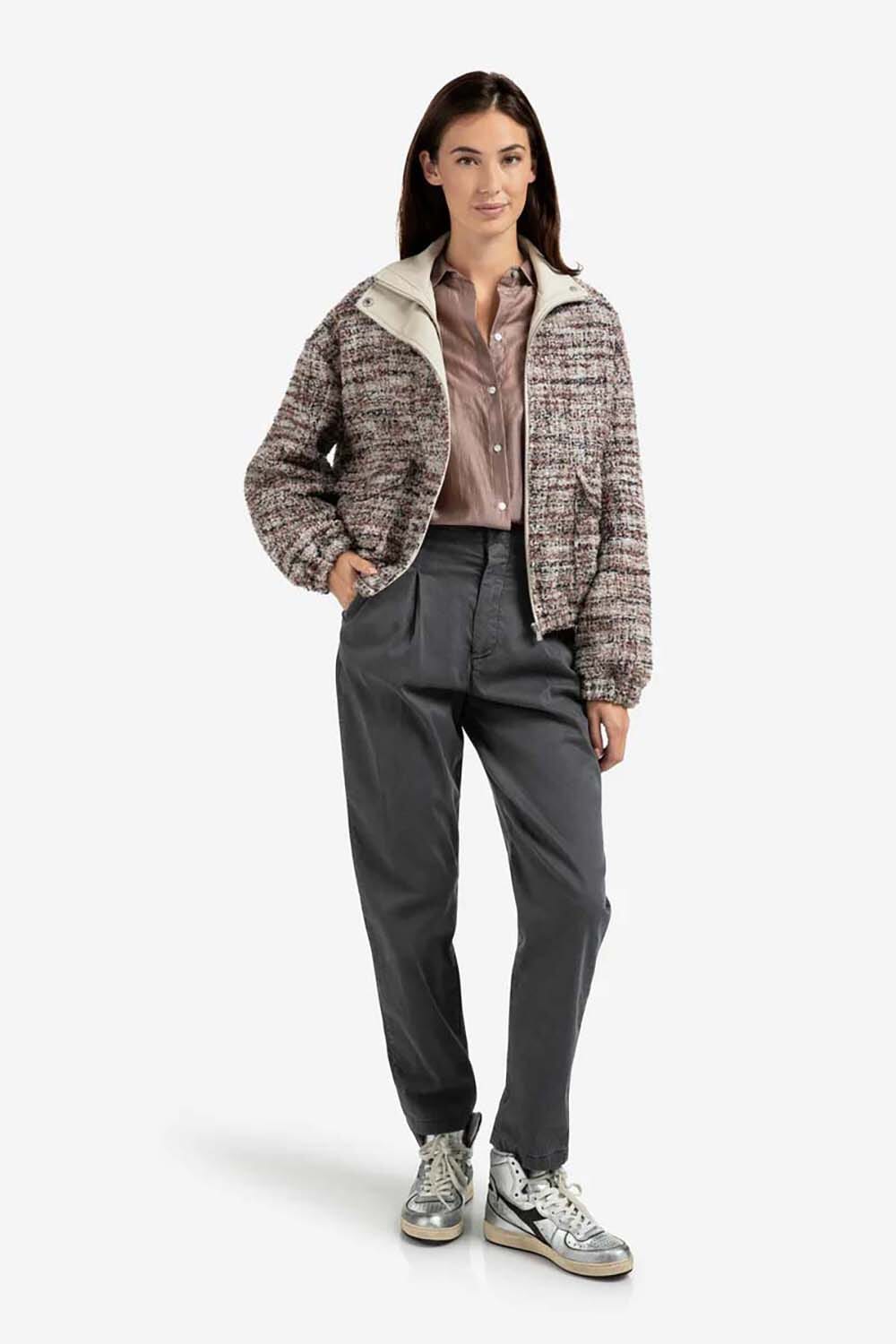 Jas Boucle van Yaya is een stijlvolle bomberjack met opstaande kraag, klassieke geweven patroon en lange mouwen. De jas heeft een relaxed pasvorm, zakken op de voorzijde en sluit met knopen. Deze tussenjas biedt een sophisticated stijl die eenvoudig te combineren is.