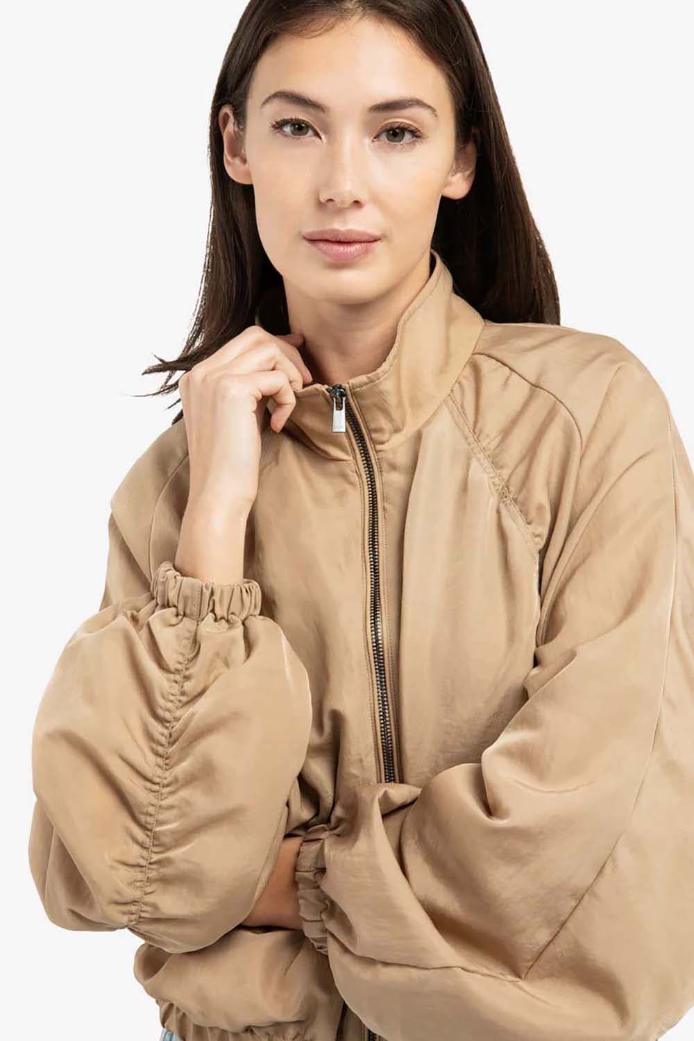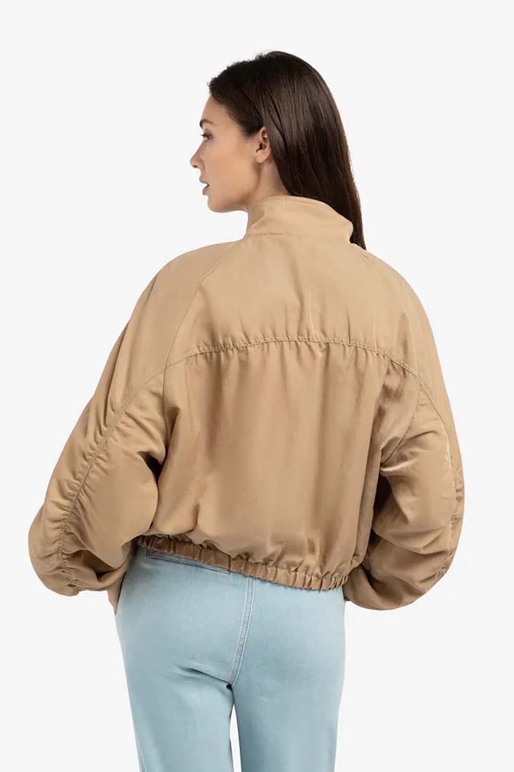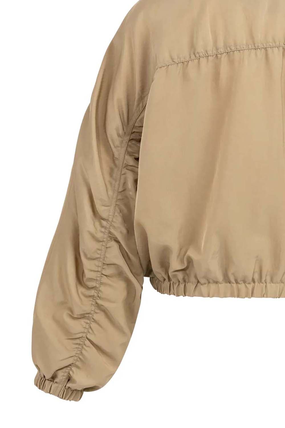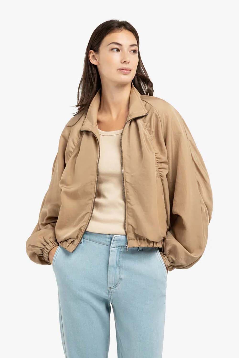 Jasje bomberjacket van Yaya met opstaande kraag en rits. Cropped, oversized pasvorm met lange mouwen, elastische manchetten en elastische zoom. Effen ontwerp met subtiele plooidetails langs de raglanmouwen en zakken op de voorzijde. Combineer met een high-waist jeans of rechte pantalon.