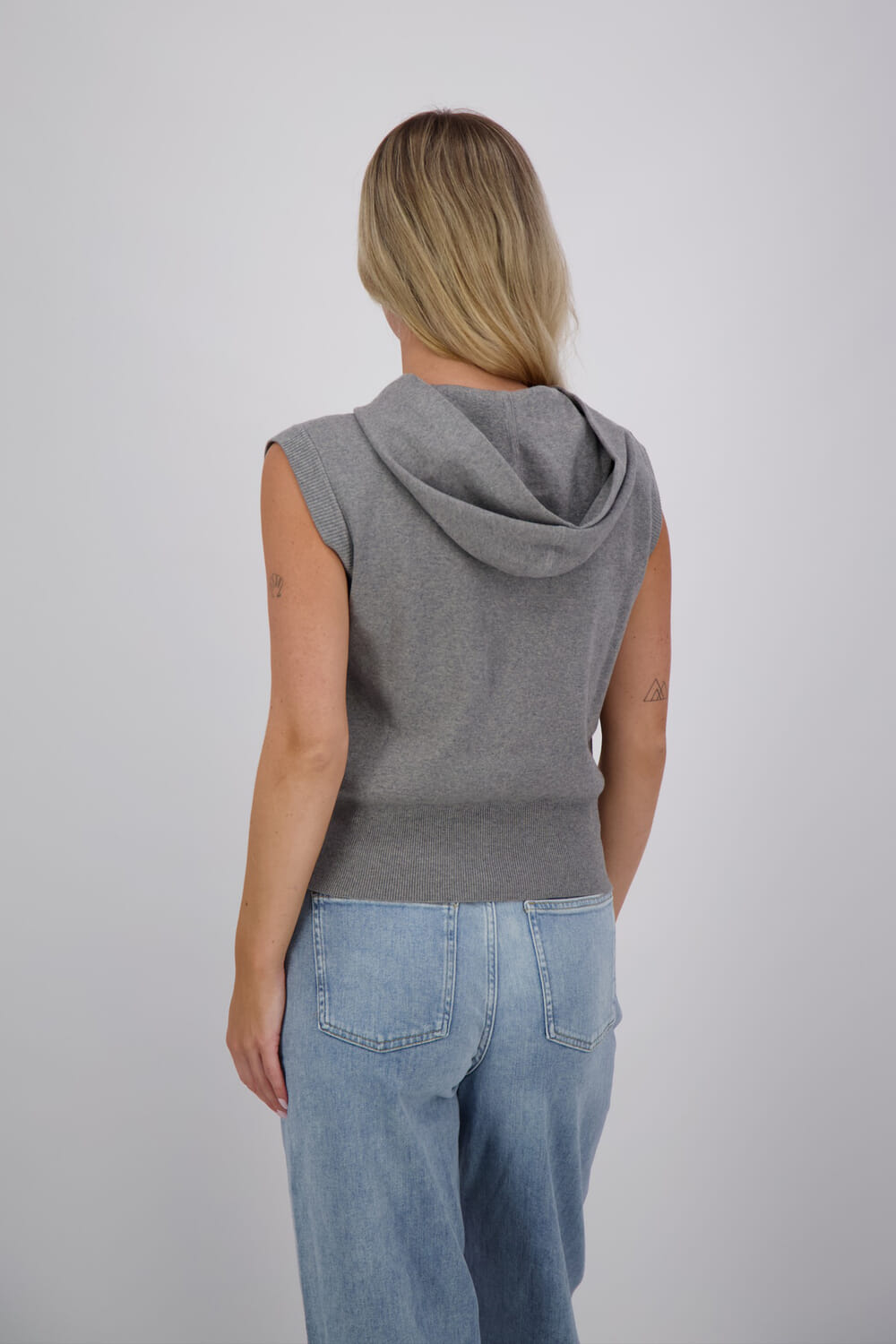 Deze sportieve gebreide hoodie zonder mouwen is uitgevoerd in een comfortabele, zachte kwaliteit. Voorzien van een ritssluiting, capuchon en ribboorden voor een moderne uitstraling. De aansluitende pasvorm en het minimalistische design maken dit item ideaal om gelaagd te dragen over een blouse of longsleeve. Perfect voor een casual, maar verzorgde look.