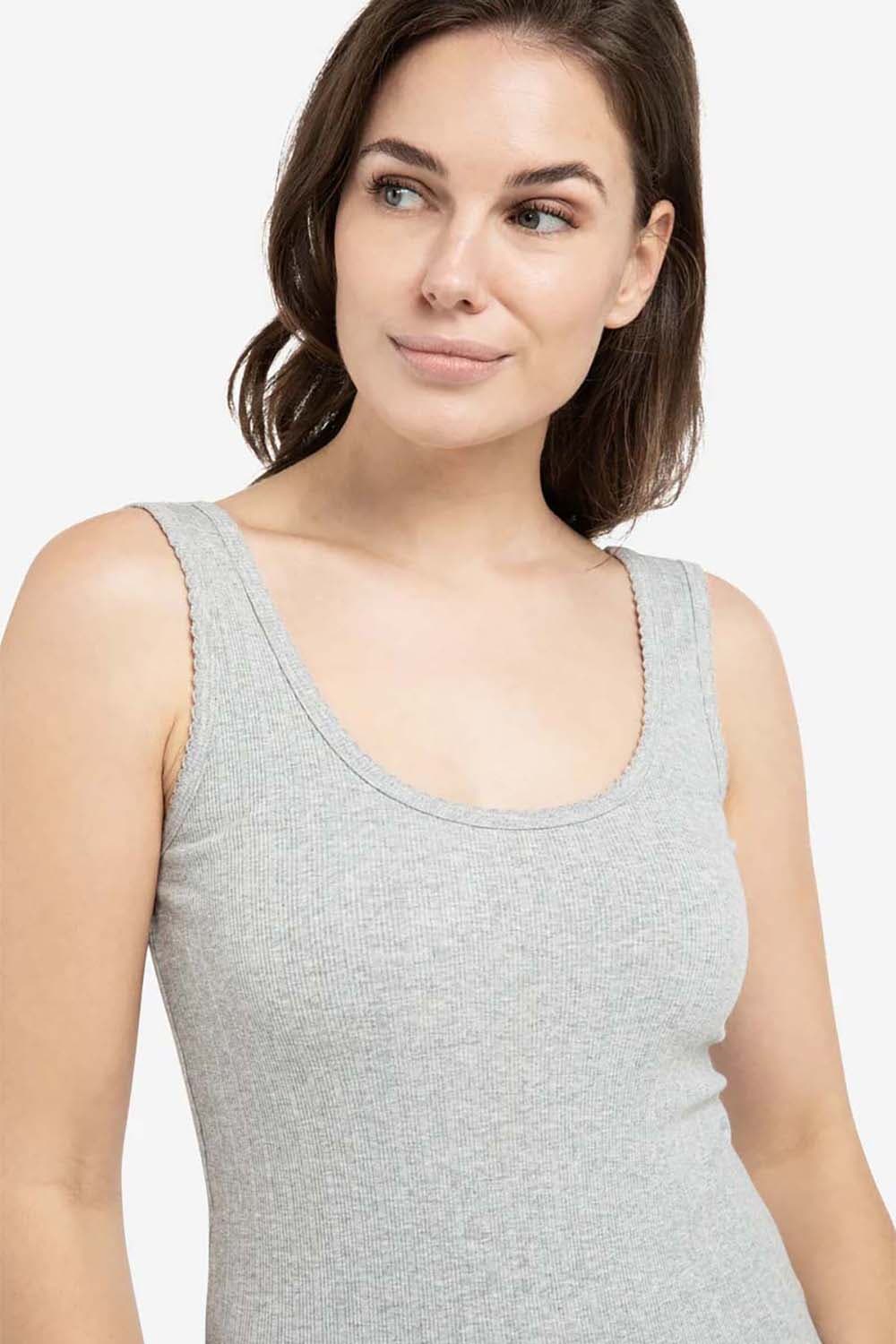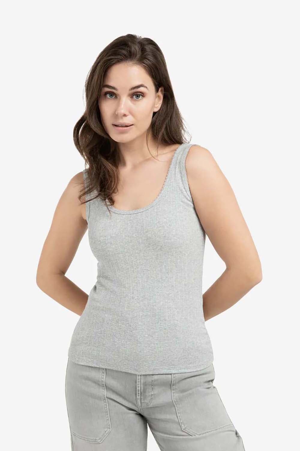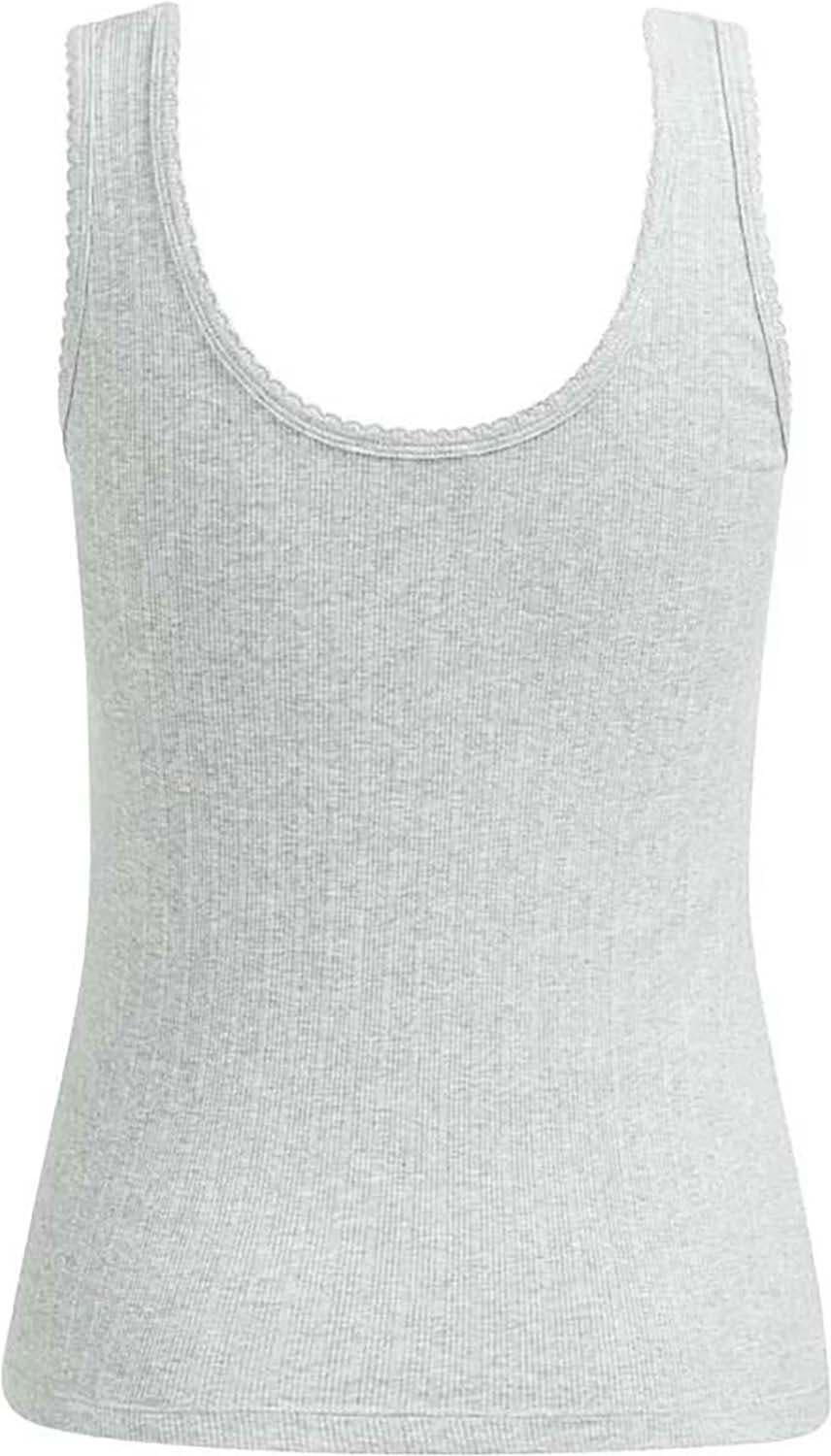 Dit singlet is gemaakt van een zachte, rekbare ribstof en heeft een aangesloten pasvorm. De halslijn en armsgaten zijn verfijnd afgewerkt met een sierlijk golvend randje, wat zorgt voor een vrouwelijke en elegante uitstraling. Perfect om solo te dragen op warme dagen of als basis onder een blouse of vest.