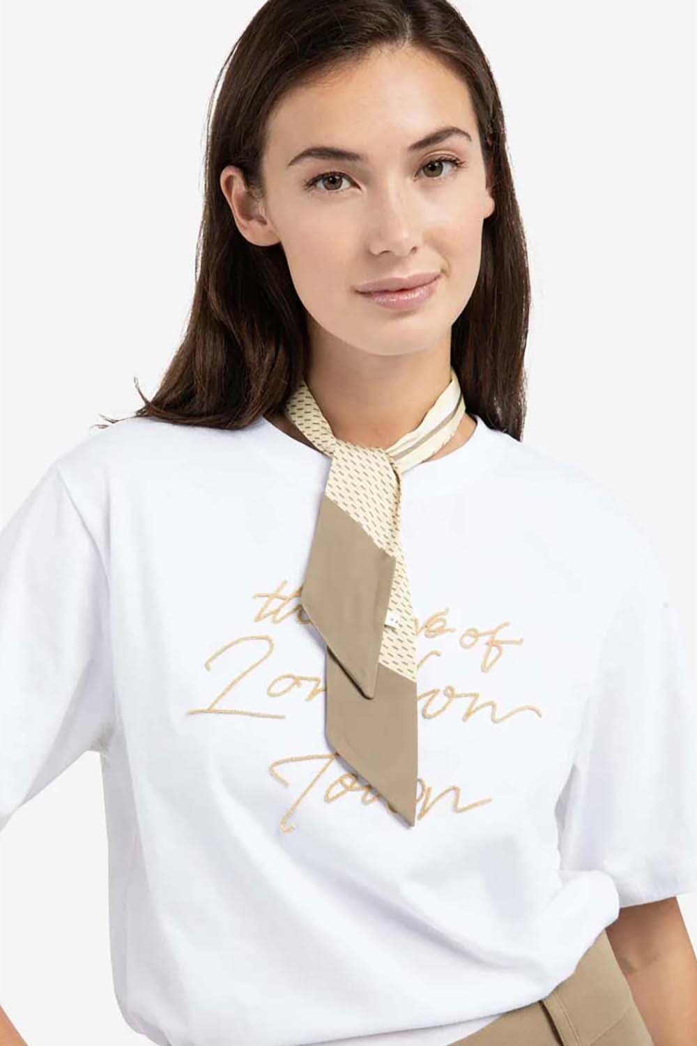 Smalle sjaal London Town sjaal van Yaya met grafisch streeppatroon en contrastpunten. De smalle vorm knoopt soepel als strik, halslint of aan een tas. De lichte stof voelt glad aan en blijft netjes zitten. Combineer met een blazer of blouse voor een zakelijke uitstraling.