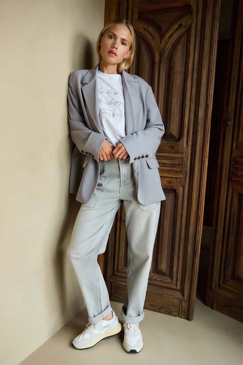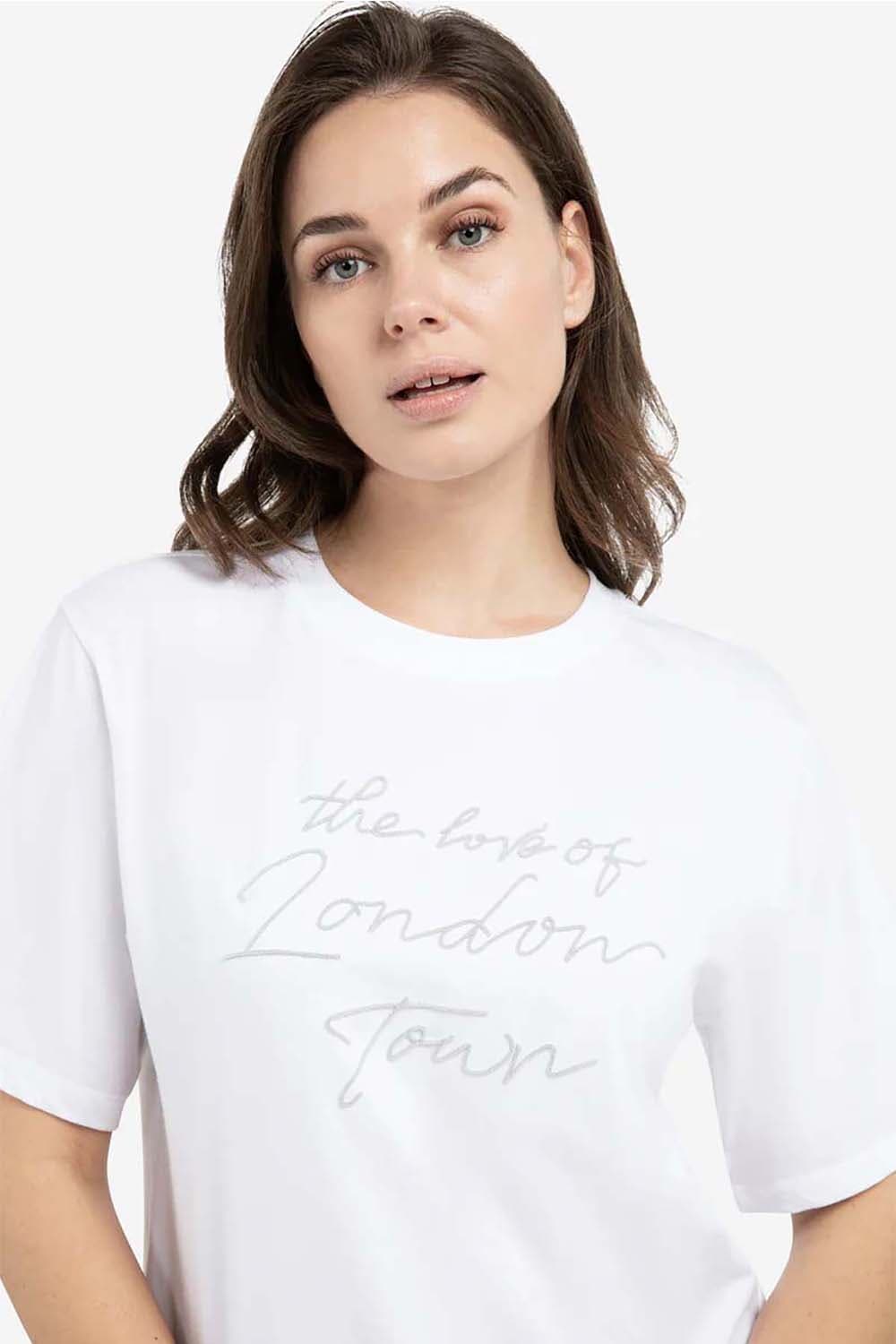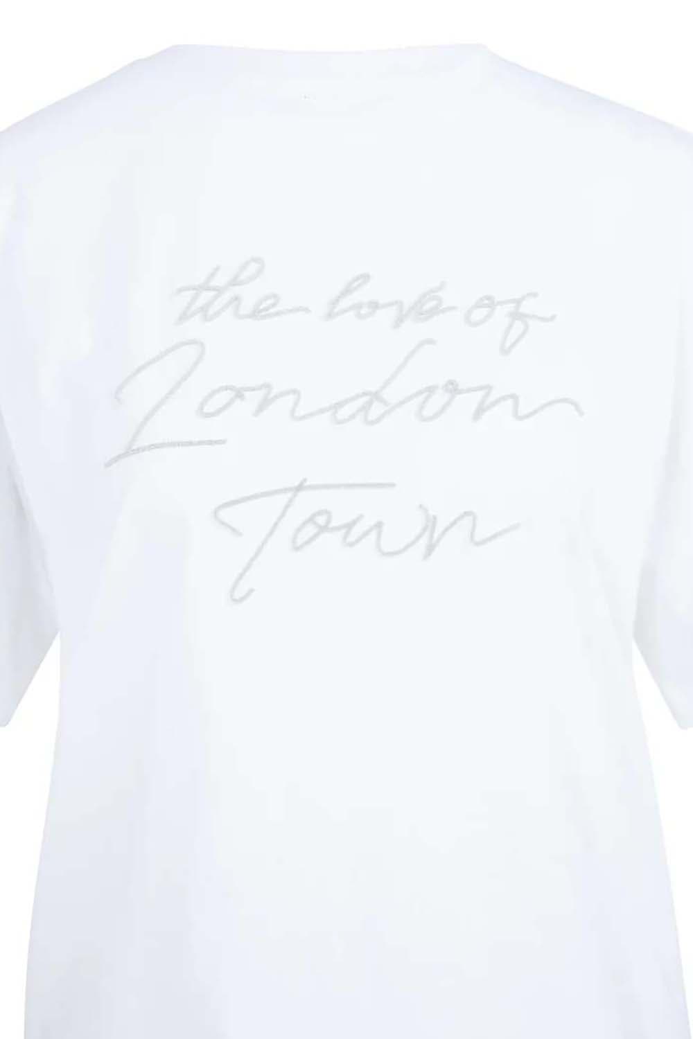 Dit katoenen T-shirt heeft een losse, iets boxy pasvorm en is voorzien van korte, wijde mouwen. Op de borst staat een flockprint met de tekst 'The love of London Town in een zachte finish. De ronde hals en cleane afwerking maken het een casual item met een stijlvolle twist.