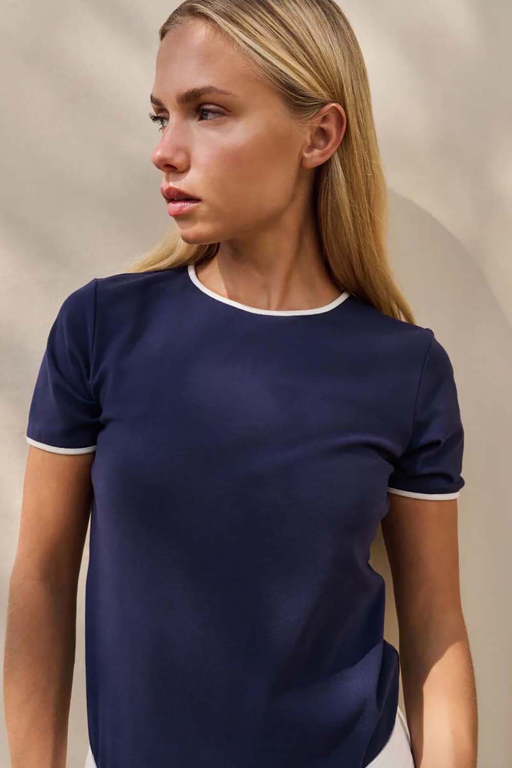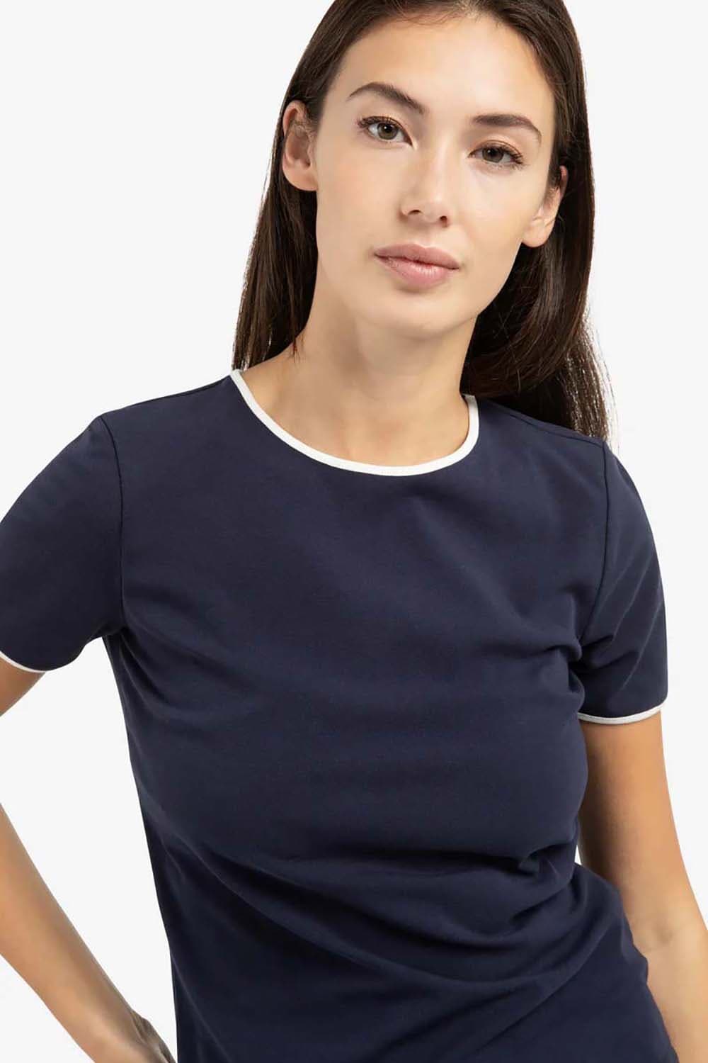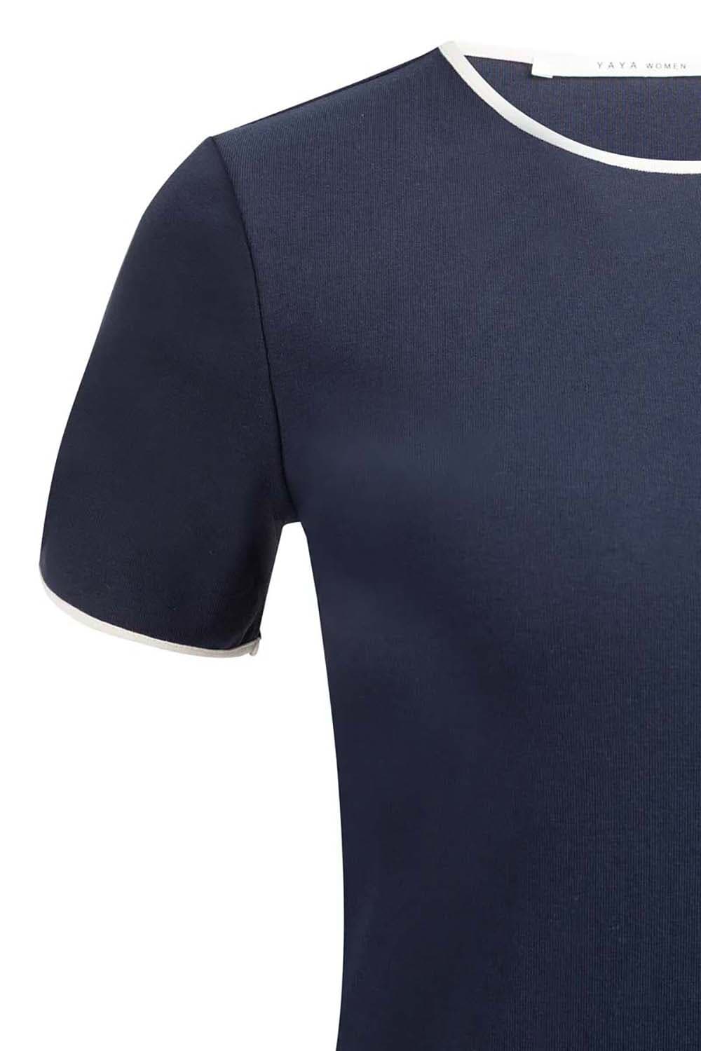 T-shirt van Yaya met ronde hals, korte mouwen en een effen, donkerblauwe kleur. De contrasterende bies langs hals en mouwzoom geeft een strakke, minimalistische afwerking. De aangesloten pasvorm draagt comfortabel en oogt verzorgd. Combineer met een blazer of een jeans voor casual of netjes.