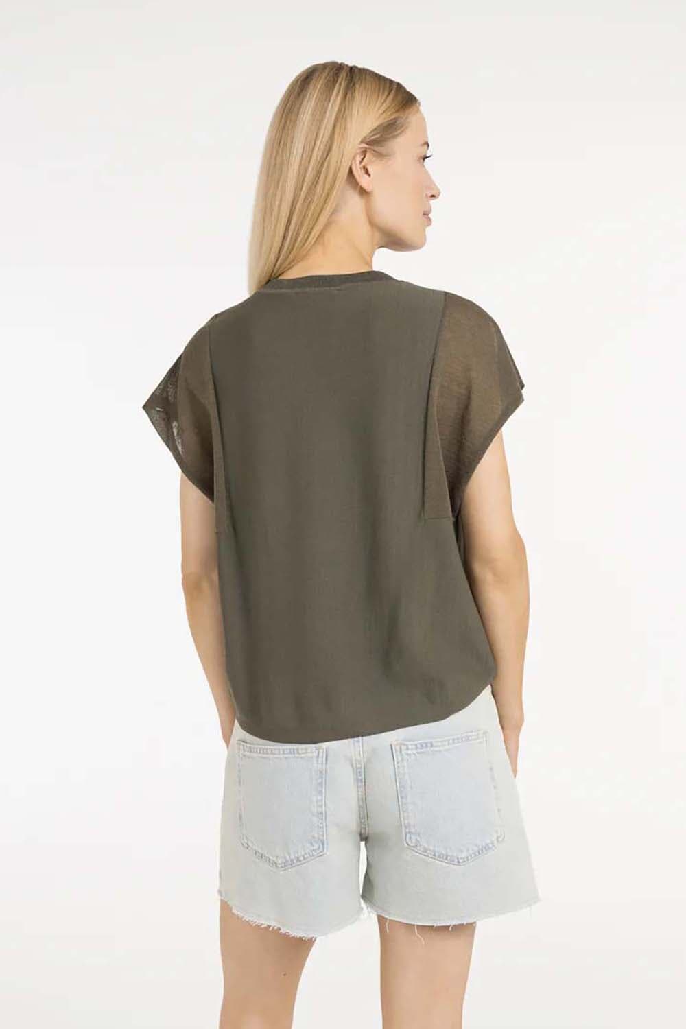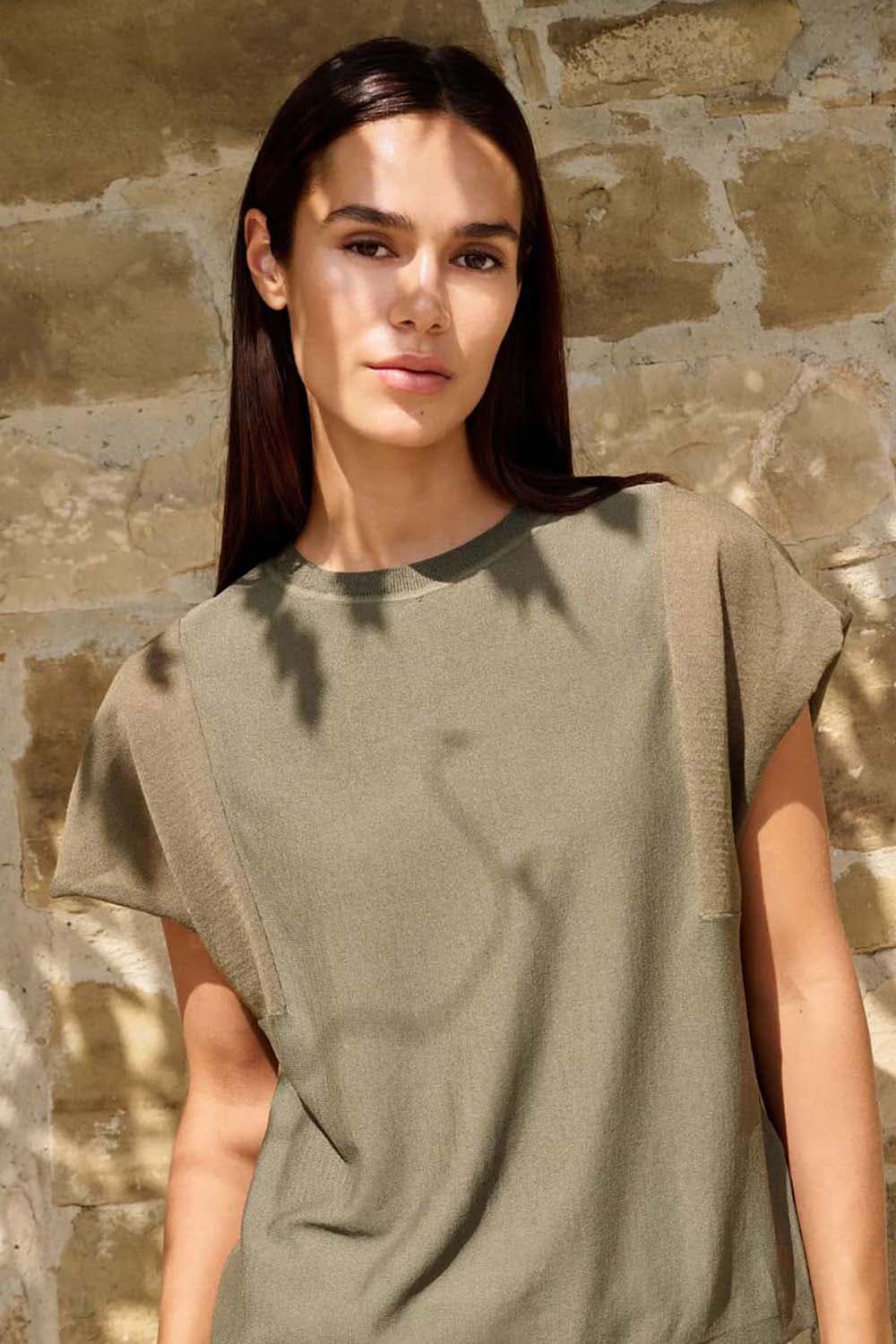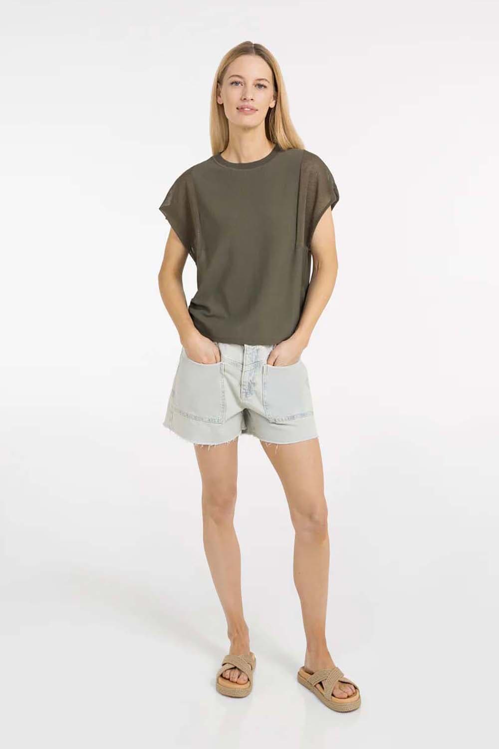 Top van Yaya met ronde hals, korte mouw en effen afwerking. De minimalistische snit heeft brede, licht afhangende schouders en een rechte, relaxte pasvorm met nette boorden. Draagt prettig en valt soepel. Combineer met een jeans of een nette broek voor een rustige basis.