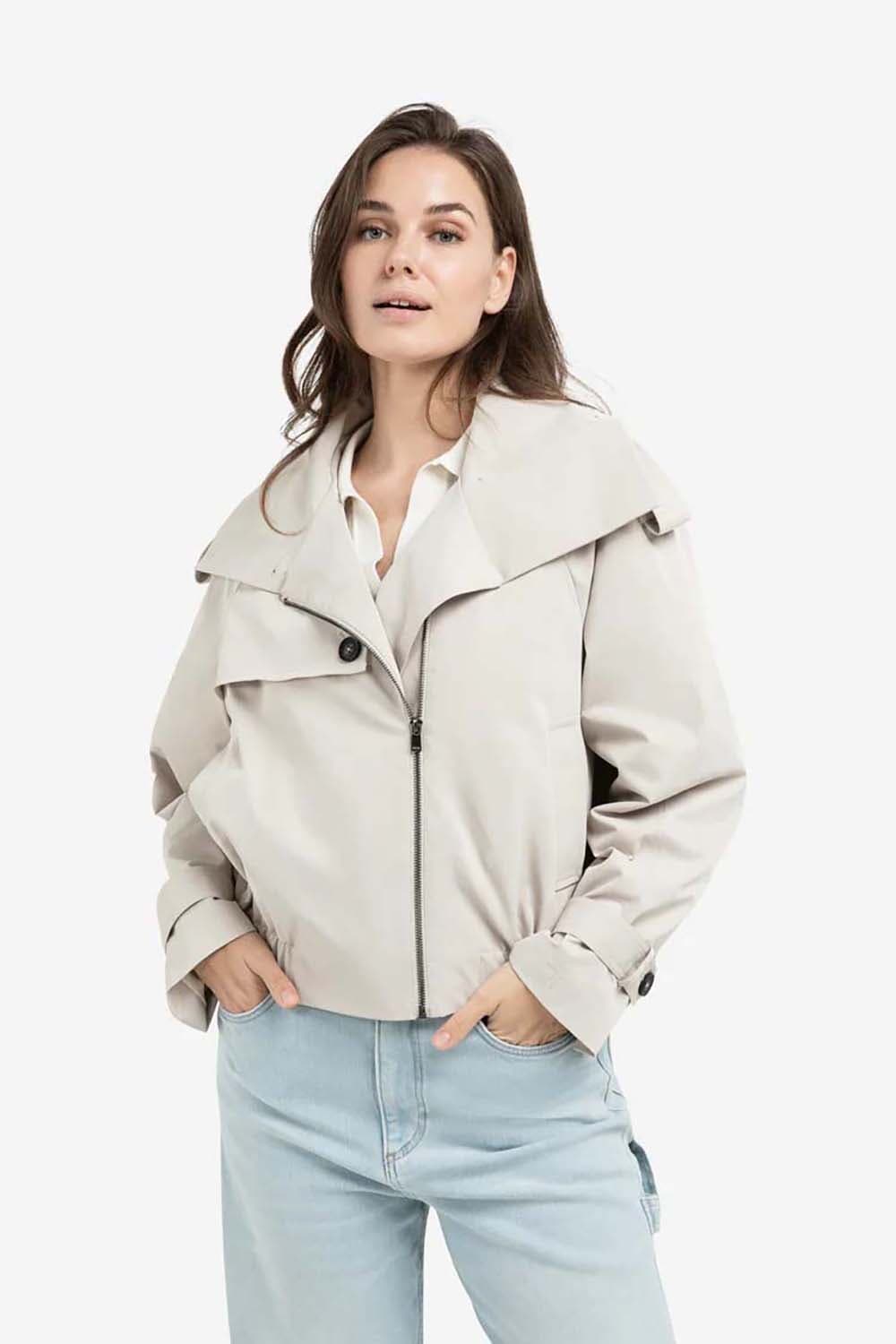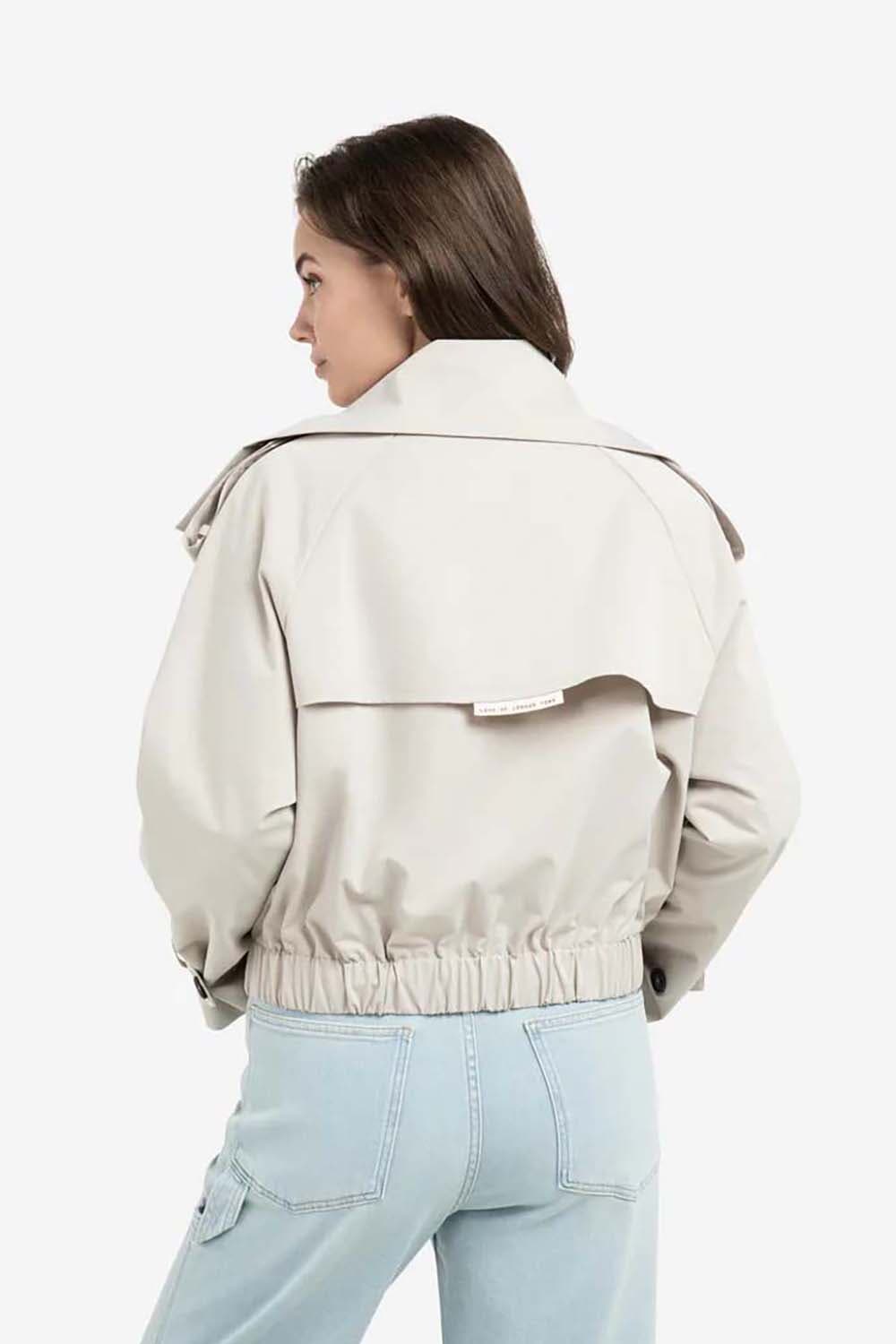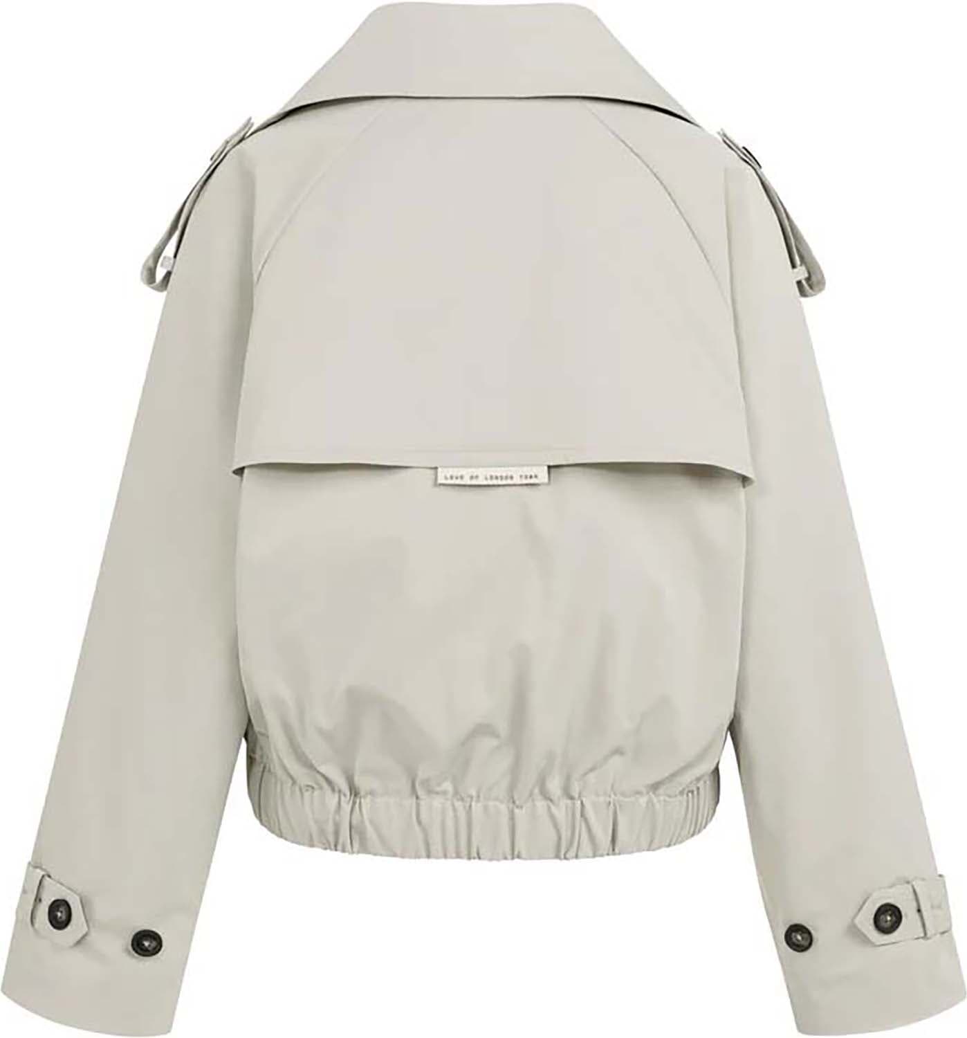 Dit korte jack combineert trenchcoat-elementen met een bomberstijl. Ontworpen met een opstaande kraag, epauletten en een schouderoverslag voor een functionele look. De elastische tailleband en manchetten zorgen voor een modern accent. Op de rug zit een klein label met de tekst 'Love of London Town'. Gemaakt van een gladde geweven stof, perfect voor het tussenseizoen.