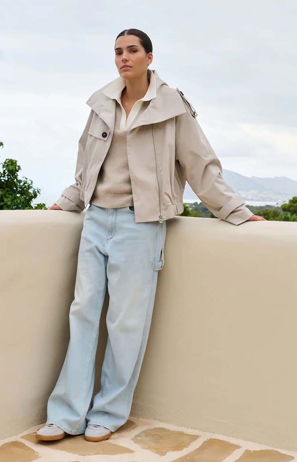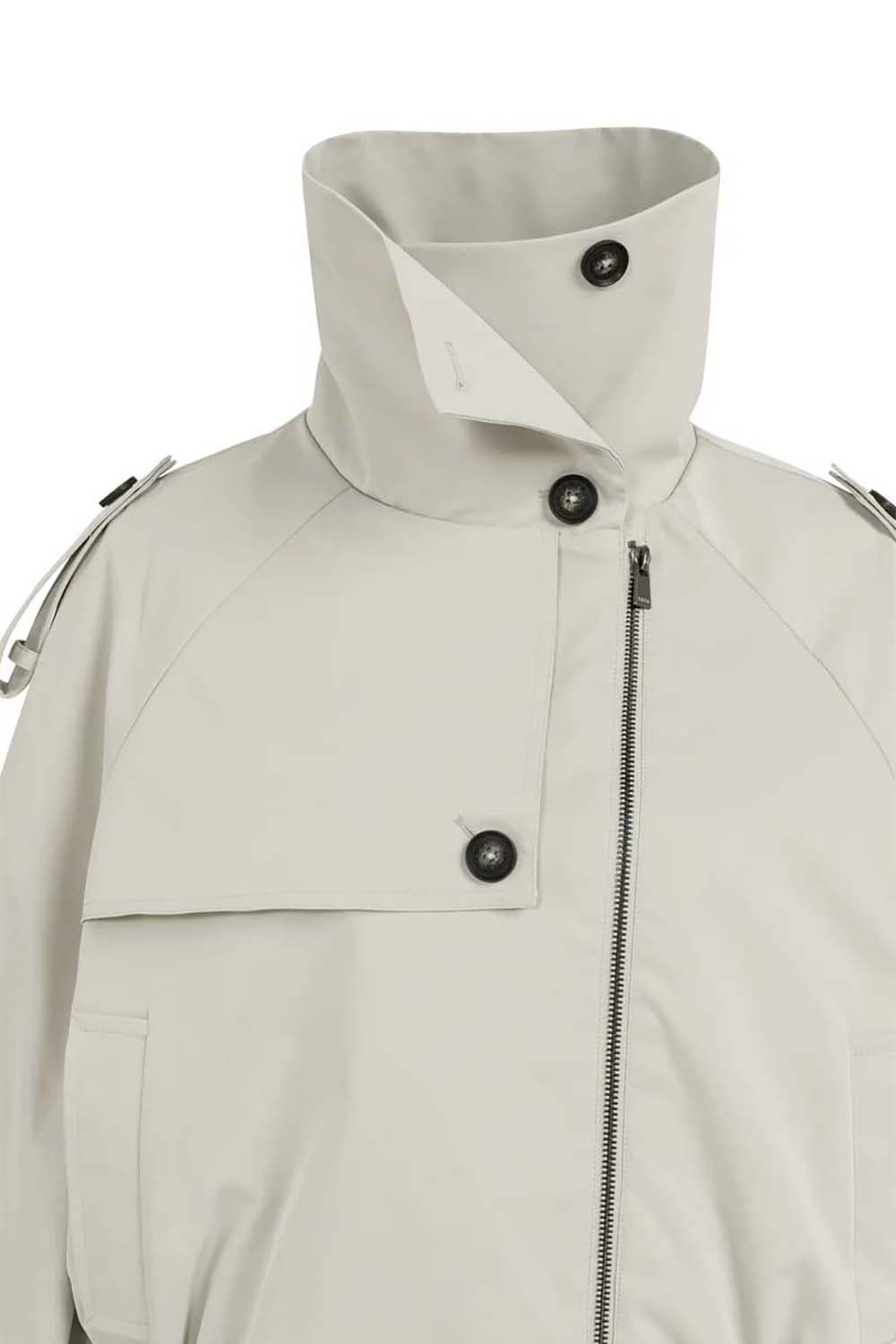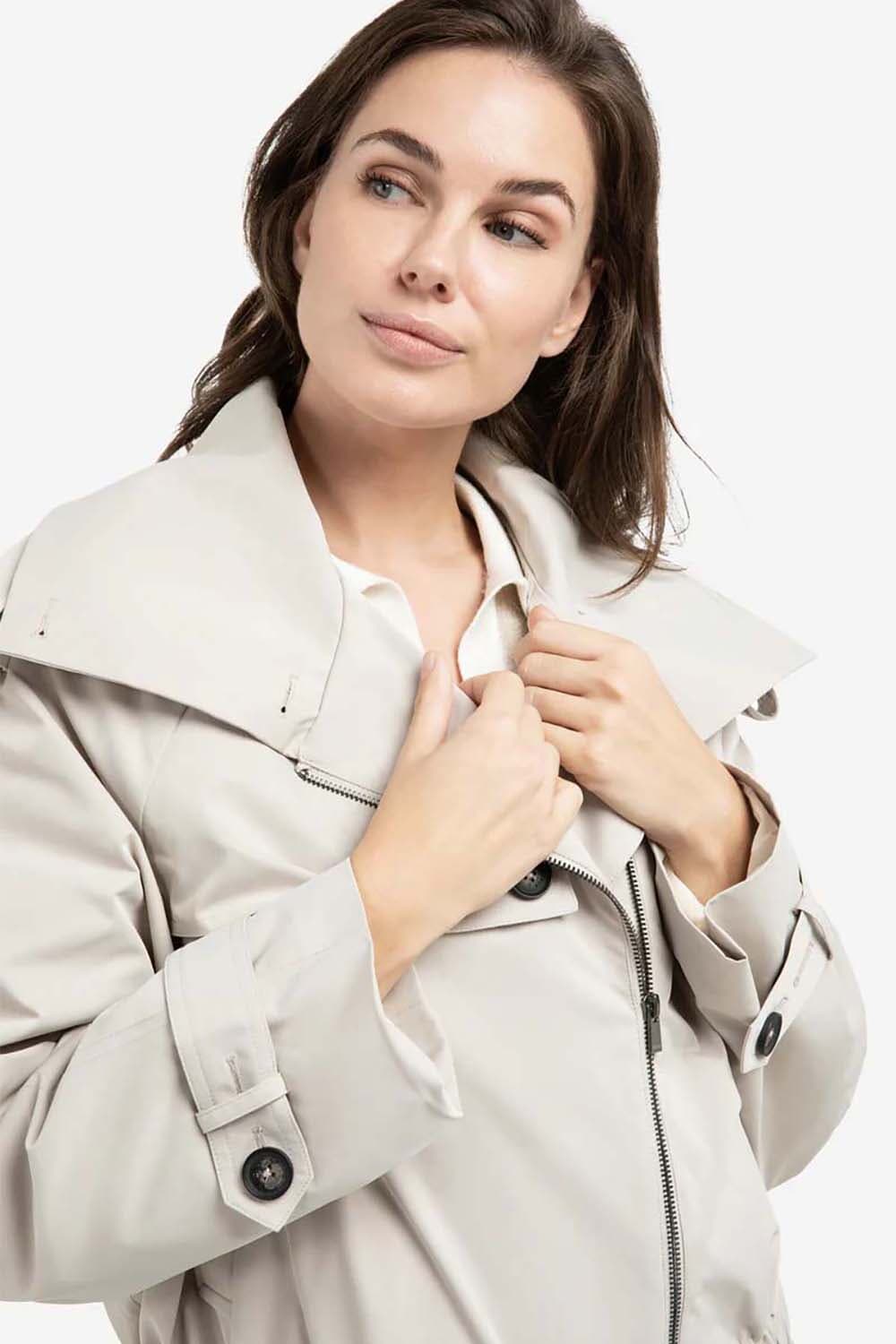 Dit korte jack combineert trenchcoat-elementen met een bomberstijl. Ontworpen met een opstaande kraag, epauletten en een schouderoverslag voor een functionele look. De elastische tailleband en manchetten zorgen voor een modern accent. Op de rug zit een klein label met de tekst 'Love of London Town'. Gemaakt van een gladde geweven stof, perfect voor het tussenseizoen.