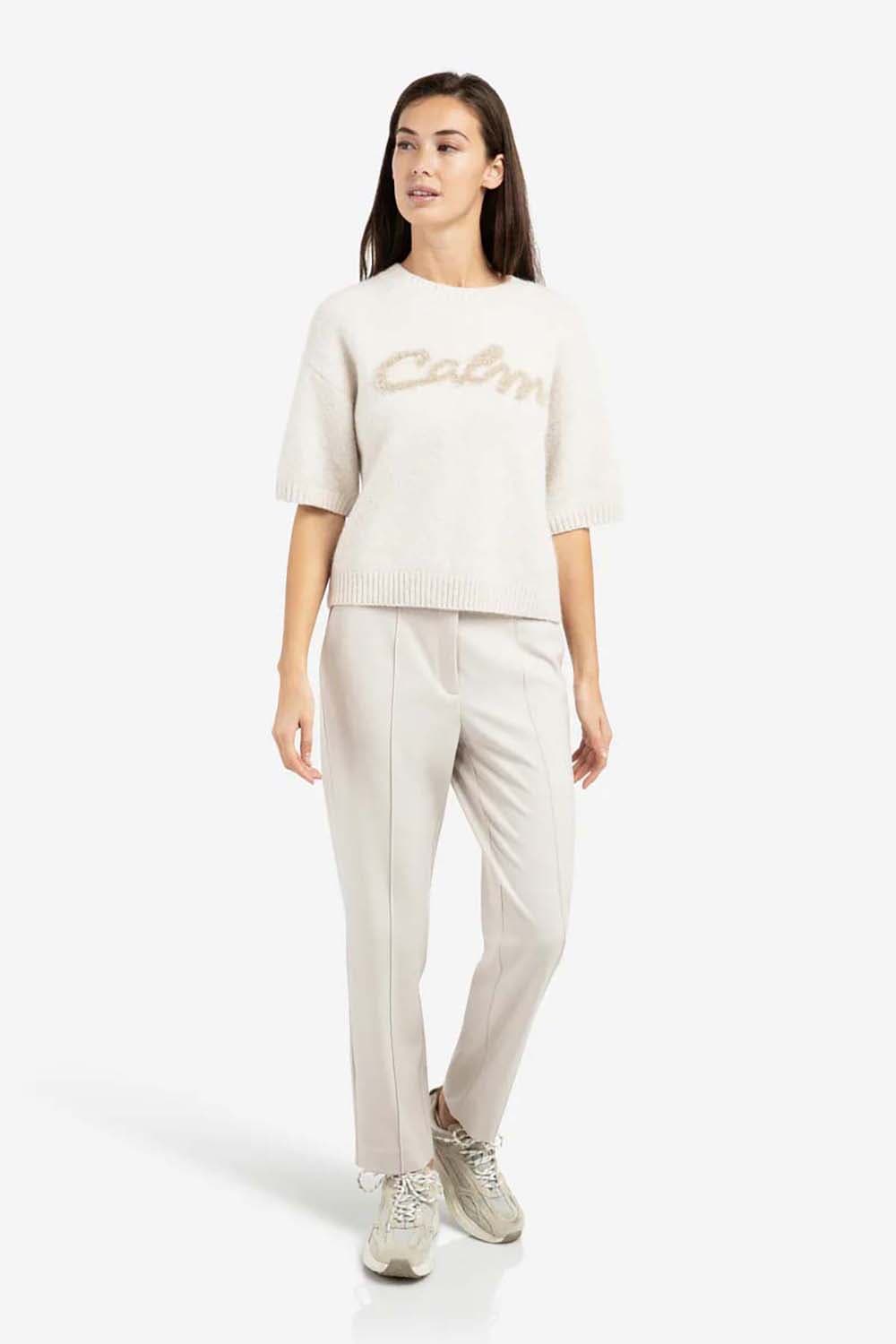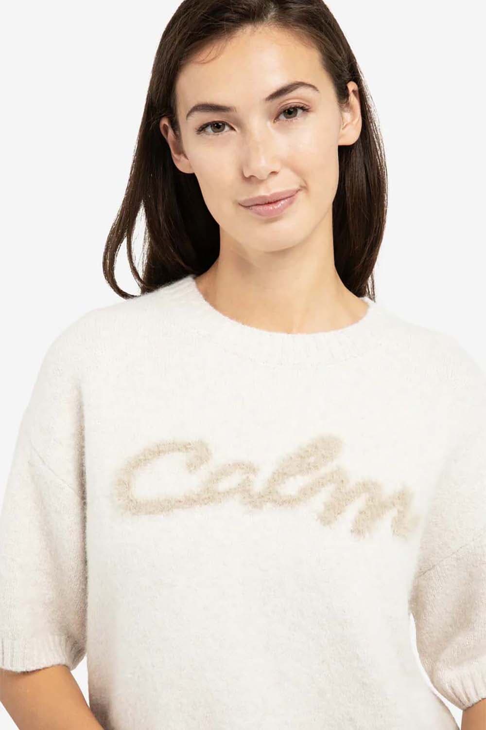 Deze zachte gebreide trui met korte mouwen heeft een ronde hals en een losse pasvorm. De voorkant is voorzien van een fluffy tekst met het woord 'Calm, wat zorgt voor een speels accent. Afgewerkt met ribboorden aan hals, mouwen en zoom. Een comfortabele en stijlvolle toevoeging aan je garderobe.