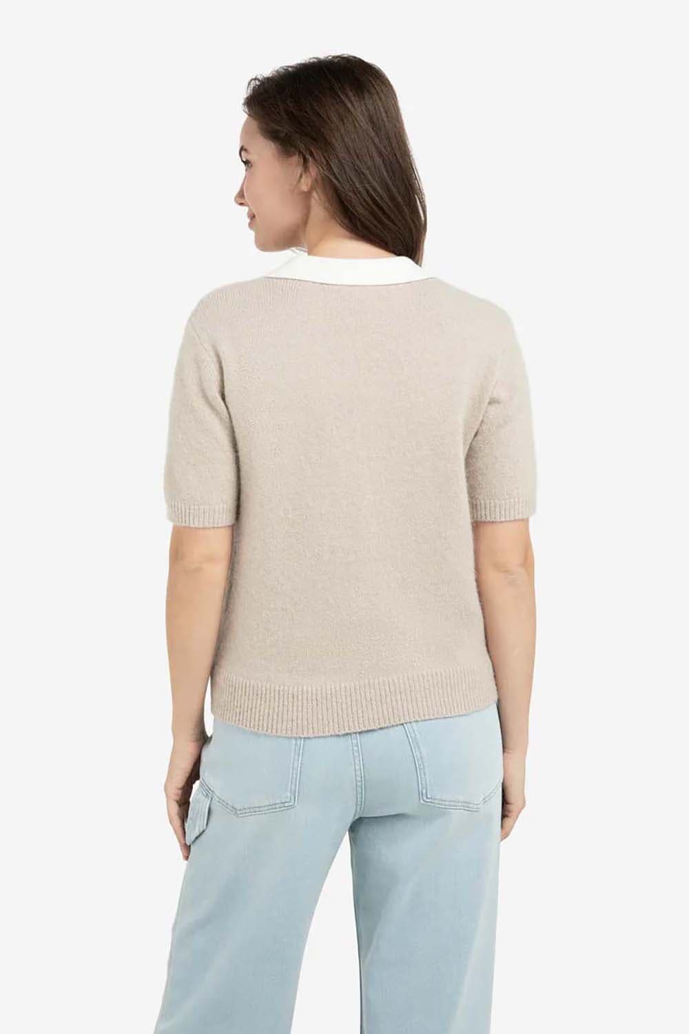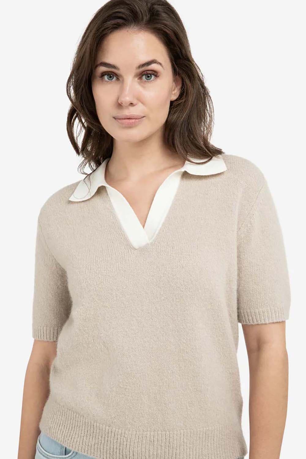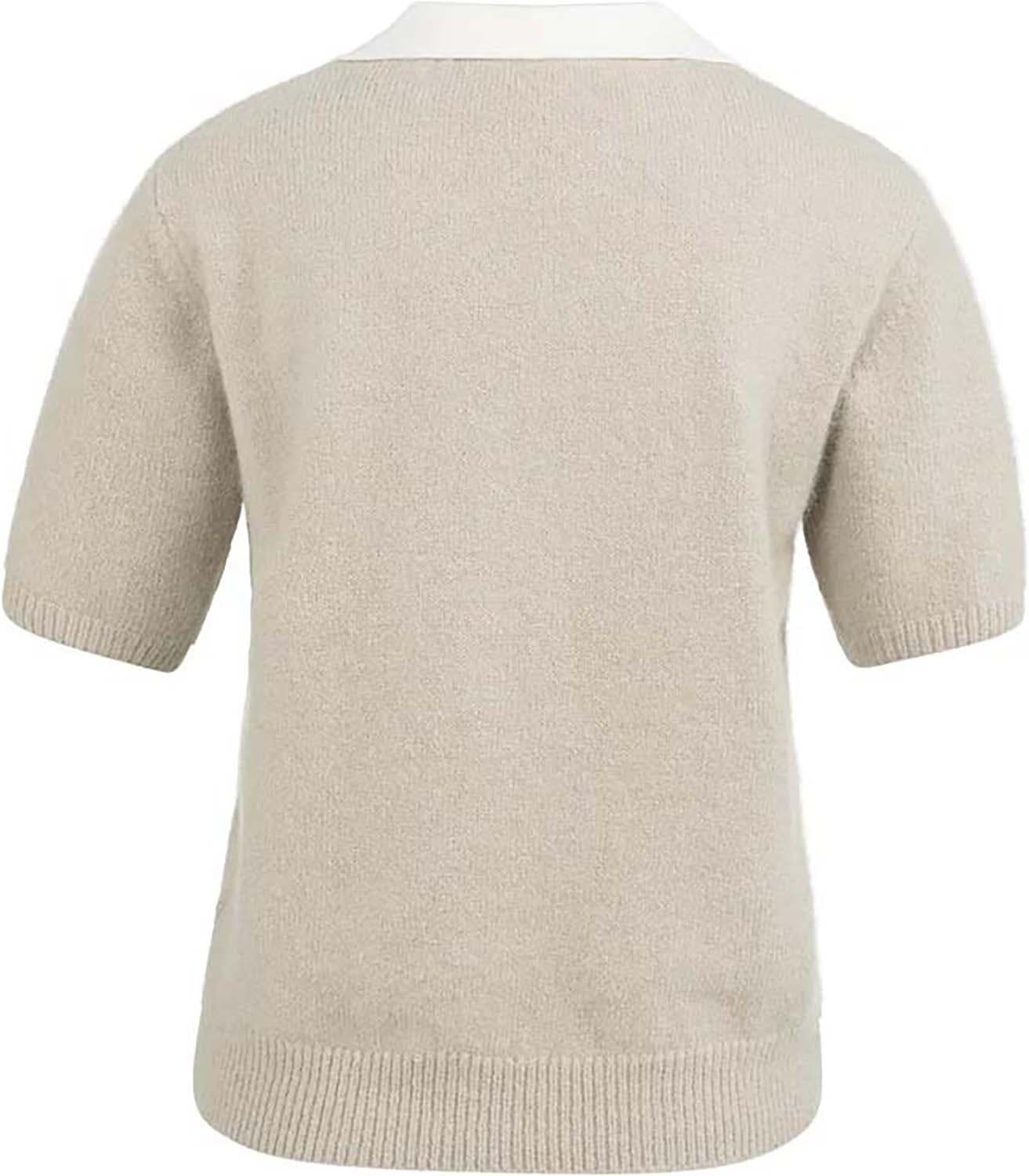 Deze zachte, fijngebreide trui heeft korte mouwen, een normale pasvorm en een contrasterende polokraag met een diepe V-hals. De combinatie van de verfijnde knit en sportieve details geeft dit item een moderne, casual uitstraling. Afgewerkt met geribde boorden aan de mouwen en zoom.