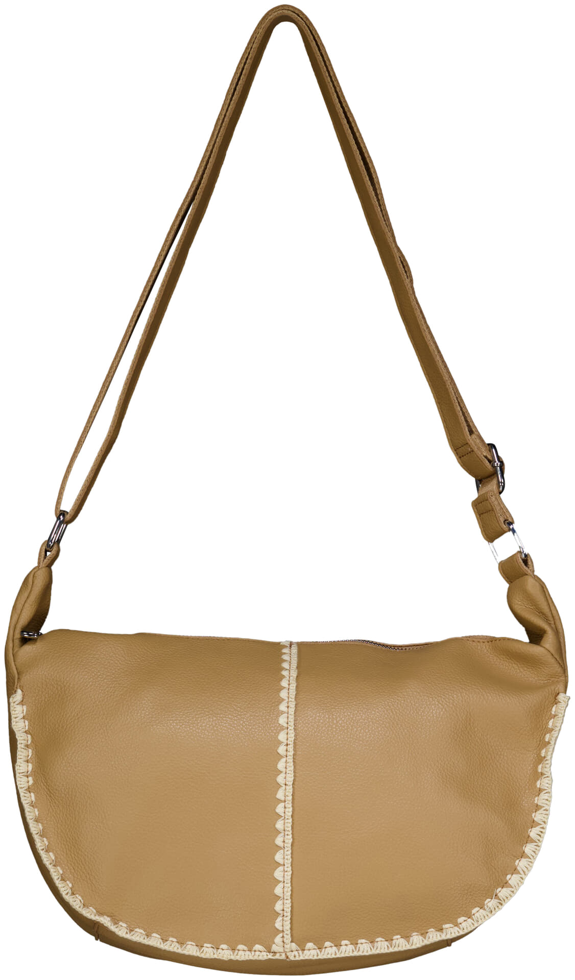 Tas van Zo met een casual, sophisticated uitstraling en een effen design. De afgeronde schoudervorm heeft een verstelbare band, decoratieve stiksels langs de rand en een ritsvak aan de achterzijde. Draagt prettig tegen het lichaam en combineert moeiteloos met jeans of een nette broek.
