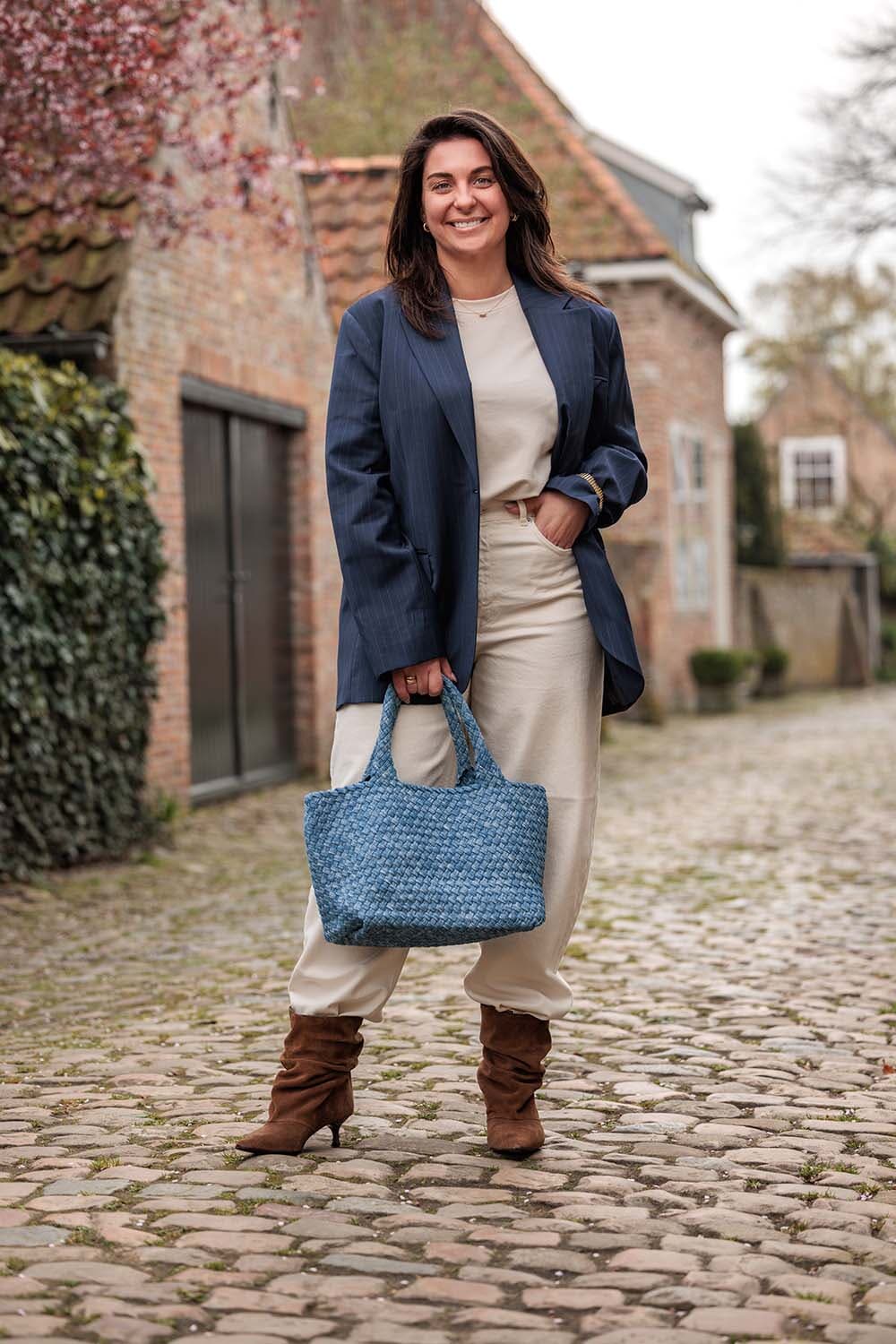 Tas Zo is een tas met all over, klassiek geweven structuur en gevlochten handgrepen. Het ruime, open model draagt comfortabel in de hand en biedt plek voor dagelijkse essentials. Past bij casual en bohemian outfits. Combineer met een luchtige blouse, jeans en sandalen.