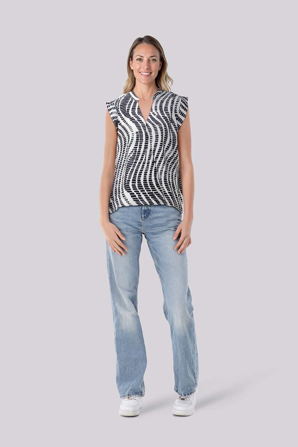T shirt Fleur van Zoso is een t-shirt met grafisch patroon, V-hals en knoopsluiting. De mouwloze, regular pasvorm zit comfortabel en valt netjes. Geschikt voor casual en business momenten. Combineer met een blazer voor een verzorgde uitstraling, of met een jeans voor dagelijks gemak.
