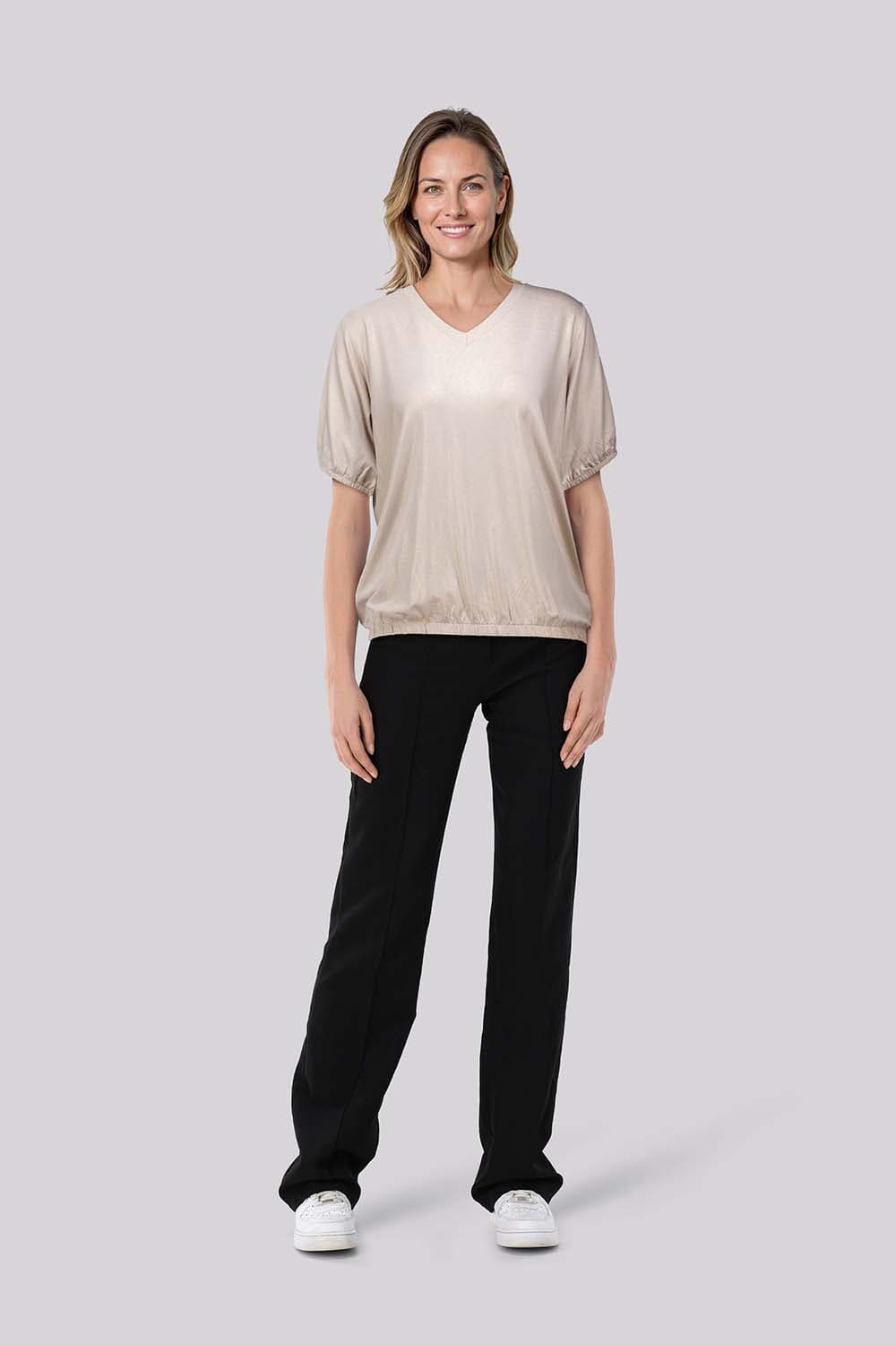 T shirt Ilse van Zoso is een t-shirt met V-hals, regular pasvorm en korte mouwen. De effen stof heeft een subtiele glans, met elastiek bij mouwzoom en onderzoom voor een nette valling. Combineer met een jeans of een nette broek voor een verzorgde set.