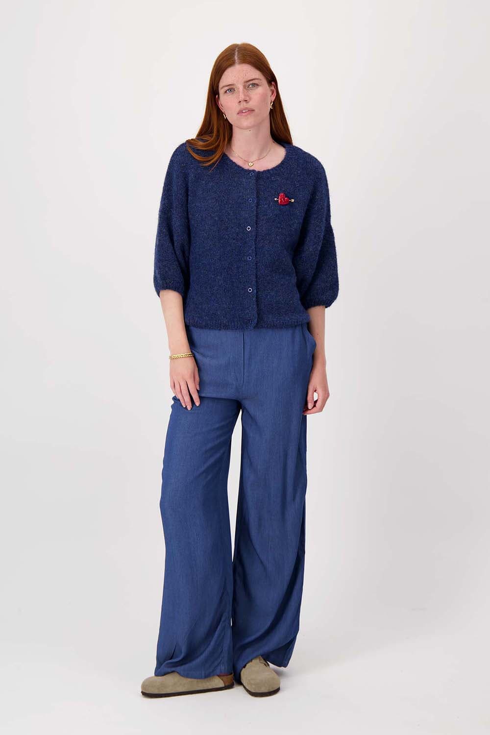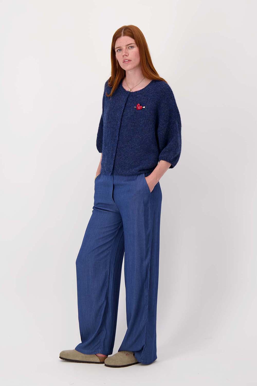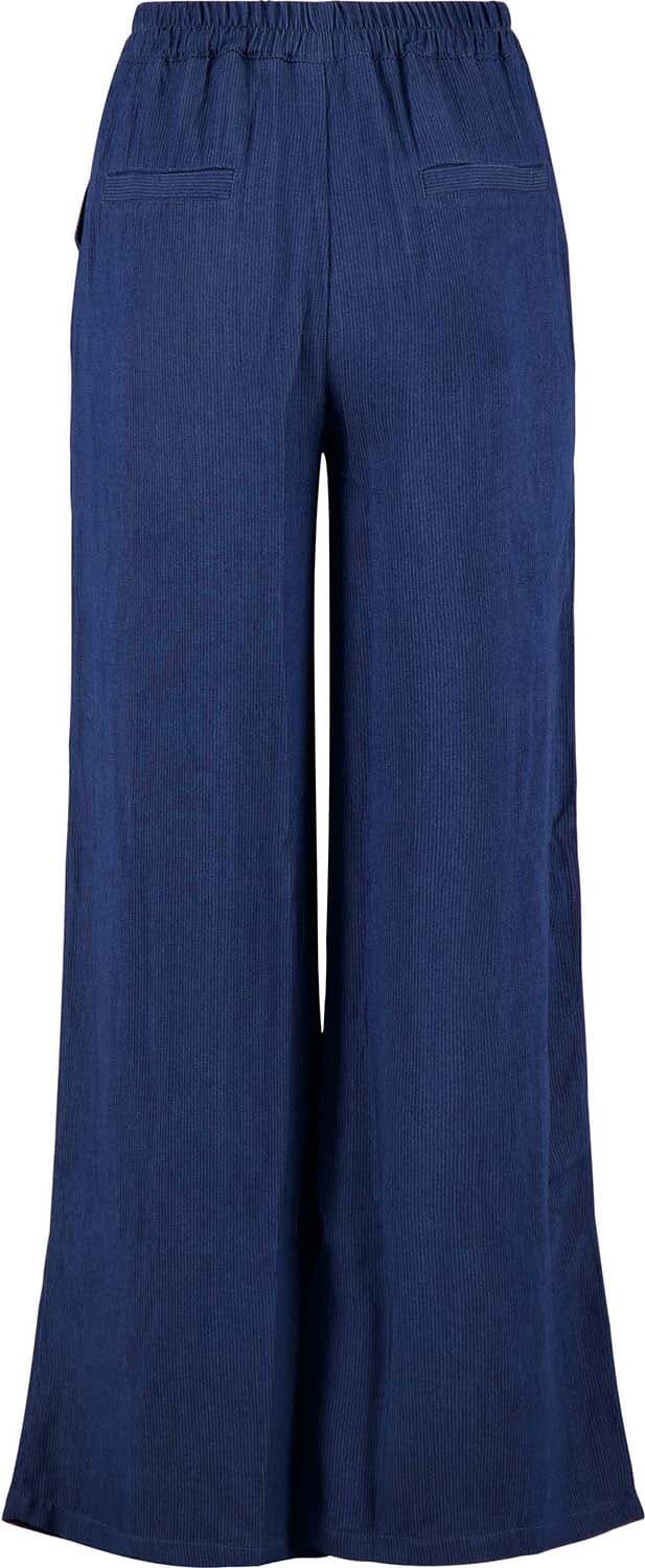 Broek van Zusss met normale taille en wijde pijpen, uitgevoerd in een effen, denimblauwe tint. De elastische tailleband zit prettig en geeft bewegingsvrijheid. Voorzakken maken het ontwerp praktisch. Draag met een fijngebreide trui en sneakers voor een casual, minimalistische stijl.