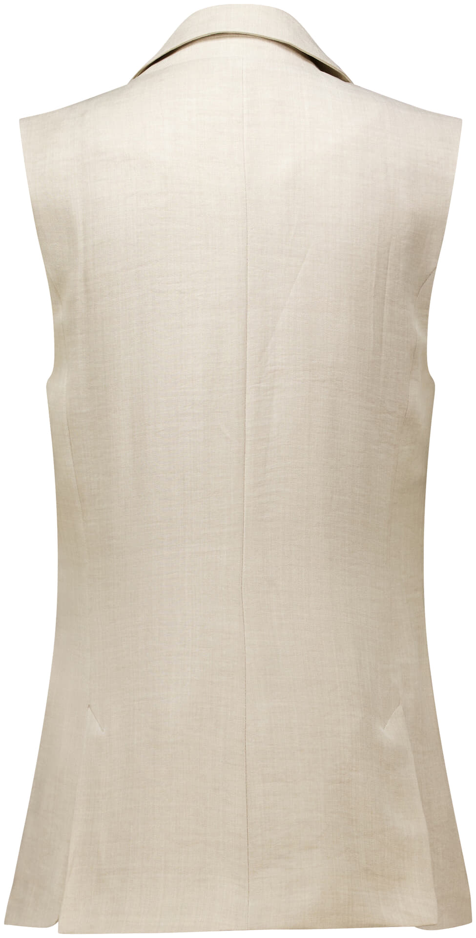 Damesgilet van Zusss met effen, lichtbeige stof en getailleerde pasvorm. De reverskraag en spreidkraag geven een nette uitstraling, terwijl de knoop en ritssluiting zorgen voor een stevige sluiting. Voorzien van zakken op de voorzijde, mouwloos en makkelijk te combineren.
