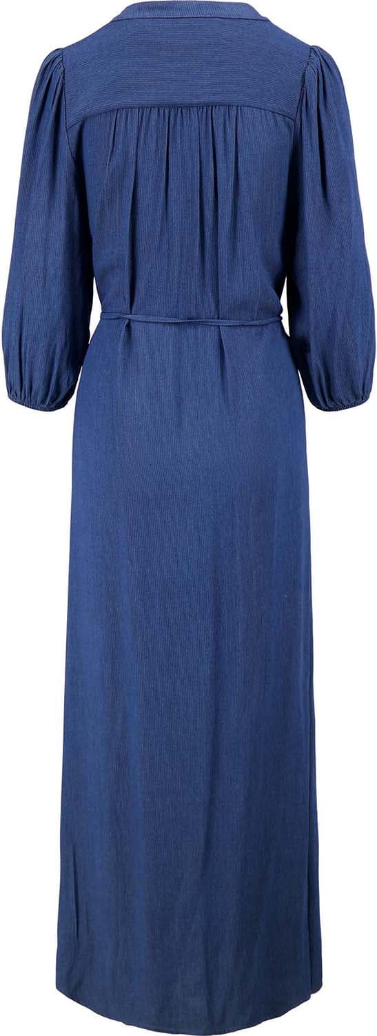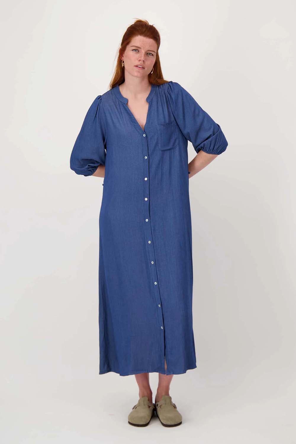 Jurk van Zusss met een casual, bescheiden uitstraling en midi lengte. De split hals en doorknoopsluiting geven een nette lijn. 3 kwart mouwen met elastische manchetten zitten comfortabel. Effen ontwerp met borstzak en strikceintuur voor verstelbare taille. Combineer met sneakers of enkellaarsjes.
