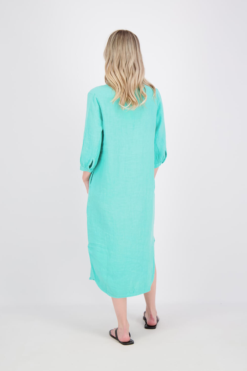 De lange linnen doorknoop jurk van Zusss is een casual dames jurk met met kortere mouwen en knoopsluiting aan de voorkant. De V-hals en knoopsluiting geven deze jurk een losse pasvorm. De effen kleur en 3 kwart mouw maken het een veelzijdig kledingstuk voor diverse gelegenheden.
