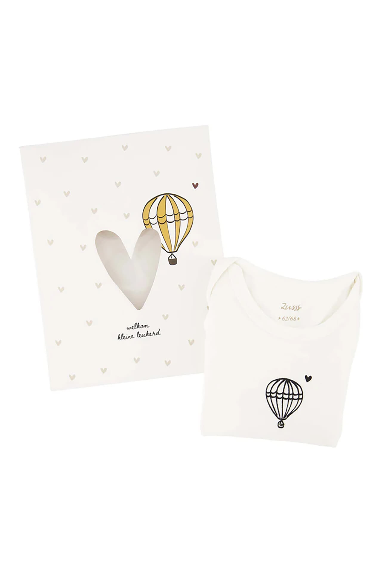 Rompertje in geschenkdoos welkom kleine leukerd van Zusss is een kadopakket met casual rompertje, ronde hals, lange mouwen en drukknoopsluiting. De witte stof heeft een grafische print met luchtballon en subtiele hartjes. Geleverd in een stijlvolle geschenkdoos met hartvenster, klaar om te geven.