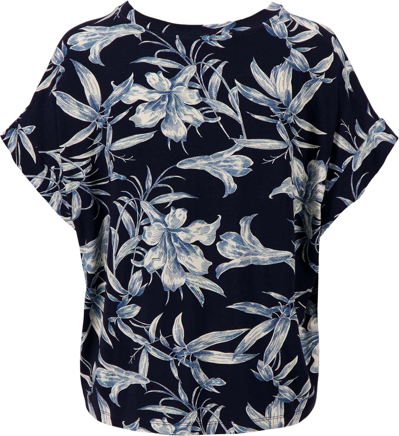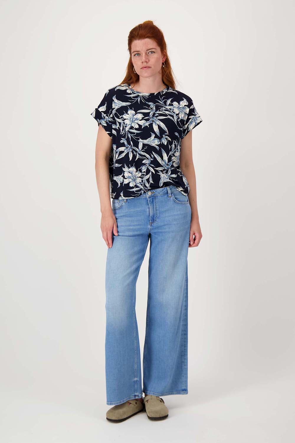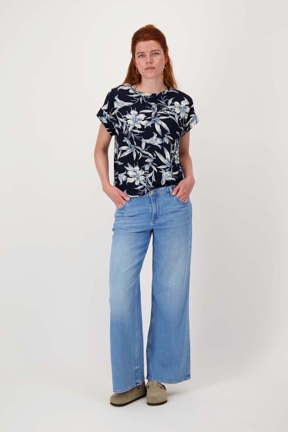 T-shirt van Zusss met bloemenpatroon, ronde hals en korte mouwen. De regular pasvorm valt recht en comfortabel. Donkerblauwe basis met lichtblauwe, witte bloemenprint geeft een rustige uitstraling. Afgewerkt met omgeslagen mouwboorden. Combineer met een jeans of een effen rok voor balans.