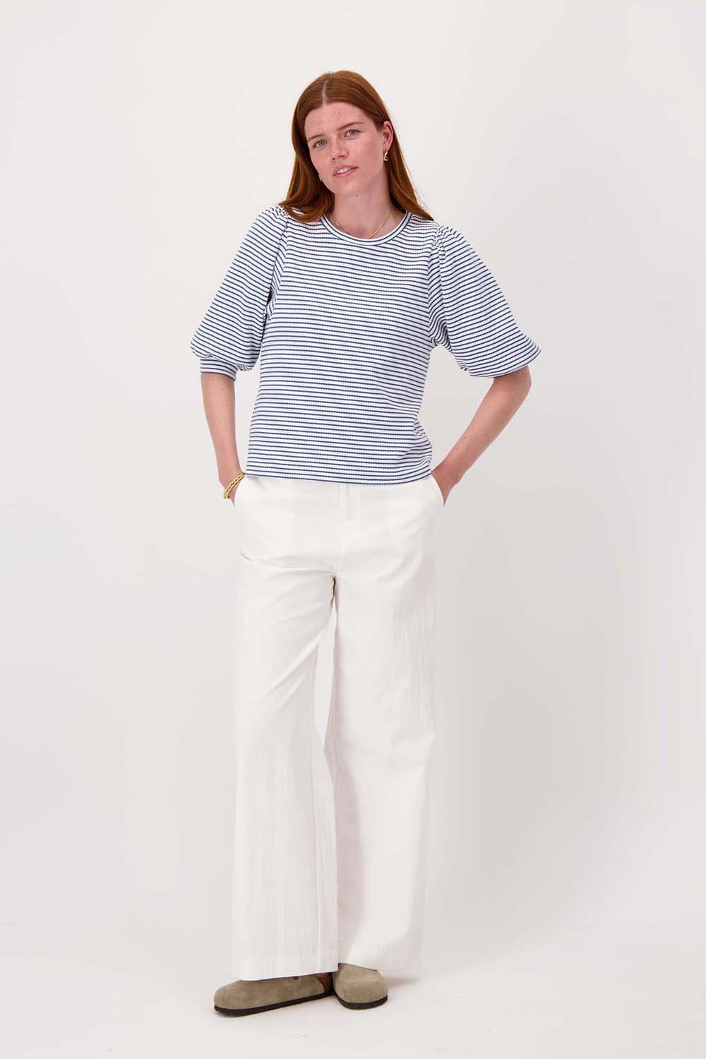 T-shirt van het t-shirtmerk Zusss met ronde hals, regular pasvorm en 3/4 mouwen. Het streeppatroon in blauw en wit geeft een casual uitstraling. De mouwen hebben een lichte pof en een smalle manchet. Combineer met een lichte broek en instappers voor een rustige set.