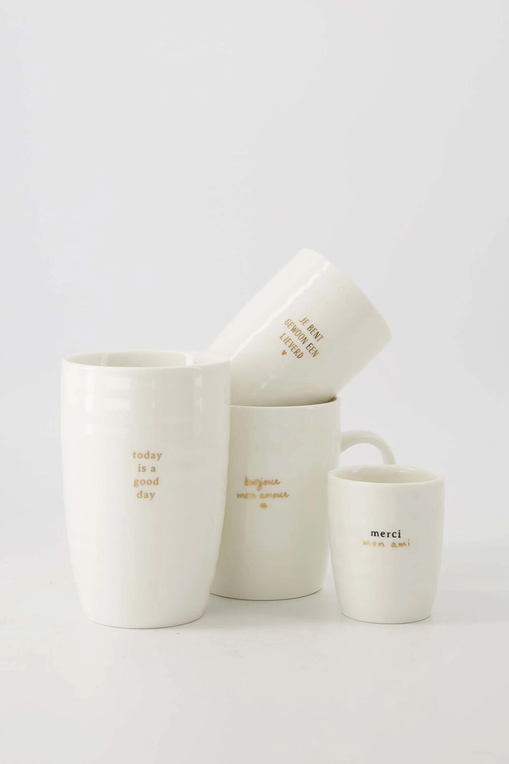 De theemok bonjour mon amour wit/goud van Zusss is een stijlvol serviesstuk. Met een effen design en subtiele gouden accenten, biedt deze mok een elegante uitstraling. Perfect voor dagelijks gebruik of speciale gelegenheden, het voegt charme toe aan elke tafelsetting.
